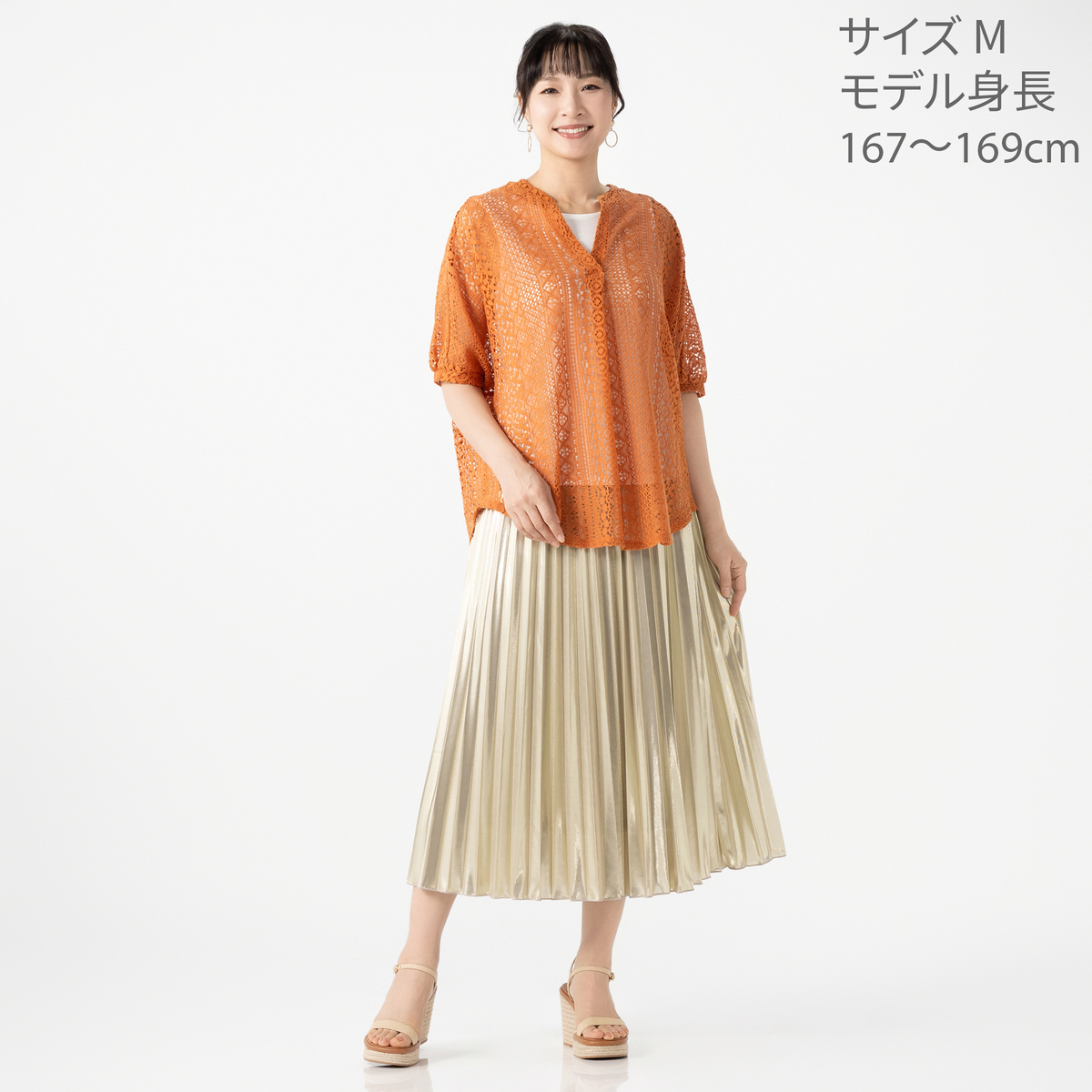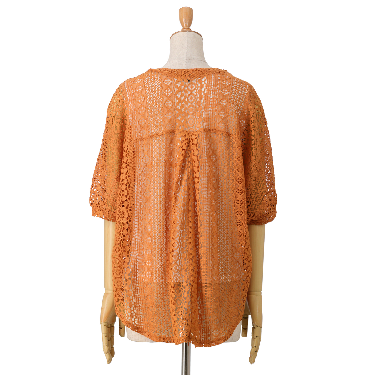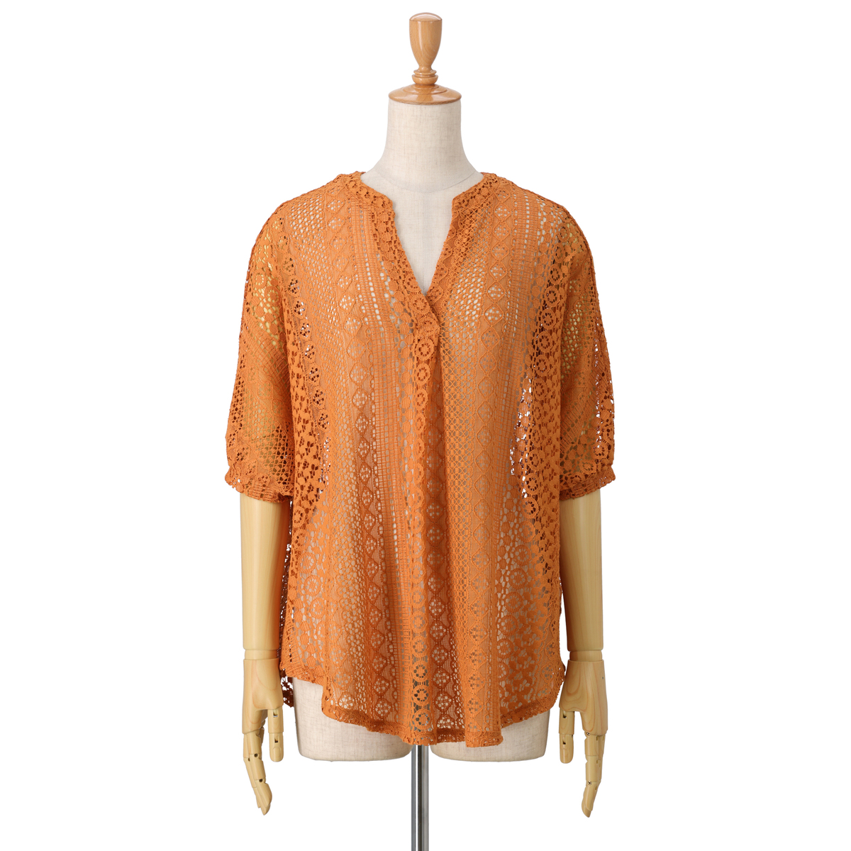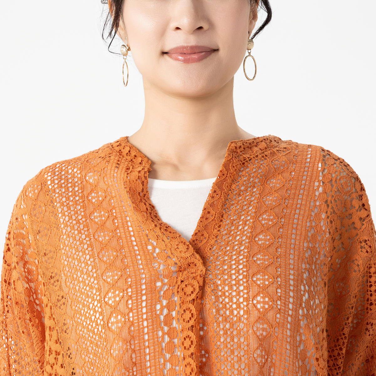 インナーのタンクトップはオフ色で、配色アウターのレース柄を引き立てるシンプルなデザイン。プルオーバーはドルマン袖のゆったりしたシルエット。深めのスキッパーで、お顔周りをシャープに見せます