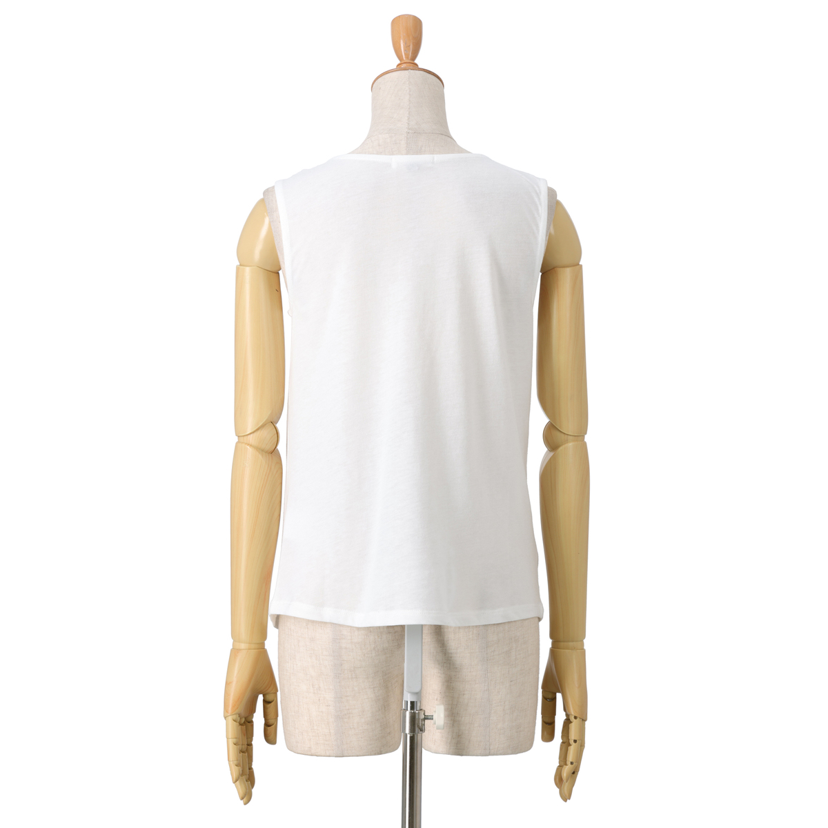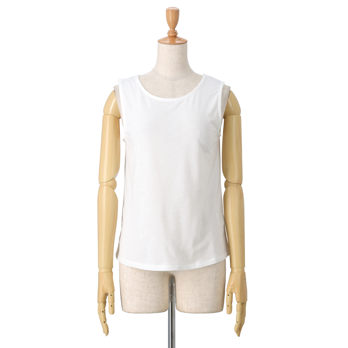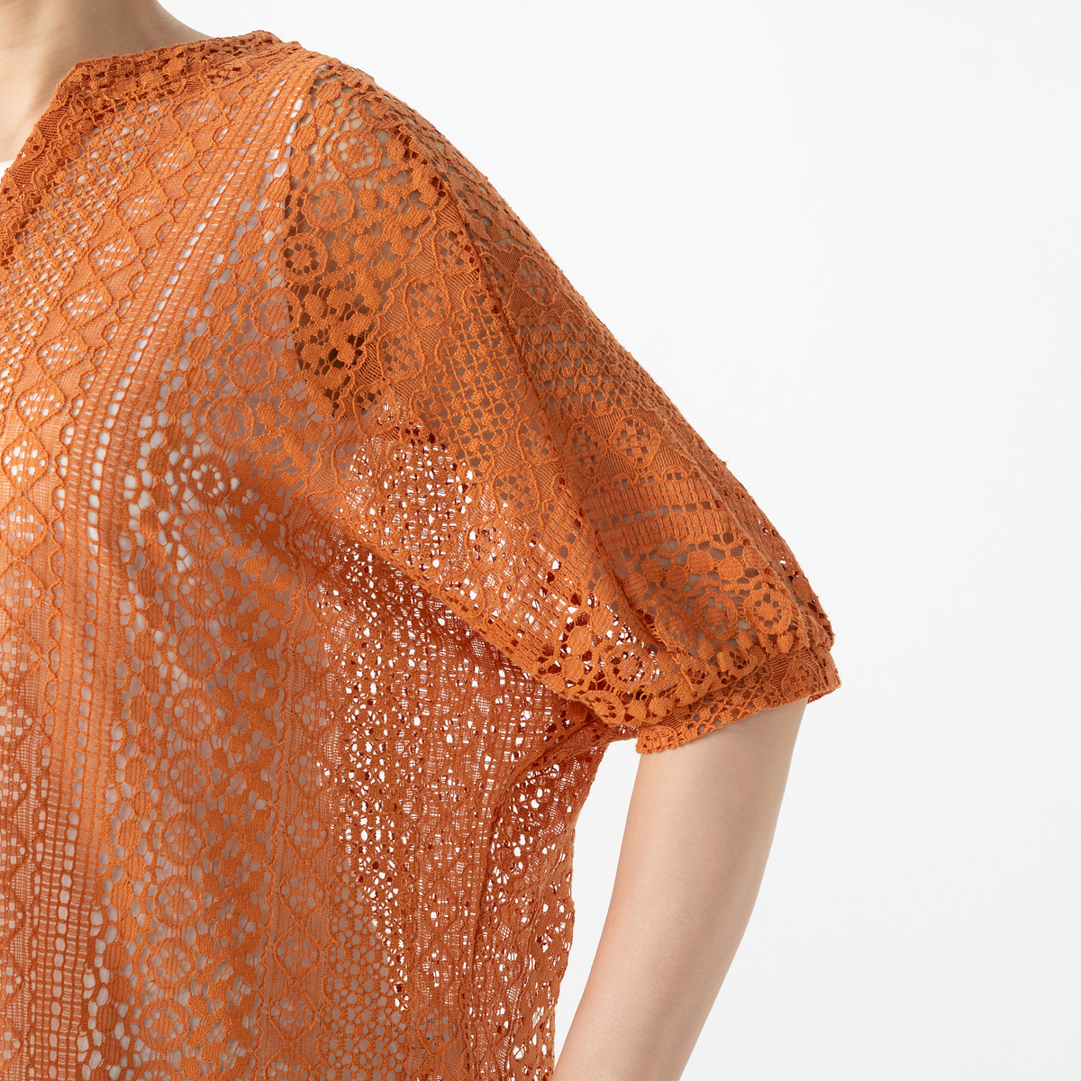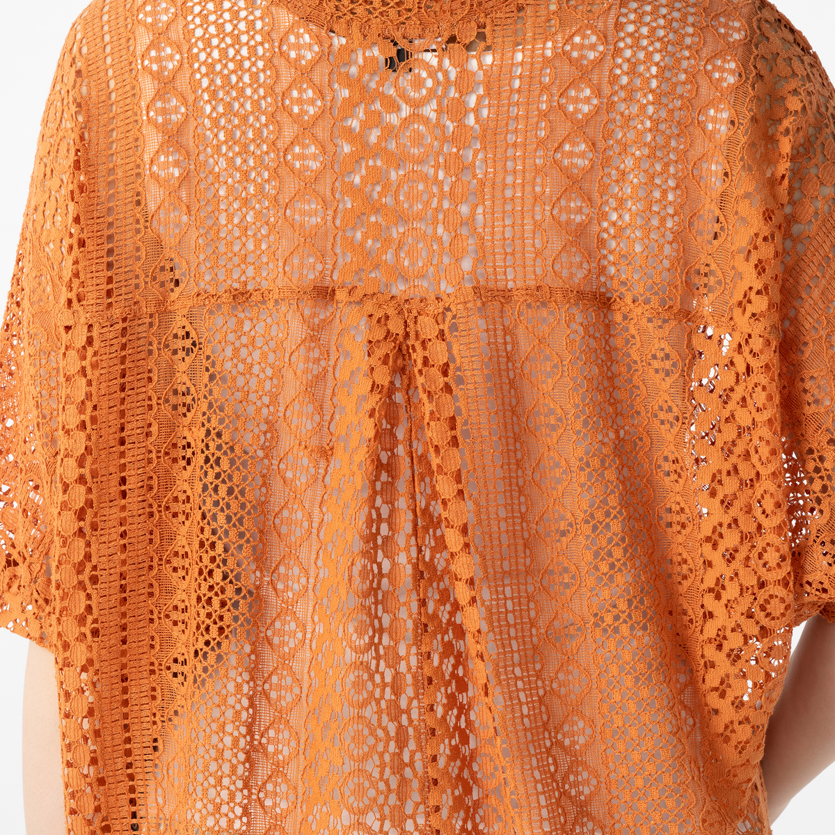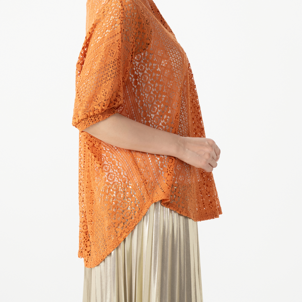 インナーのタンクトップはオフ色で、配色アウターのレース柄を引き立てるシンプルなデザイン。プルオーバーはドルマン袖のゆったりしたシルエット。深めのスキッパーで、お顔周りをシャープに見せます