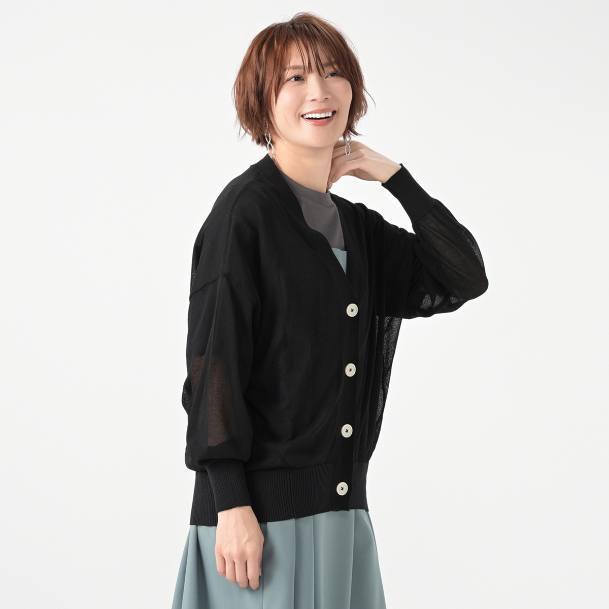 程よい透け感が特徴のカーディガン。ドロップショルダーのデザインでフェミニンな印象に仕上げました