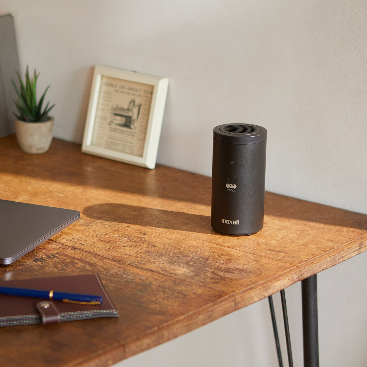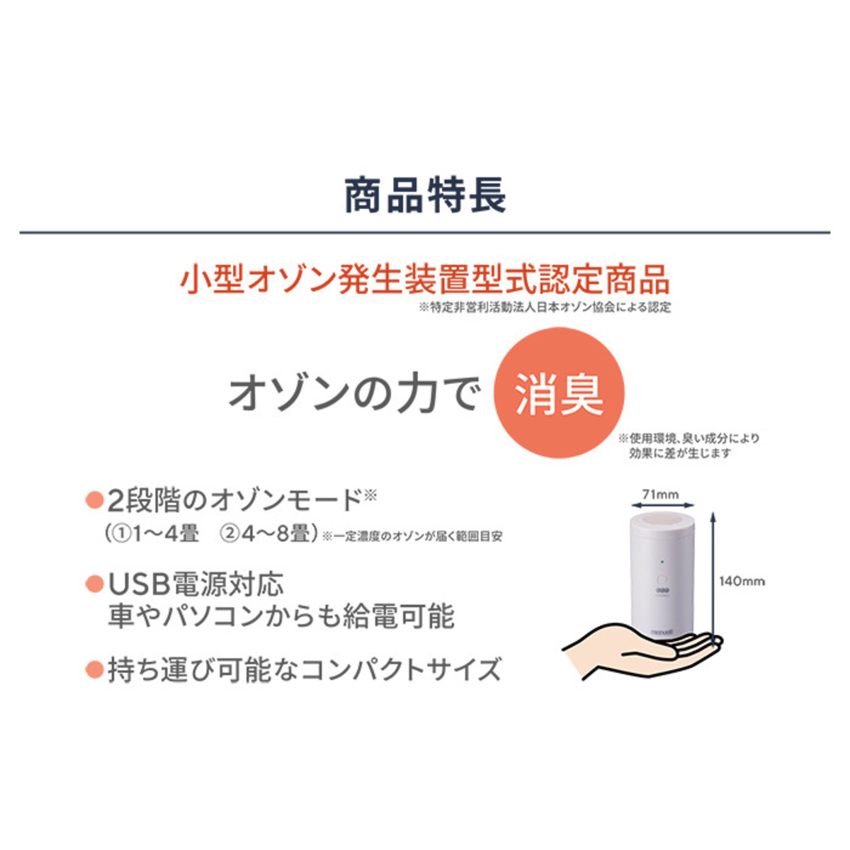 約200gの軽量設計で、持ち運びやすいコンパクトサイズのオゾン除菌消臭器。USB電源対応で、パソコンやモバイルバッテリーから給電可能です