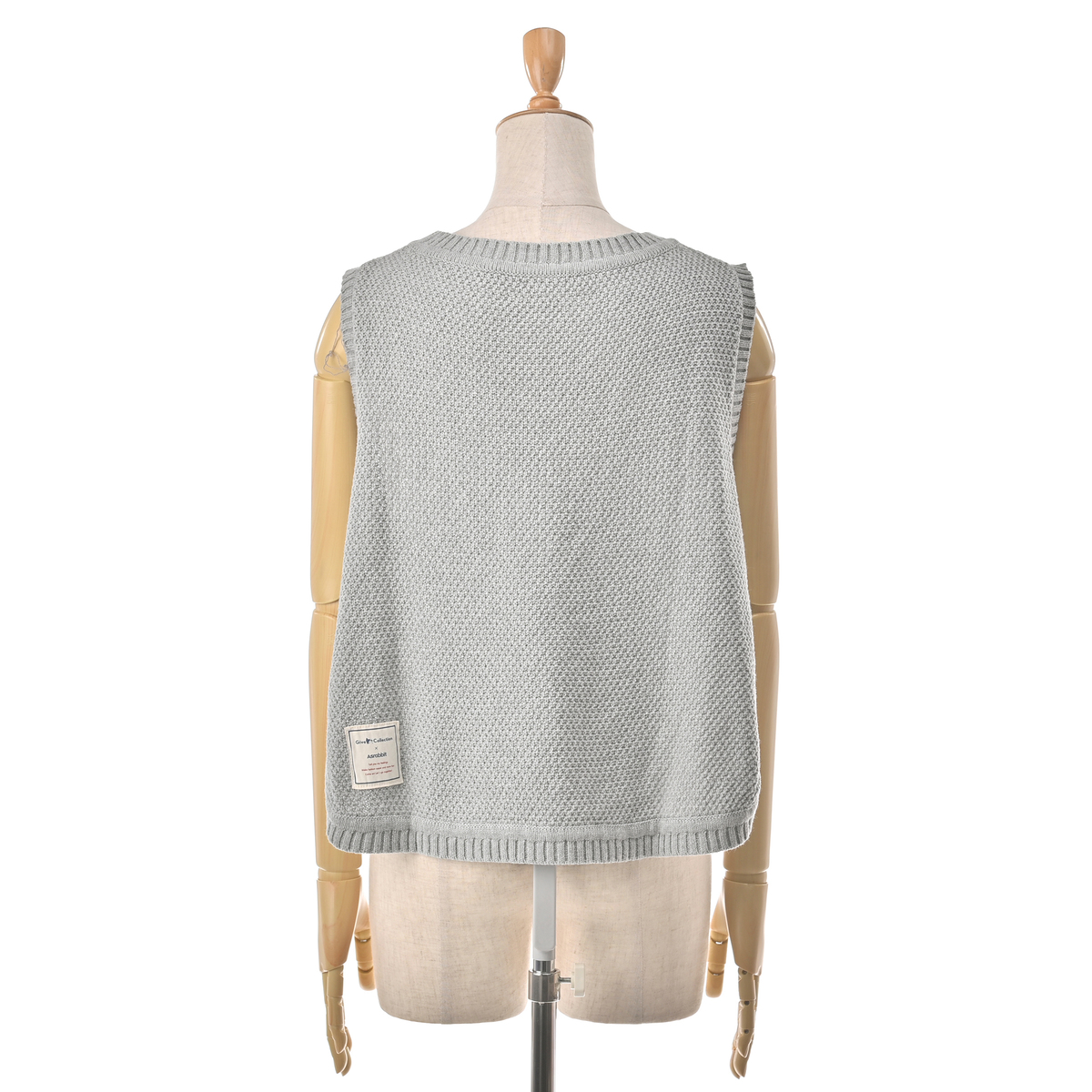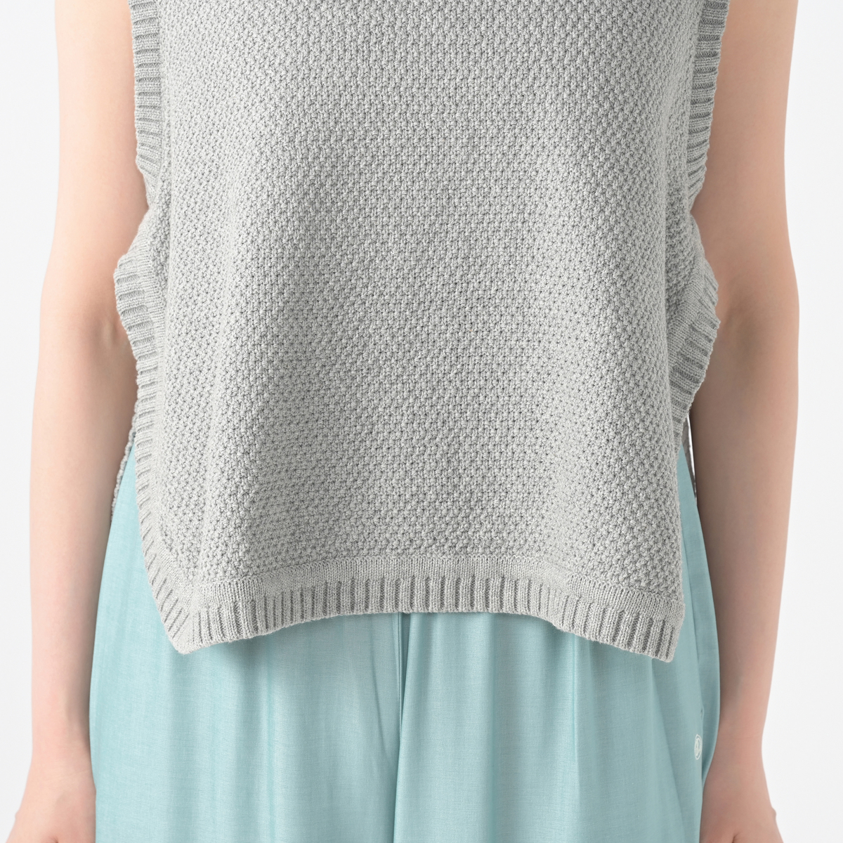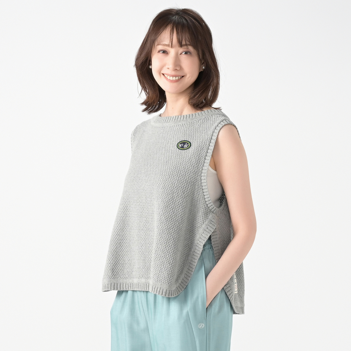 両サイドに入れた深いスリットがポイントのニットベスト。スリット角は丸みをつけて優しいシルエットに。深いスリットがあることでベストの下に合わせるアイテムのシルエットを選ばずにコーディネートできます