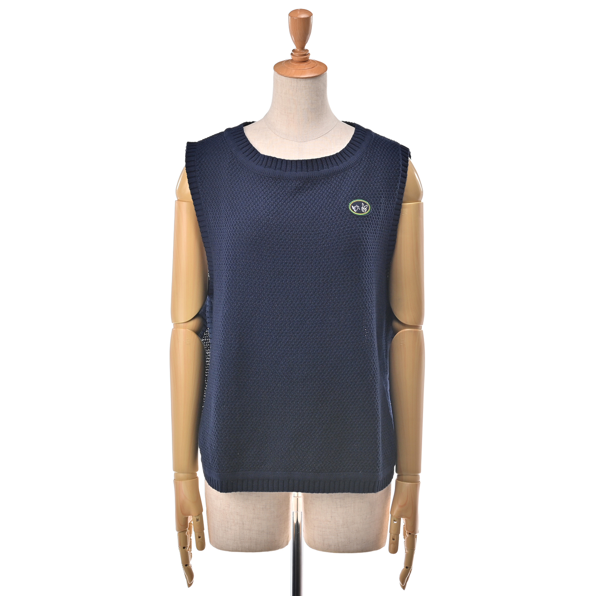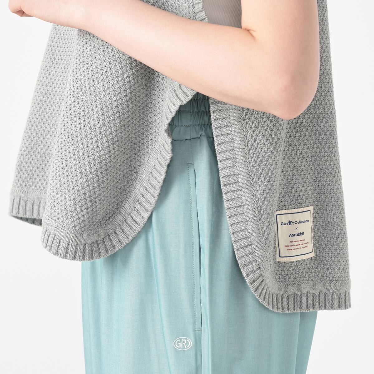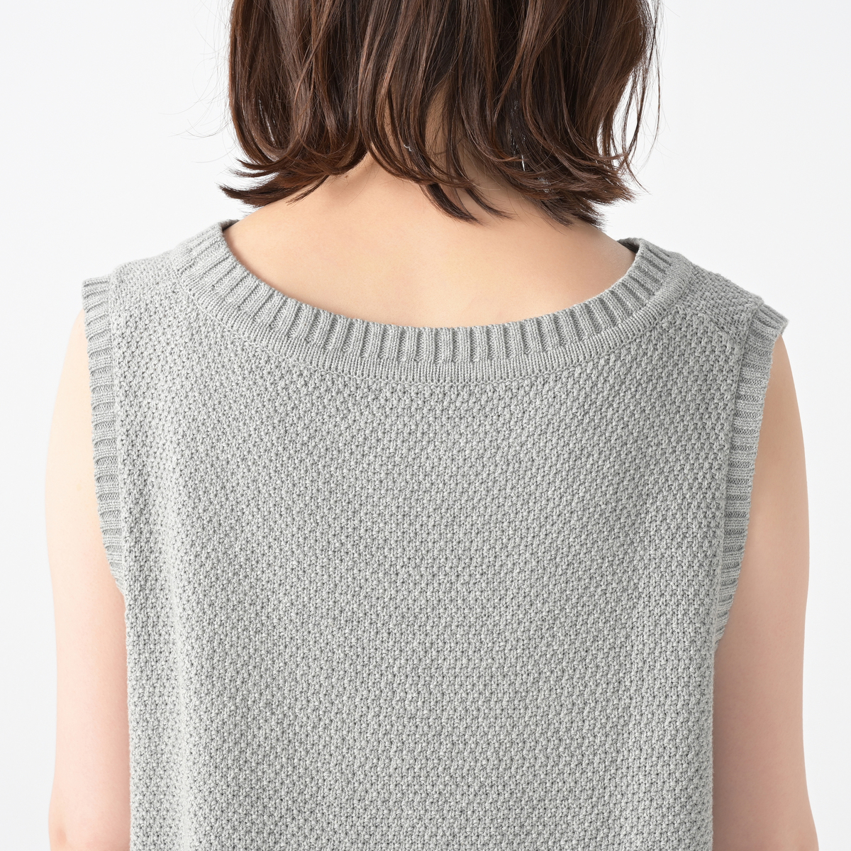 両サイドに入れた深いスリットがポイントのニットベスト。スリット角は丸みをつけて優しいシルエットに。深いスリットがあることでベストの下に合わせるアイテムのシルエットを選ばずにコーディネートできます