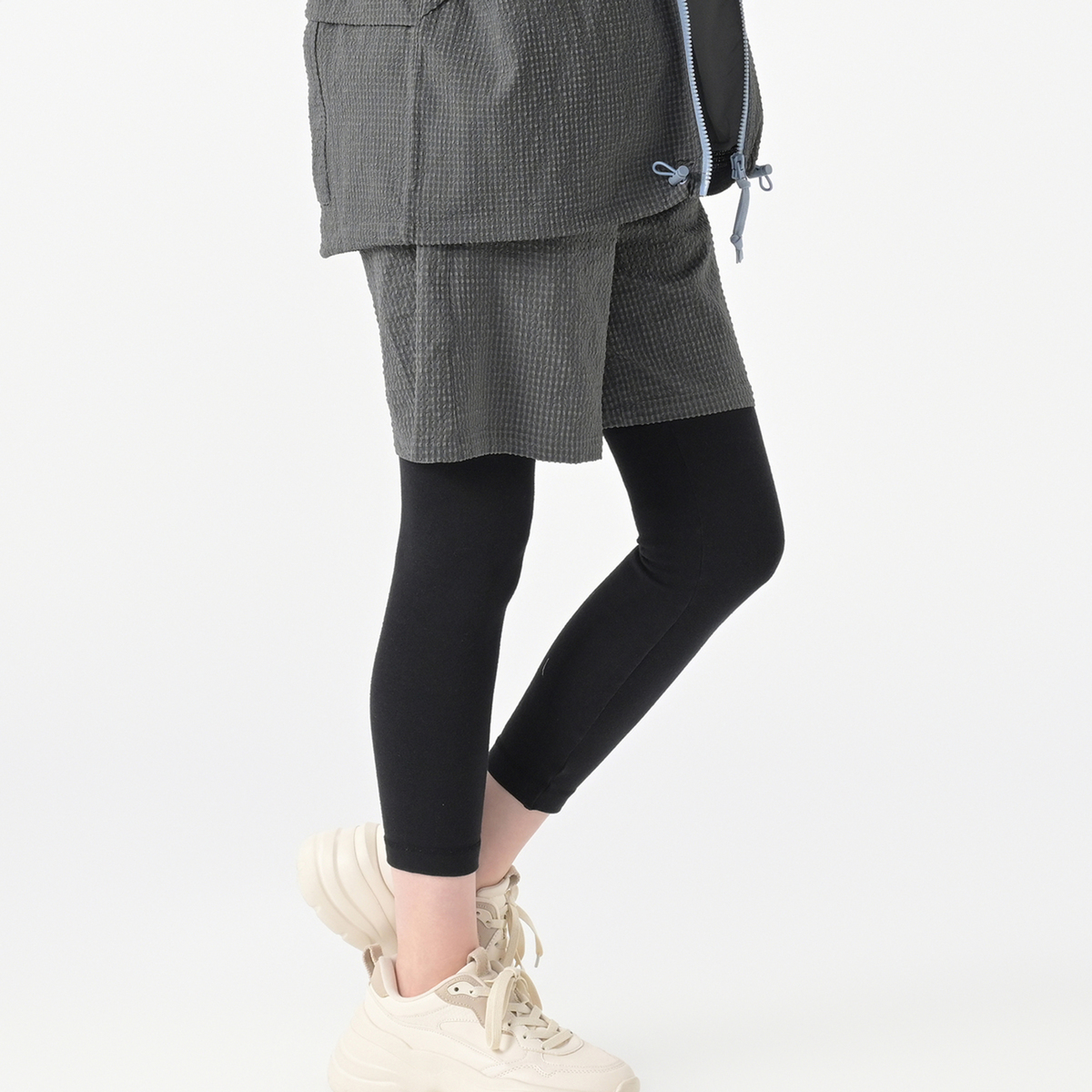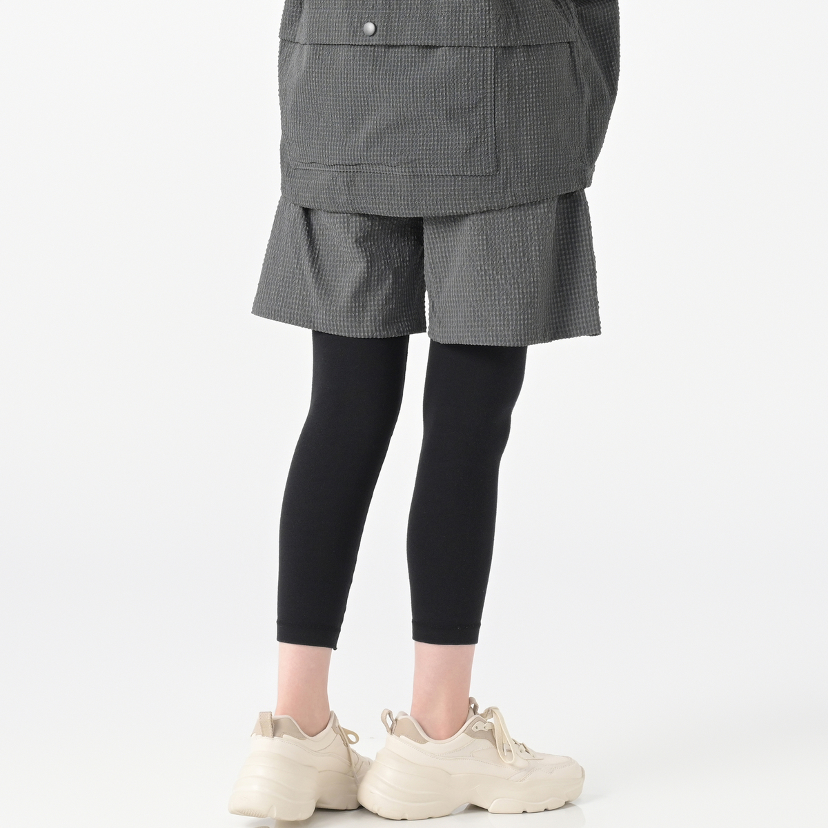 膝ぐらいの丈感で、裾にかけて広がるレディーライクなシルエット。着脱楽チンな総ゴム仕様で、ウエスト裏にはドロスト付きです。前脇には斜めポケット、ヒップには大きめなパッチポケット付き。生地には吸水速乾、接触冷感、UVカットの機能性もあり、暑い季節に様々なシーンで活躍しそうです