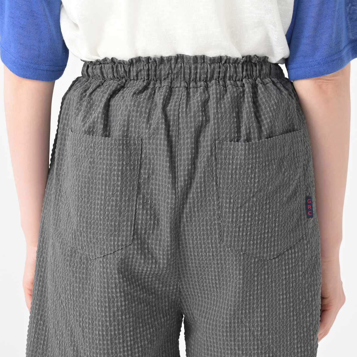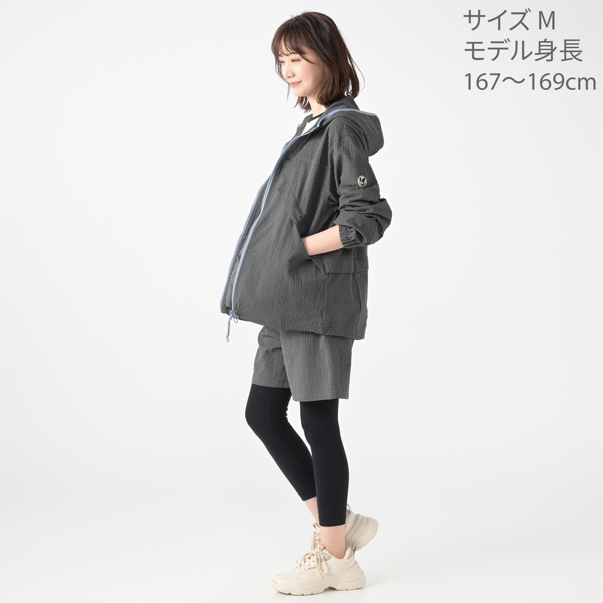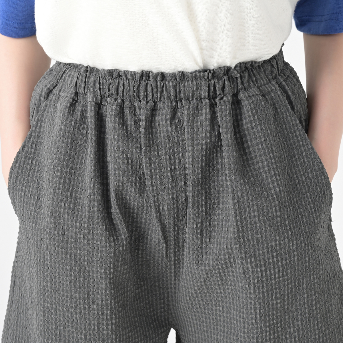 本体表面に凹凸のあるポリエステルのサッカー素材を使用。縞状の独特なシボが特徴で、ふんわりとした優しい肌触りと清涼感があり、凹凸により肌と生地の間に空間ができ肌に触れる部分が少なく、サラリとした着心地。ナチュラルなストレッチがあり、洗濯後や着用時もシワが気になりにくく、アイロン不要です