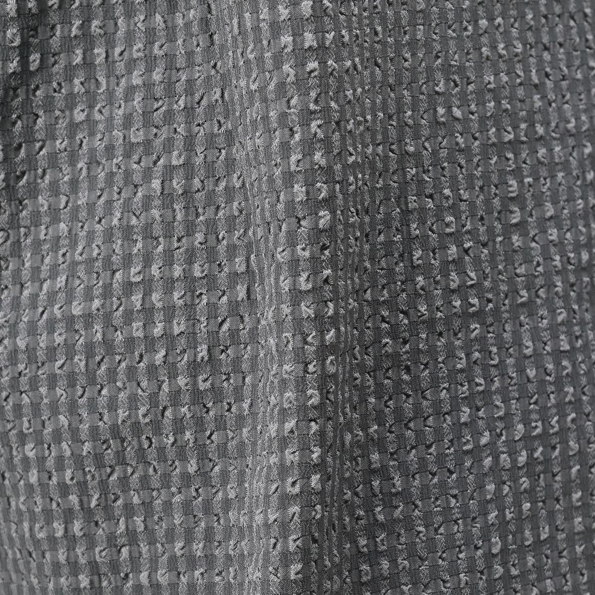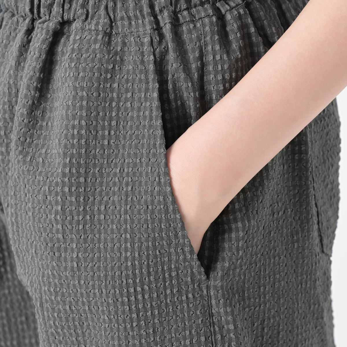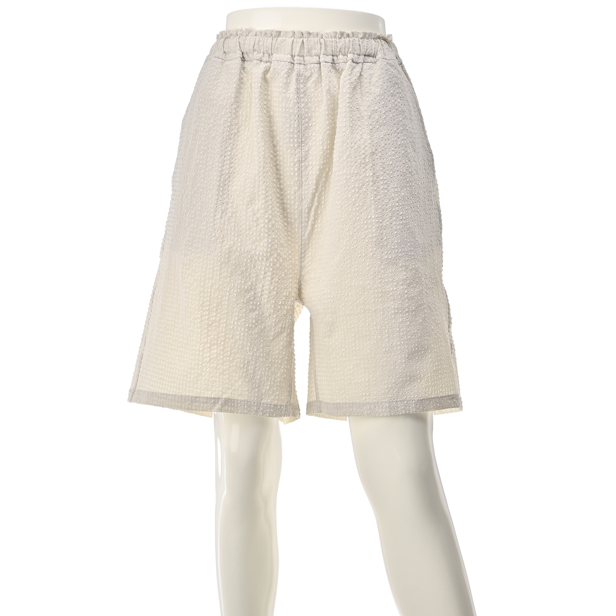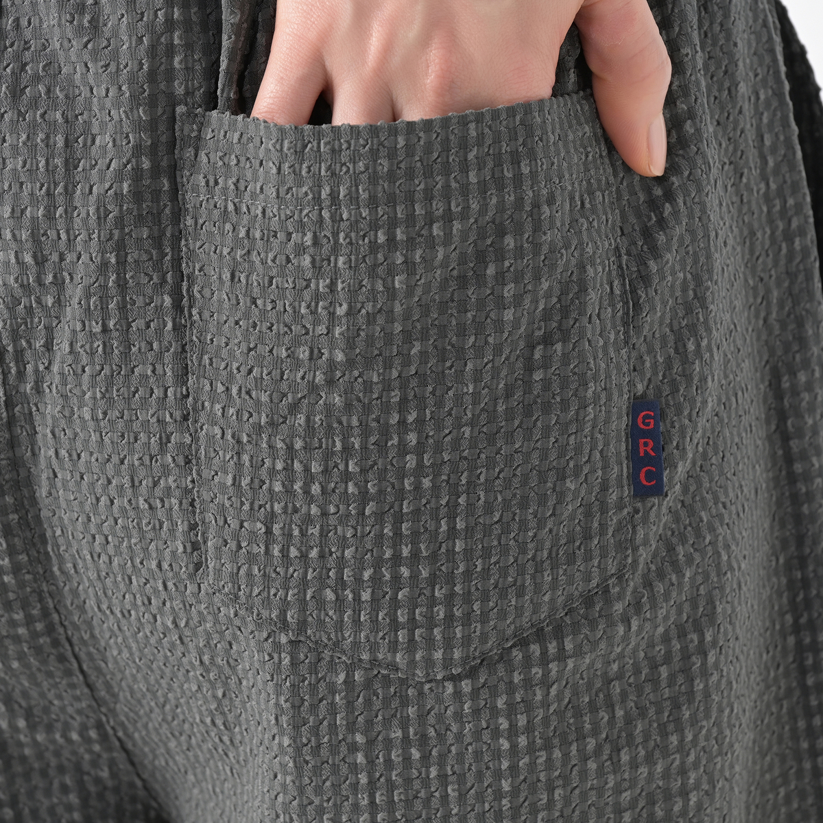 本体表面に凹凸のあるポリエステルのサッカー素材を使用。縞状の独特なシボが特徴で、ふんわりとした優しい肌触りと清涼感があり、凹凸により肌と生地の間に空間ができ肌に触れる部分が少なく、サラリとした着心地。ナチュラルなストレッチがあり、洗濯後や着用時もシワが気になりにくく、アイロン不要です
