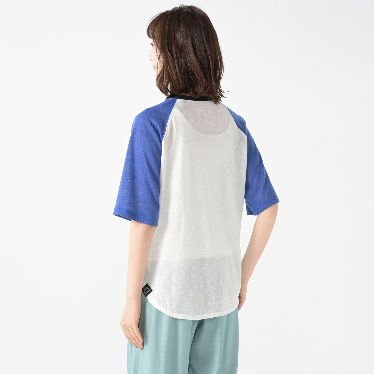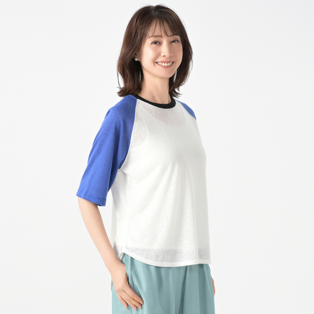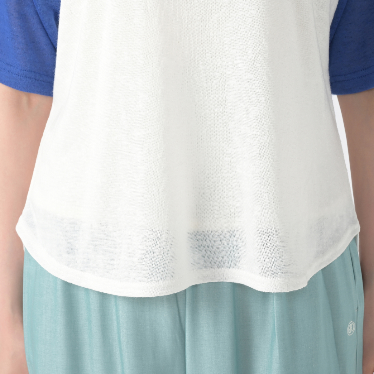 肘が隠れるぐらいの5〜6分袖のラグランスリーブで、裾は前が短め、後ろを長めにしたラウンドヘムに。1枚では透け感があるので、タンクトップなどのインナーに重ねたレイヤードコーデでお楽しみください