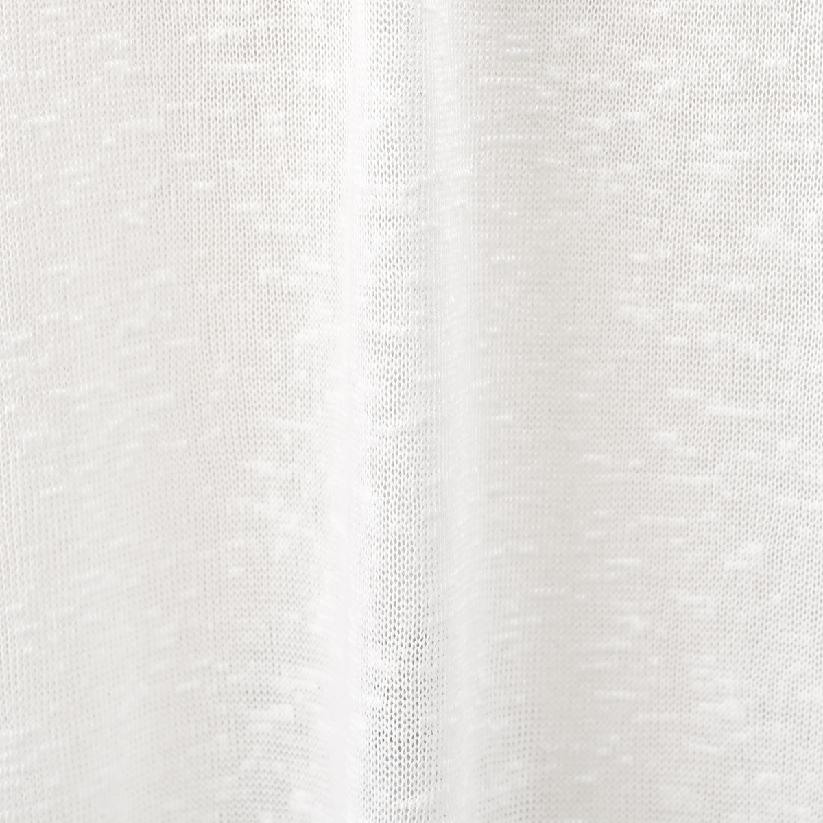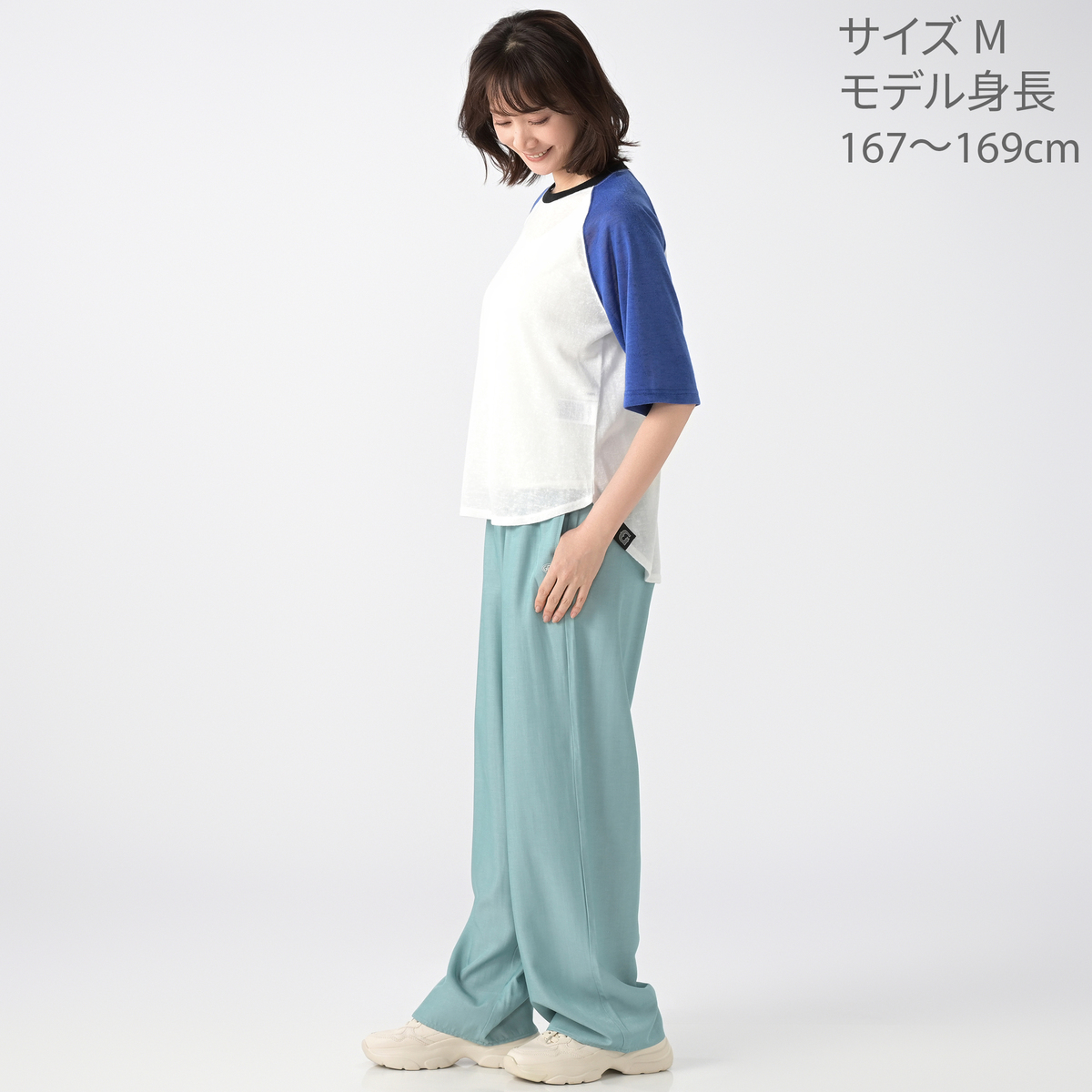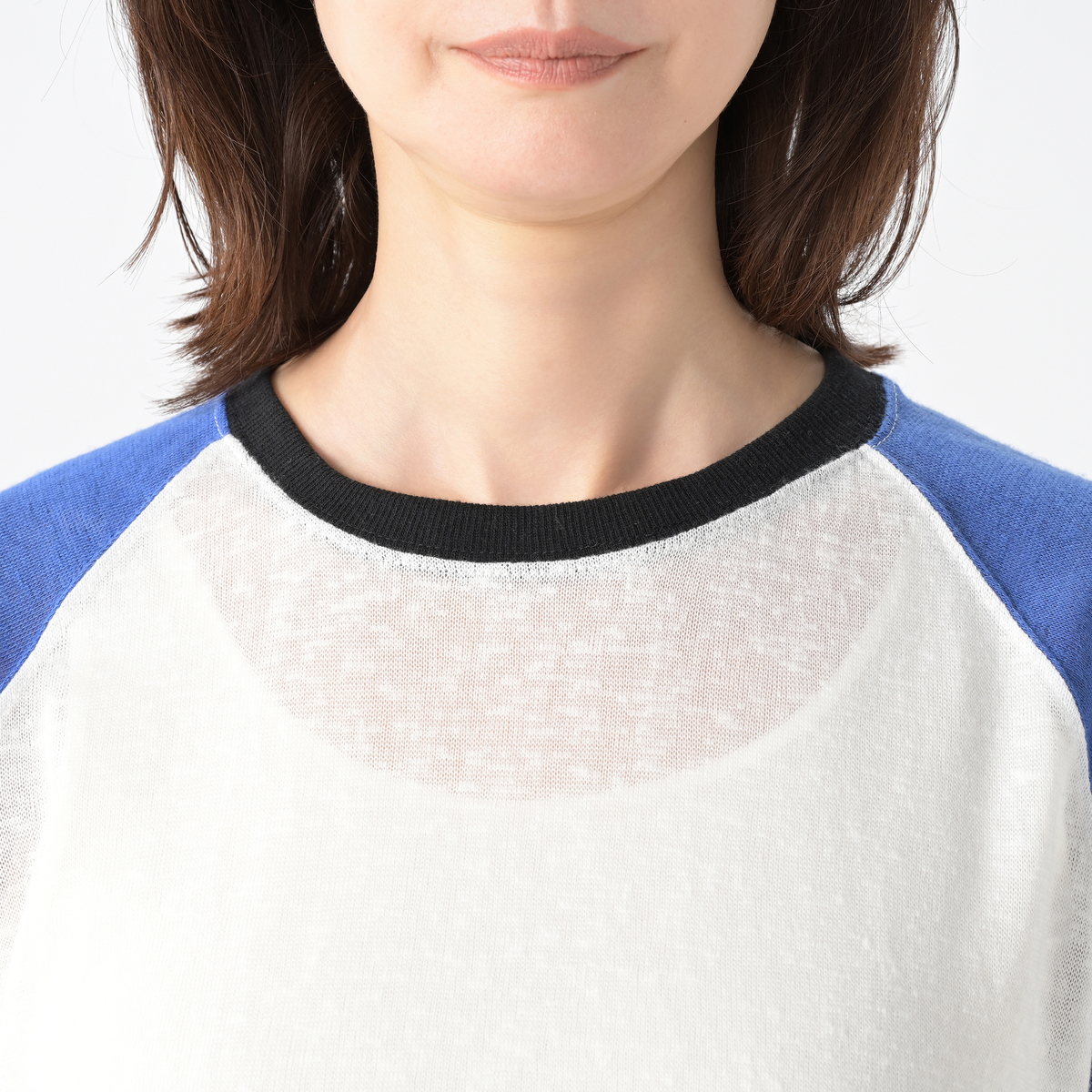 肘が隠れるぐらいの5〜6分袖のラグランスリーブで、裾は前が短め、後ろを長めにしたラウンドヘムに。1枚では透け感があるので、タンクトップなどのインナーに重ねたレイヤードコーデでお楽しみください