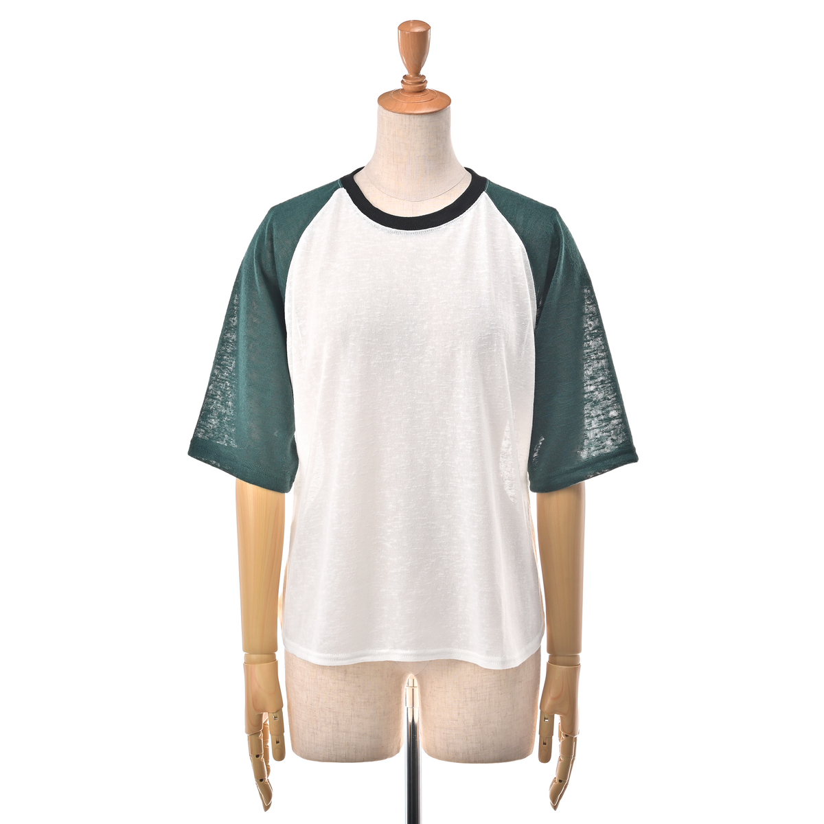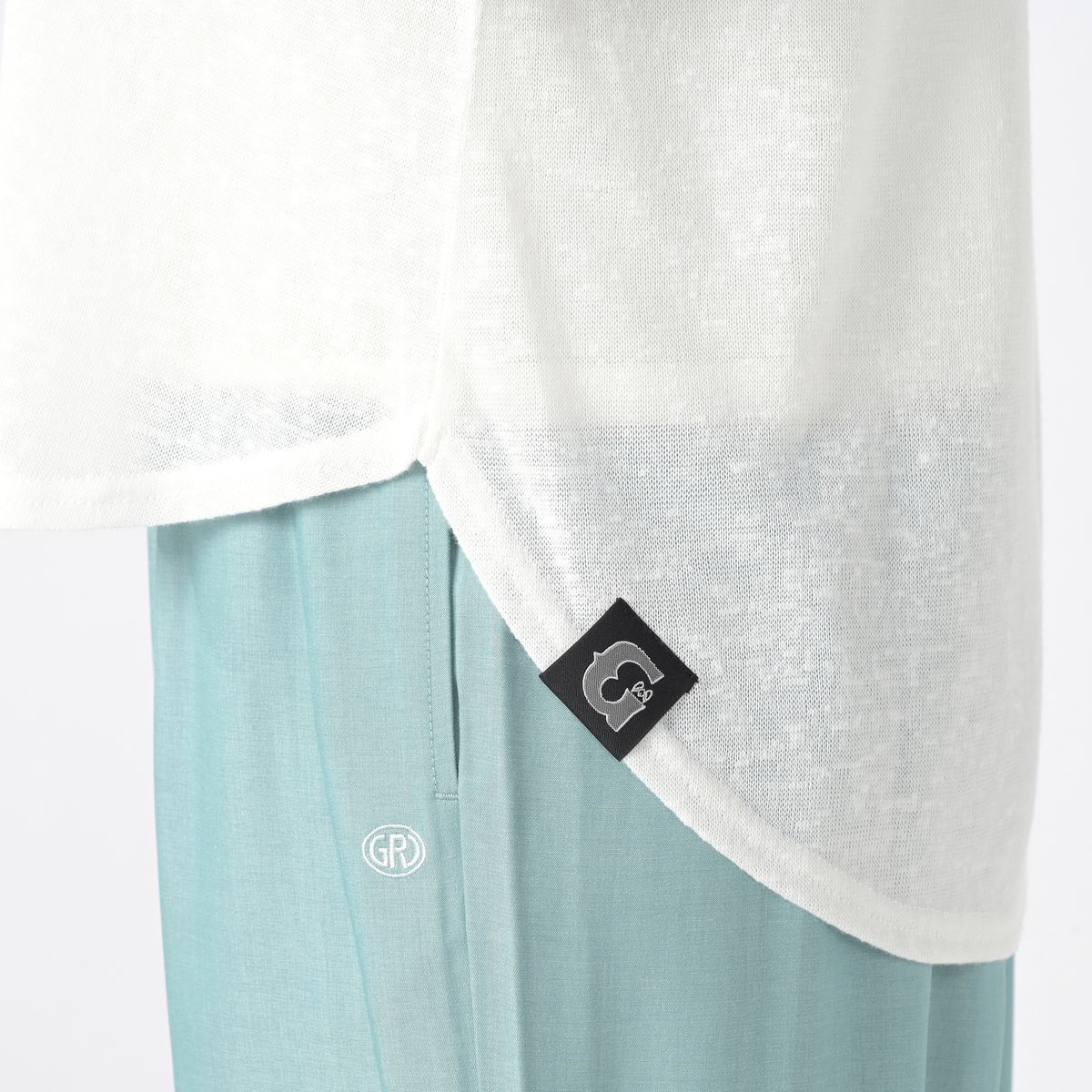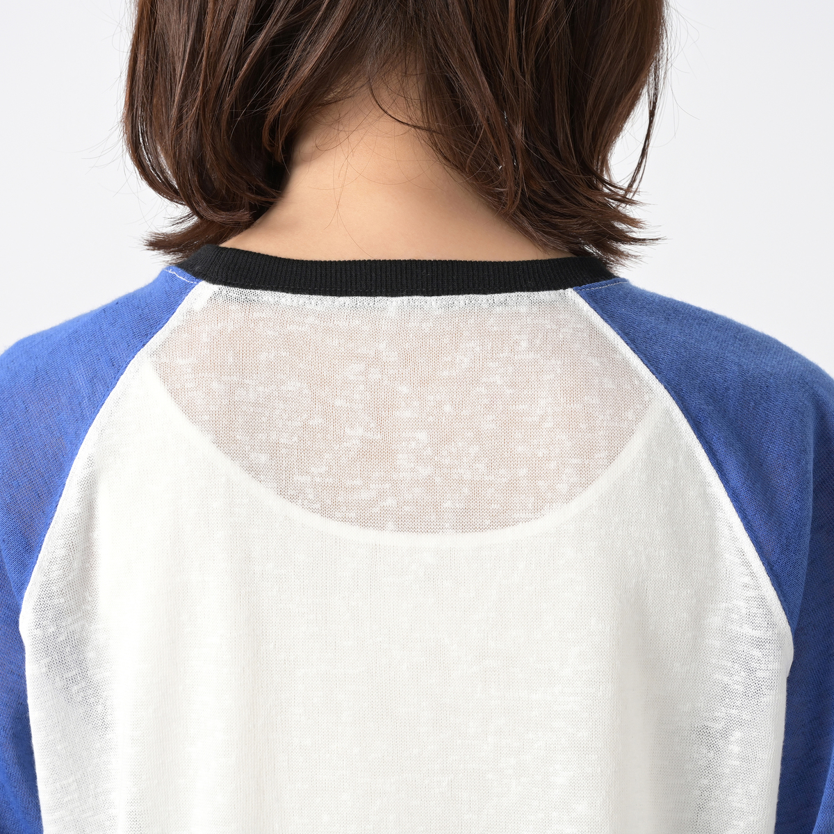 身頃はホワイト、袖とえりをそれぞれダークカラーのトリプル配色にしたカラーブロックプルオーバー。シアースラブ天竺生地を使用しています。カジュアルなムラ感と、透けすぎない生地で、えりは伸縮性のあるリブを配色使い。後ろ裾にはGをモチーフにしたオリジナルピスネーム付きです