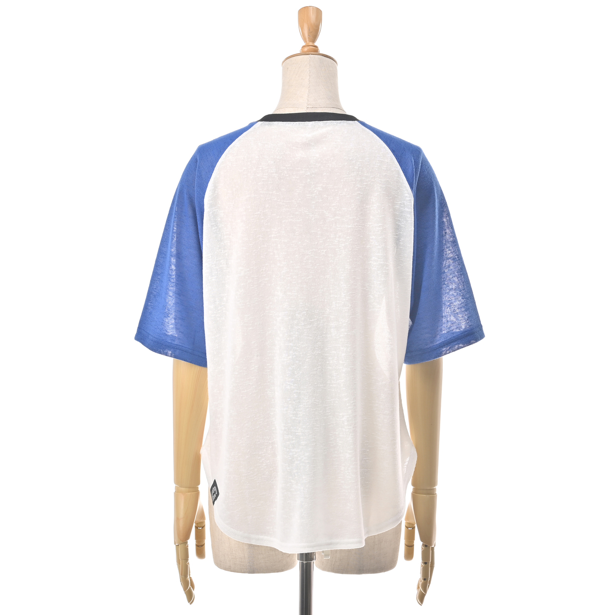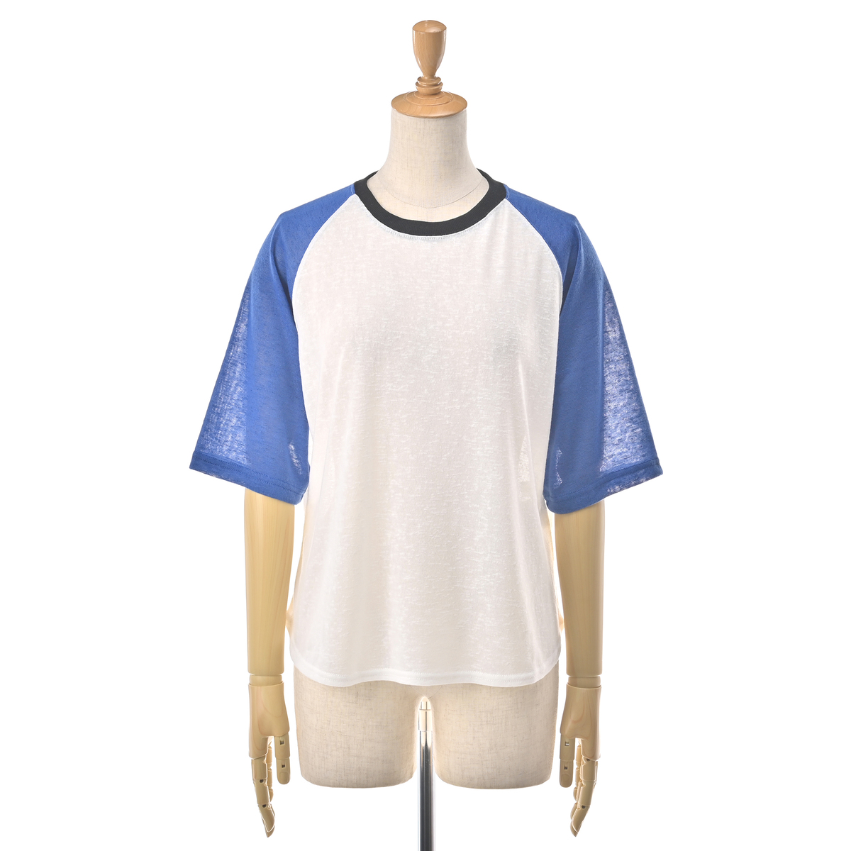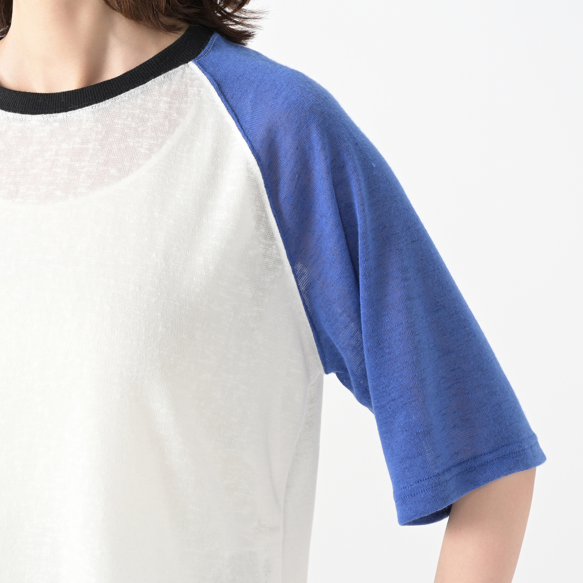 身頃はホワイト、袖とえりをそれぞれダークカラーのトリプル配色にしたカラーブロックプルオーバー。シアースラブ天竺生地を使用しています。カジュアルなムラ感と、透けすぎない生地で、えりは伸縮性のあるリブを配色使い。後ろ裾にはGをモチーフにしたオリジナルピスネーム付きです