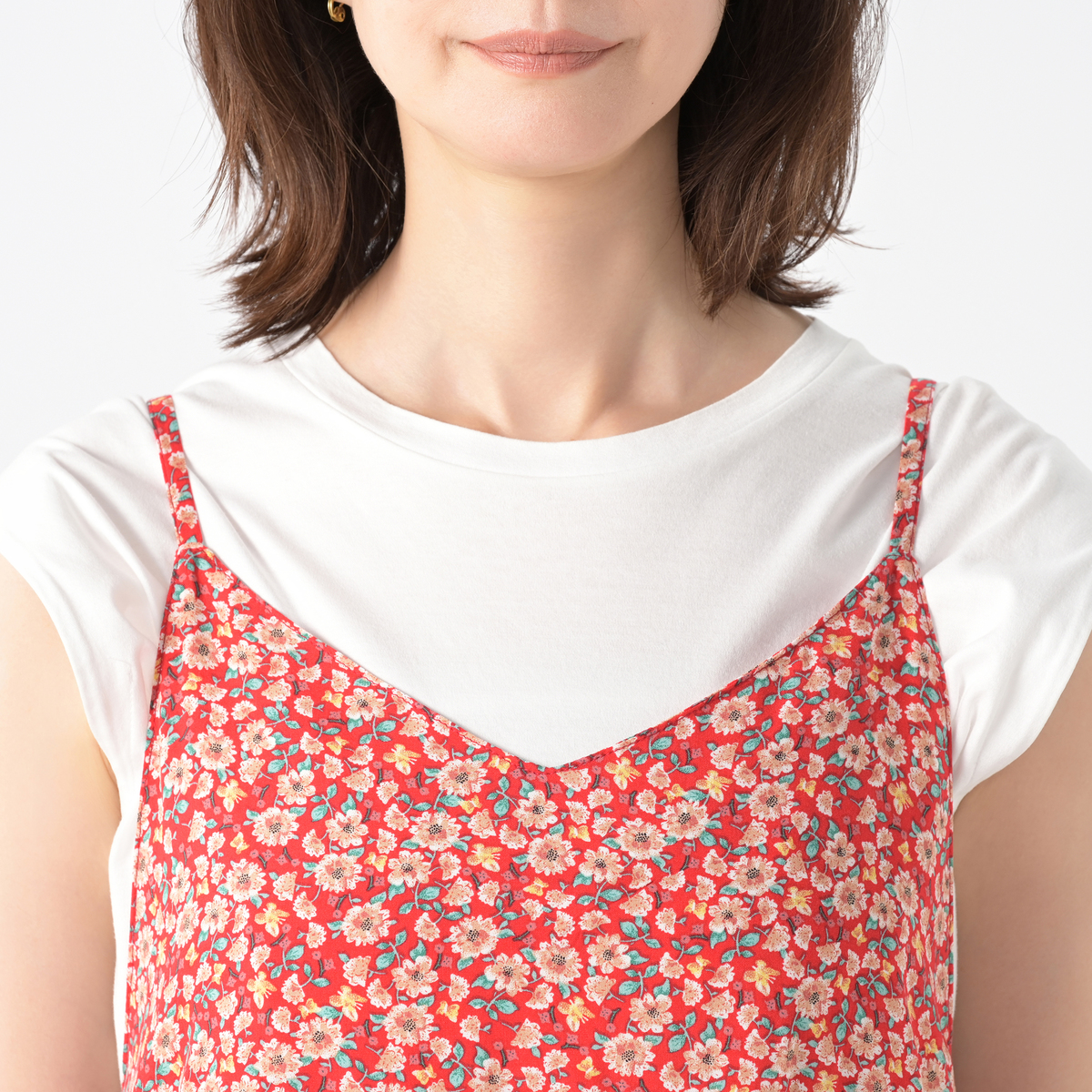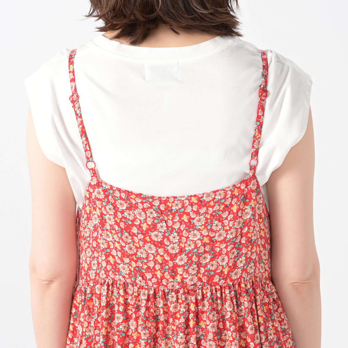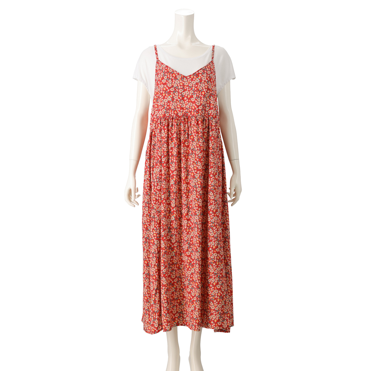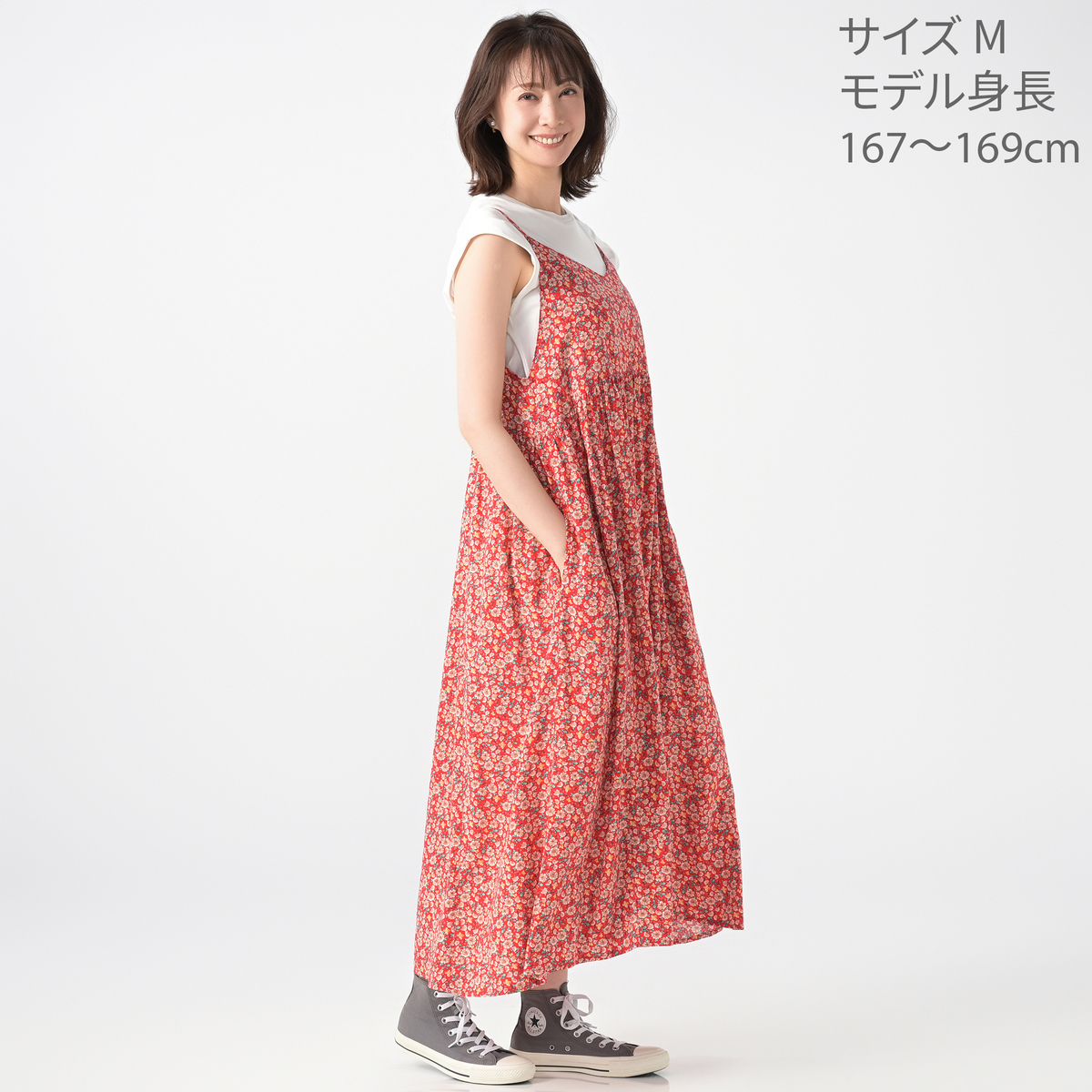 ふんわりフレアシルエットのロング丈花柄キャミワンピース。スカート部分に程よくギャザーを入れました。肩紐は調整可能で、小柄な方から身長が高めな方まで着用しやすいデザインです
