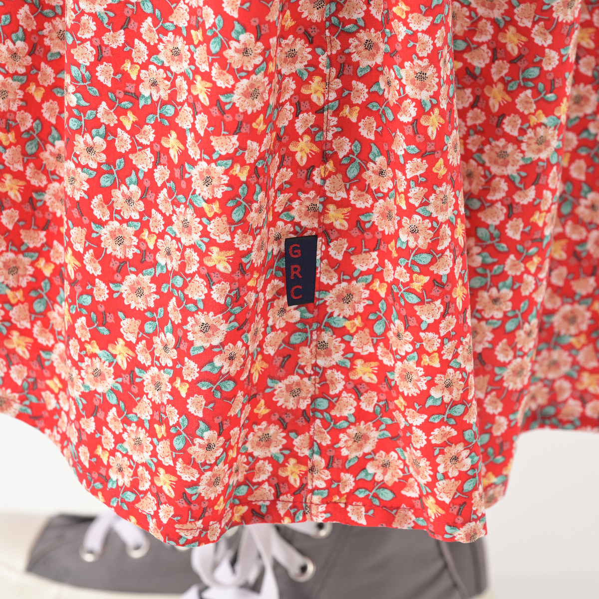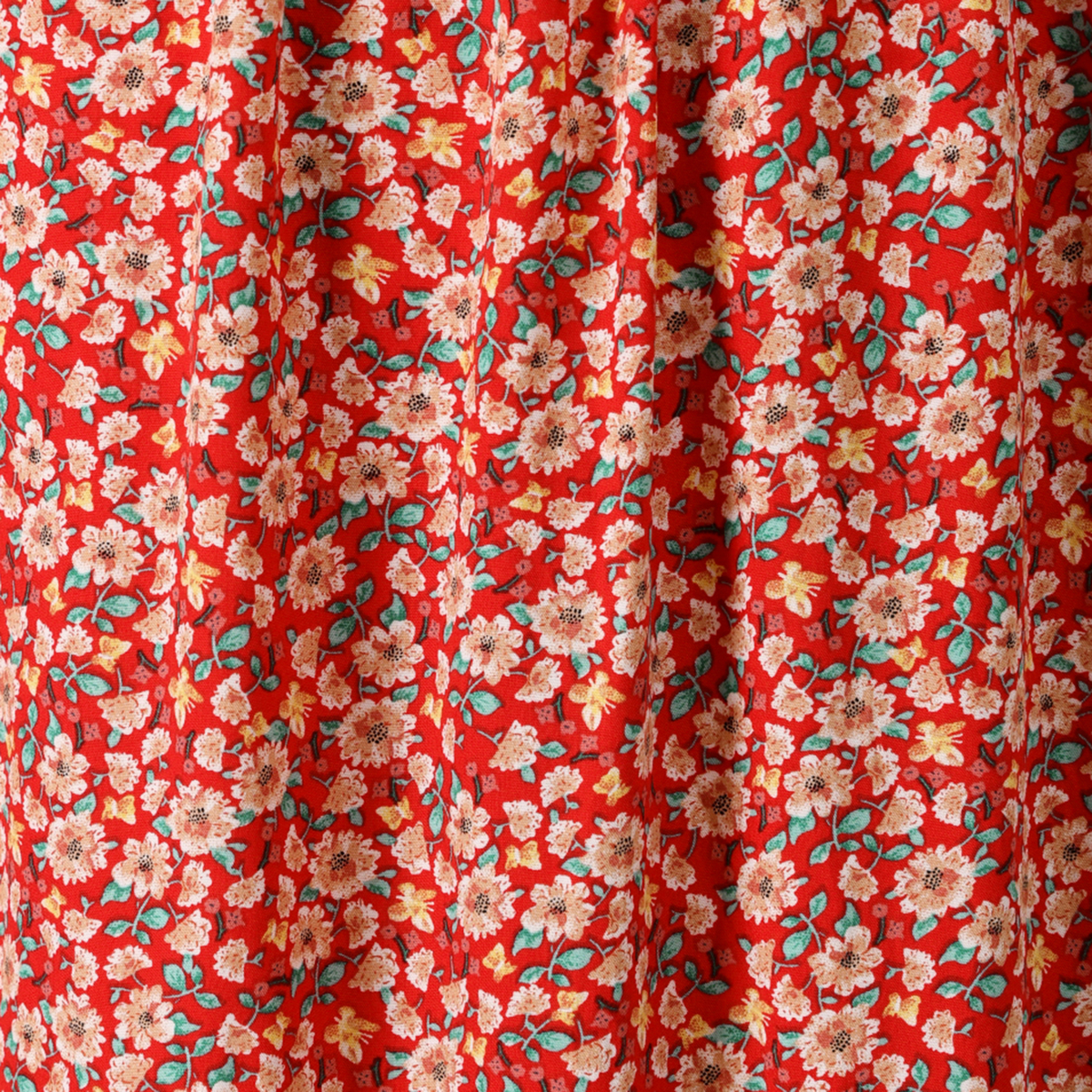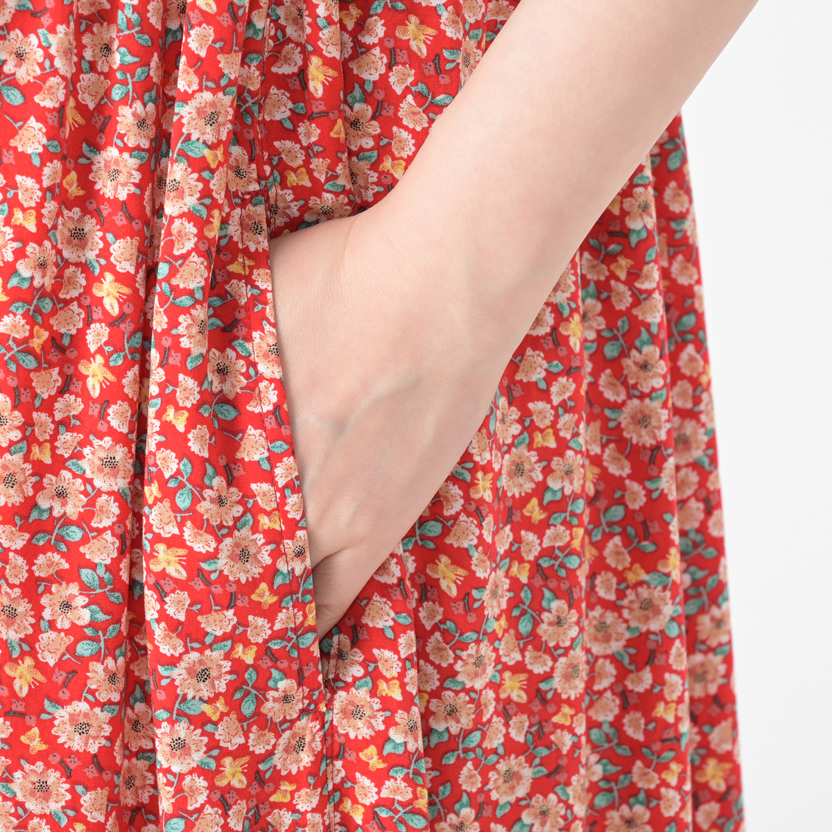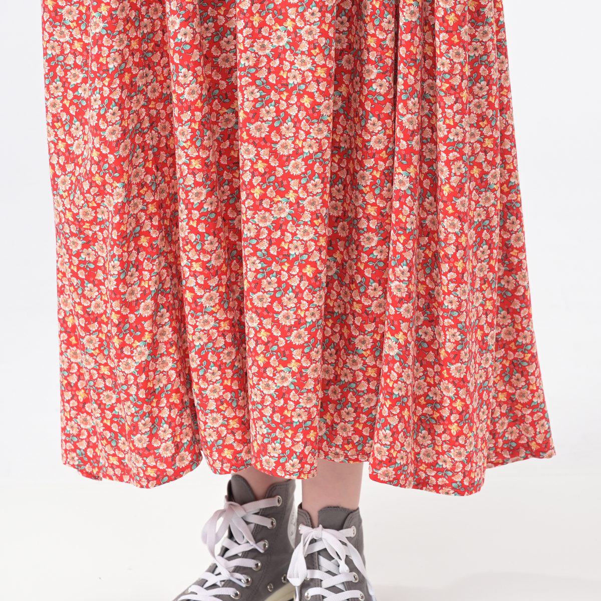 可憐な小花柄の総柄プリント布帛生地を使用。透け感が気になりにくいやや薄手のサラッとした肌触りで、レーヨン特有のとろっとした落ち感が魅力。ロング丈でも軽い着心地の素材感です