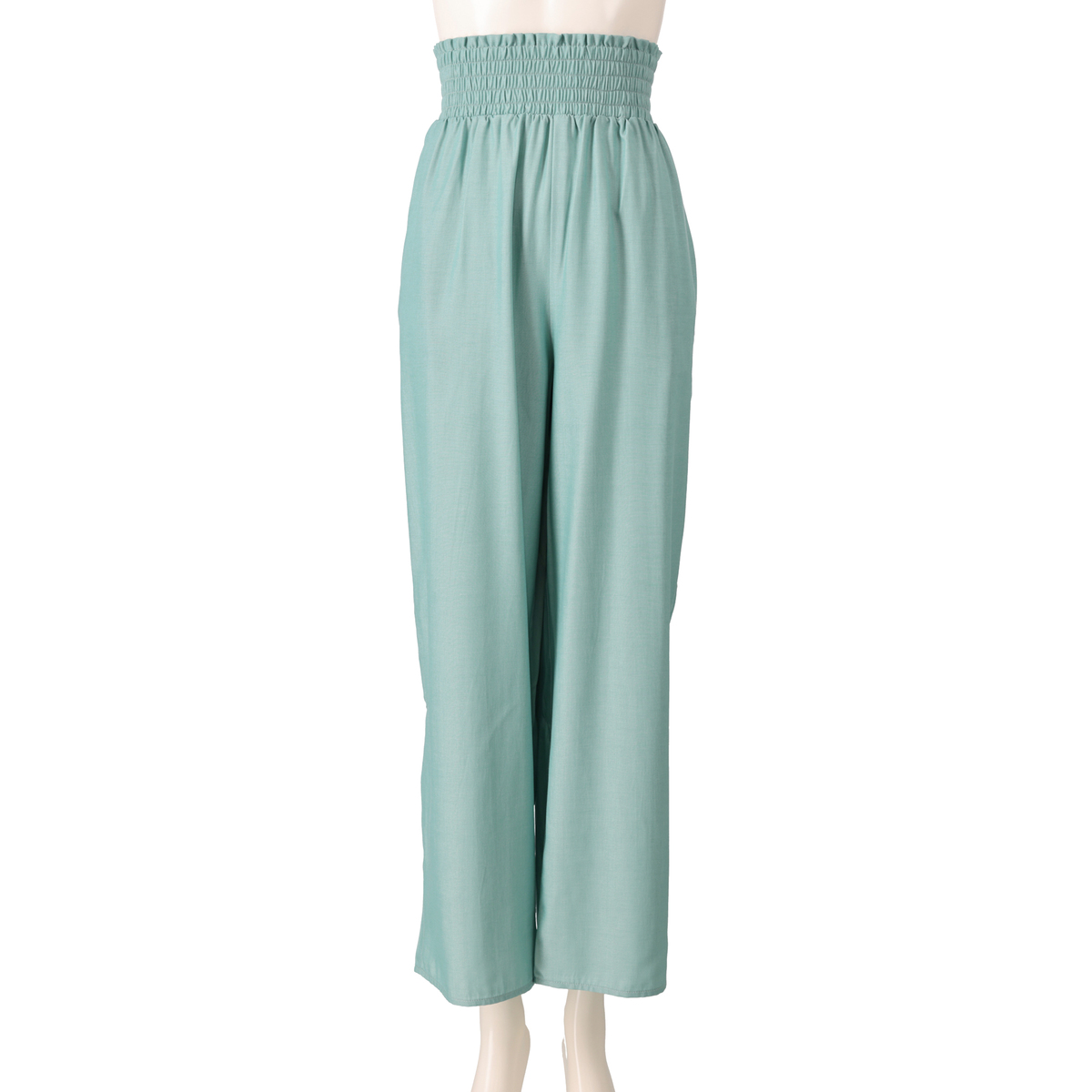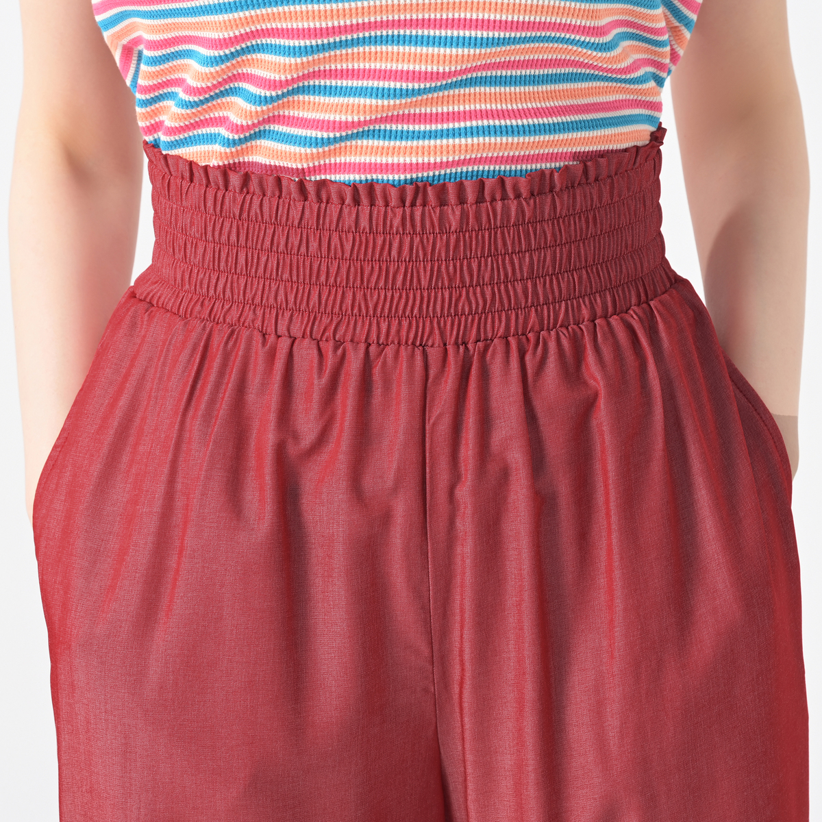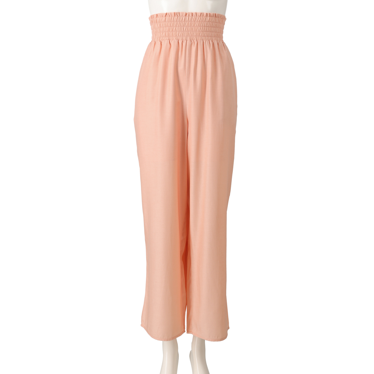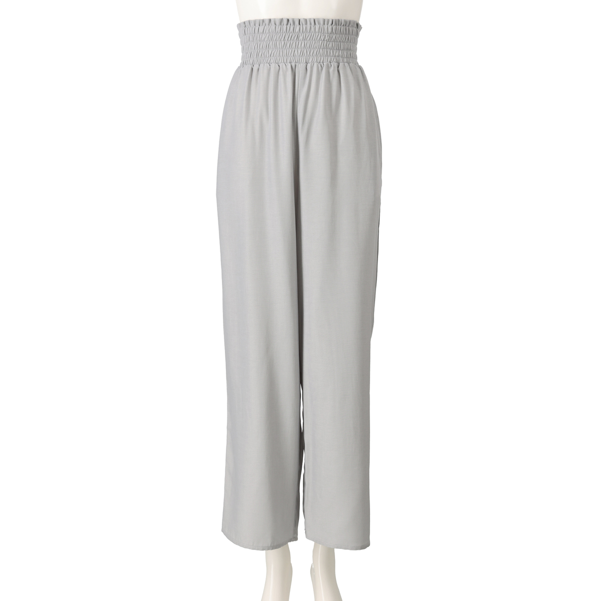 フルレングスのワイドシルエットのイージーパンツ。ウエストは総ゴム仕様で着脱が簡単です。ゴムシャーリング幅を広くとったハイウエスト風で、腰高に演出。カジュアルにもきれいめにも合わせられ、大人のこなれスタイルに重宝します