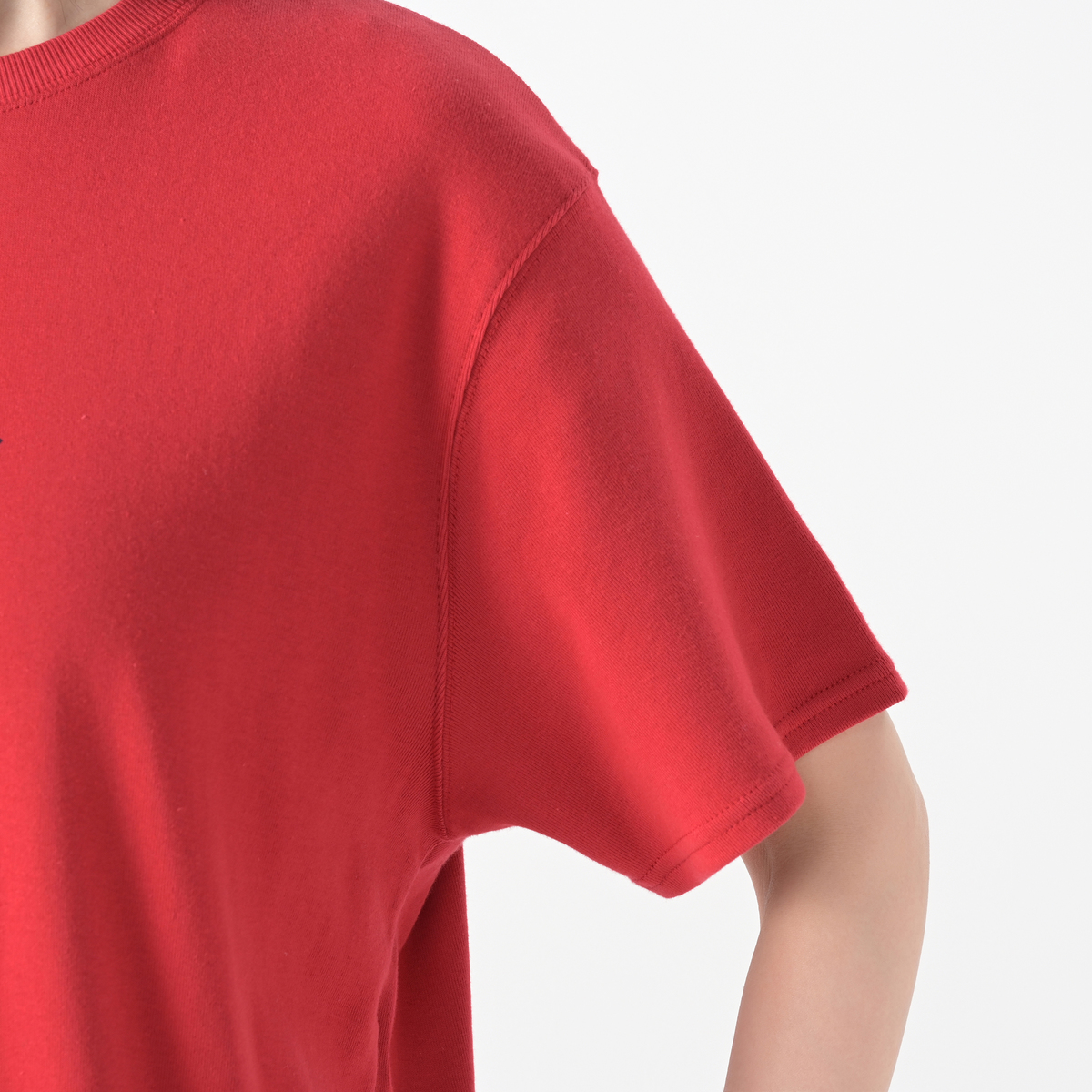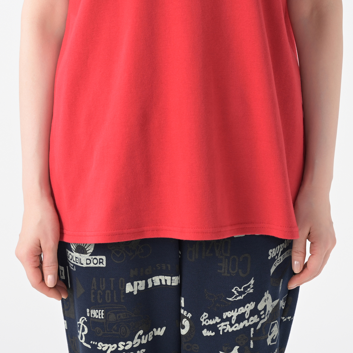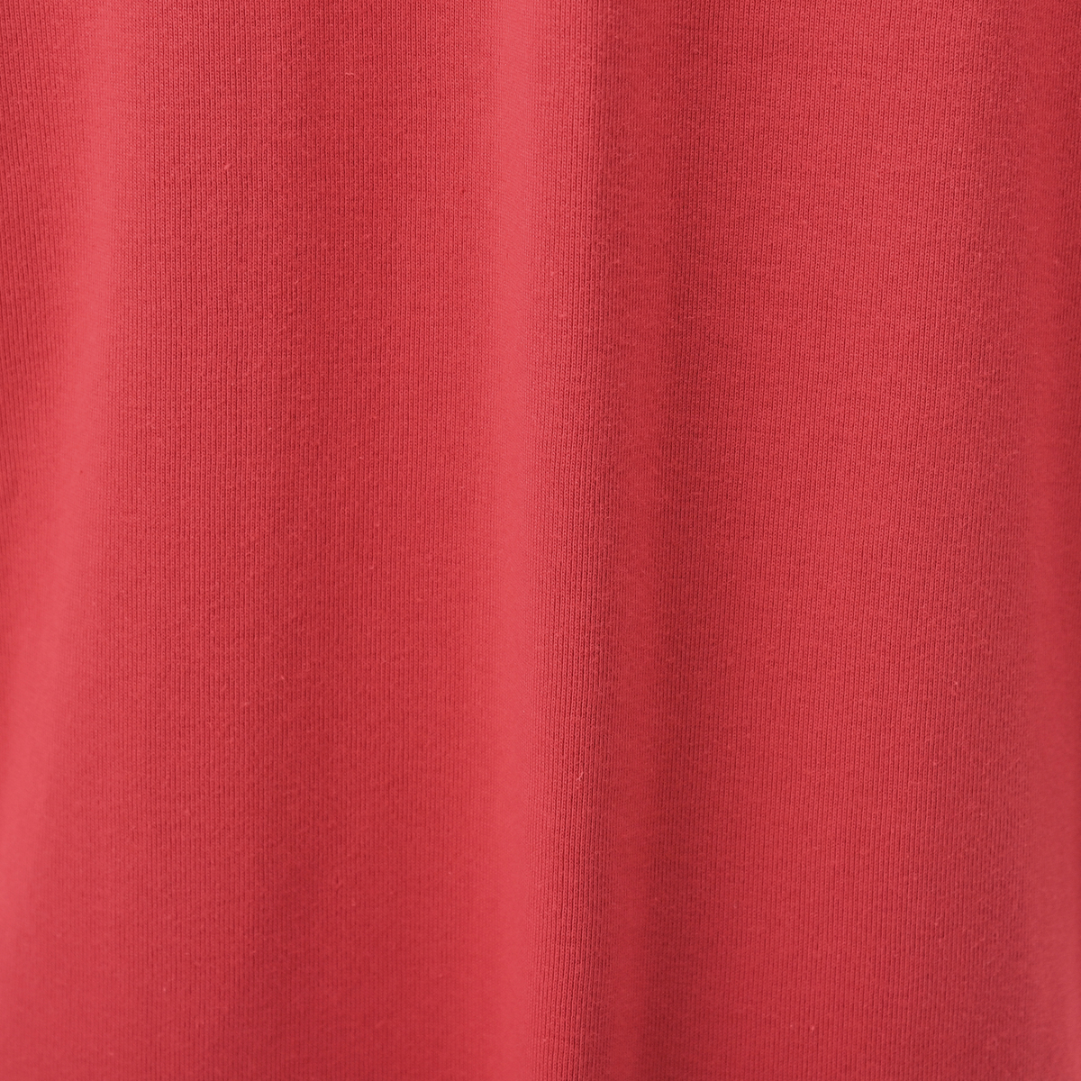 綿100%のカットソー素材を使用。程よい厚みの良く伸びるフライス生地で、気持ち良い肌触り。えりは伸縮性のあるリブを同色使いしています。UVカットの機能性もある素材です