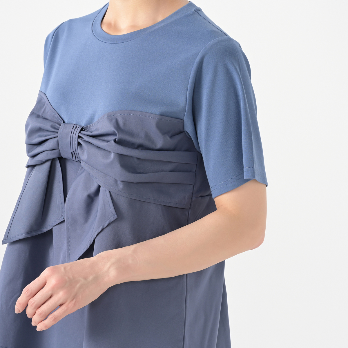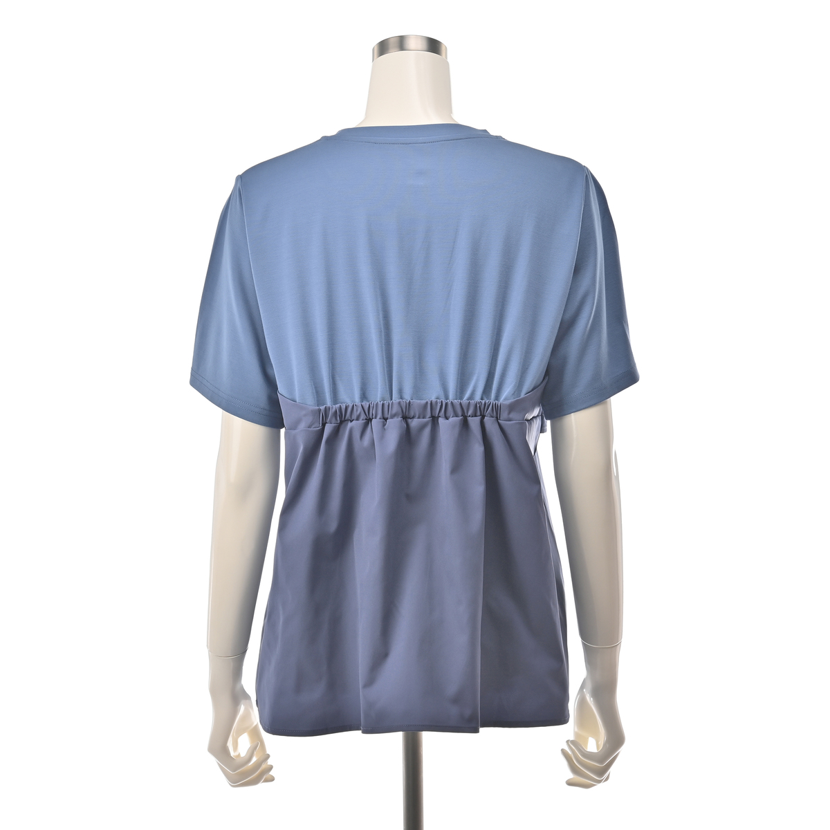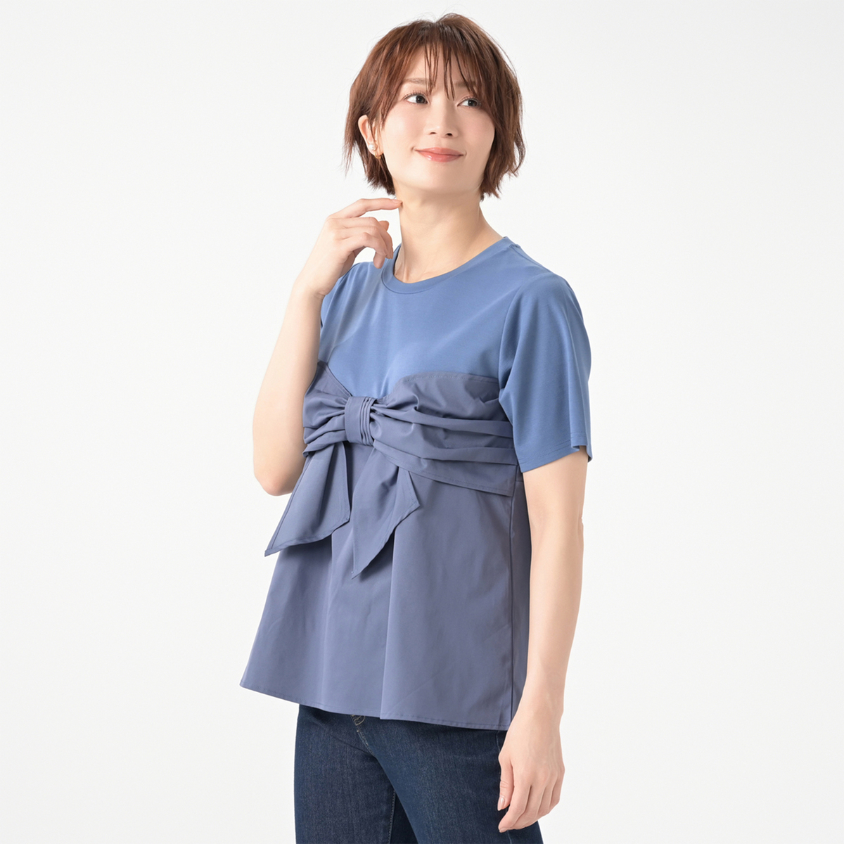 ストレッチ性のある柔らかなカットソー生地を使用し、快適な着心地です。布帛部分は上品なハリ感のある素材で、全体のデザインにきちんと感をプラス。異素材の組合せが、立体感と洗練された印象を演出します
