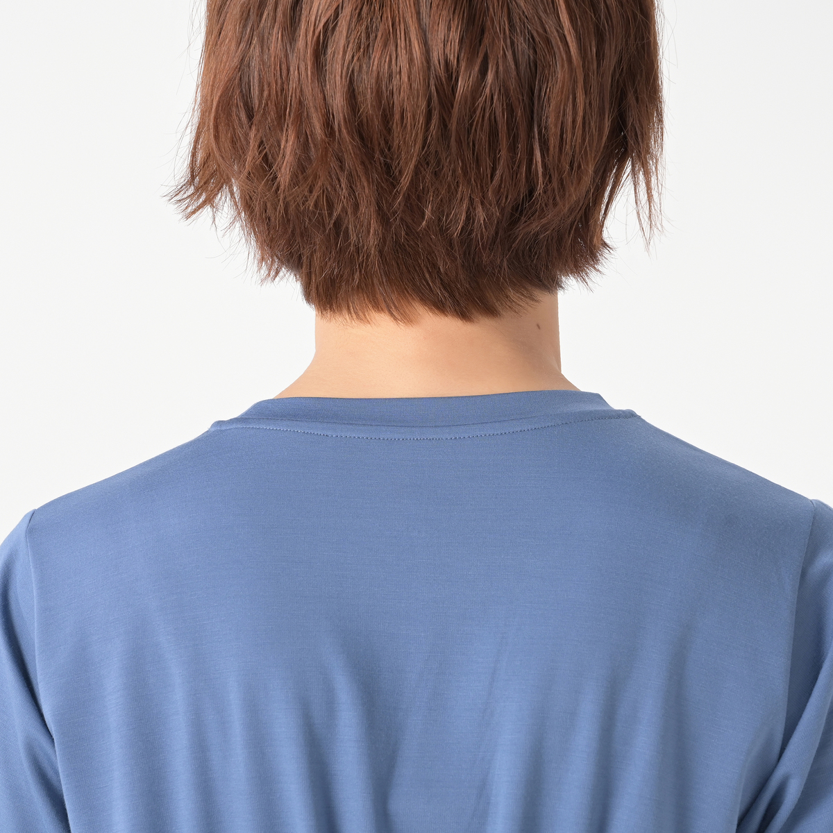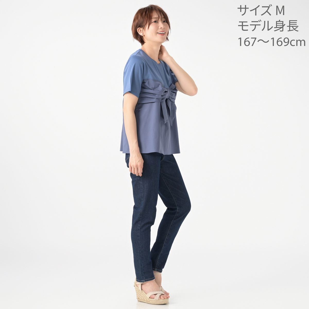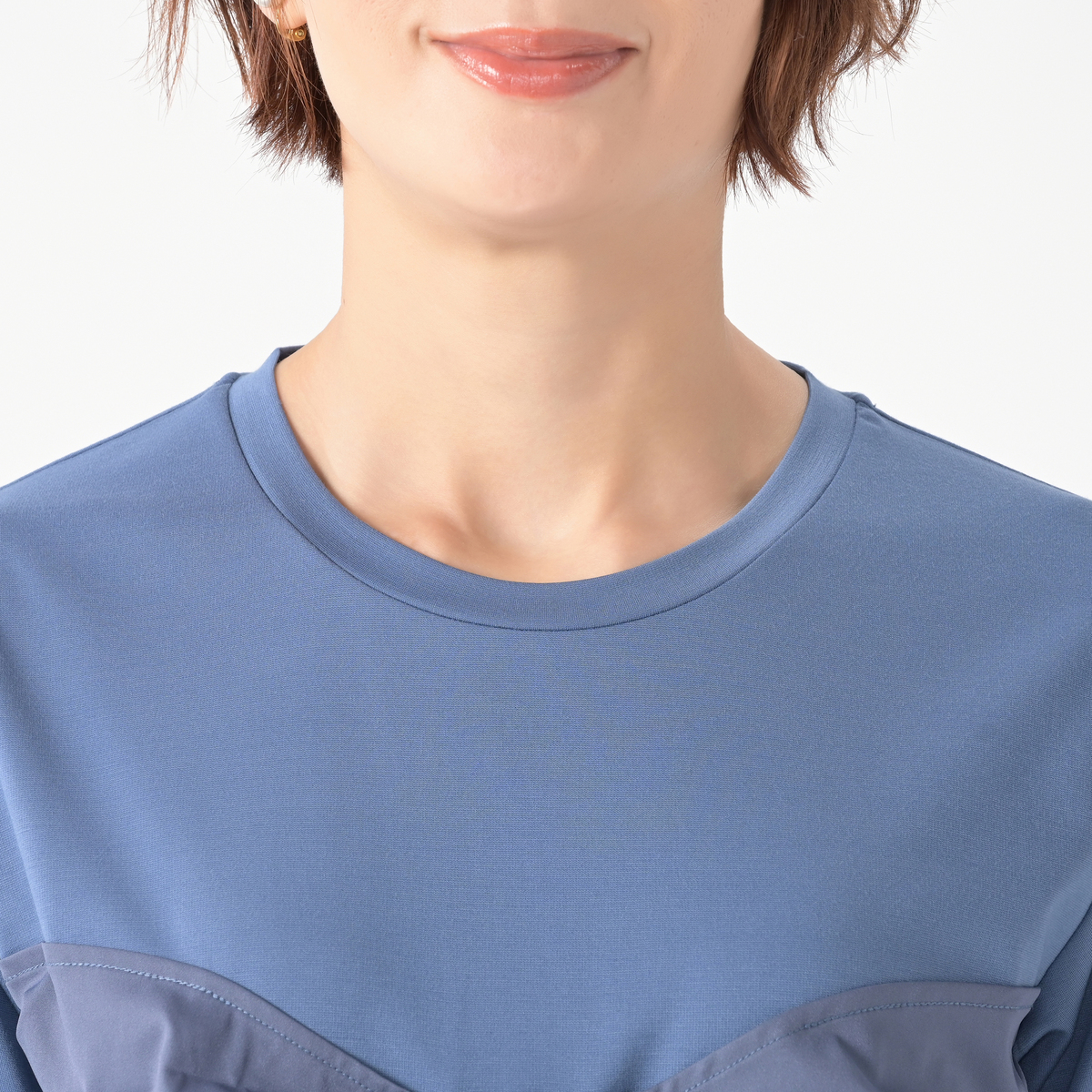ストレッチ性のある柔らかなカットソー生地を使用し、快適な着心地です。布帛部分は上品なハリ感のある素材で、全体のデザインにきちんと感をプラス。異素材の組合せが、立体感と洗練された印象を演出します
