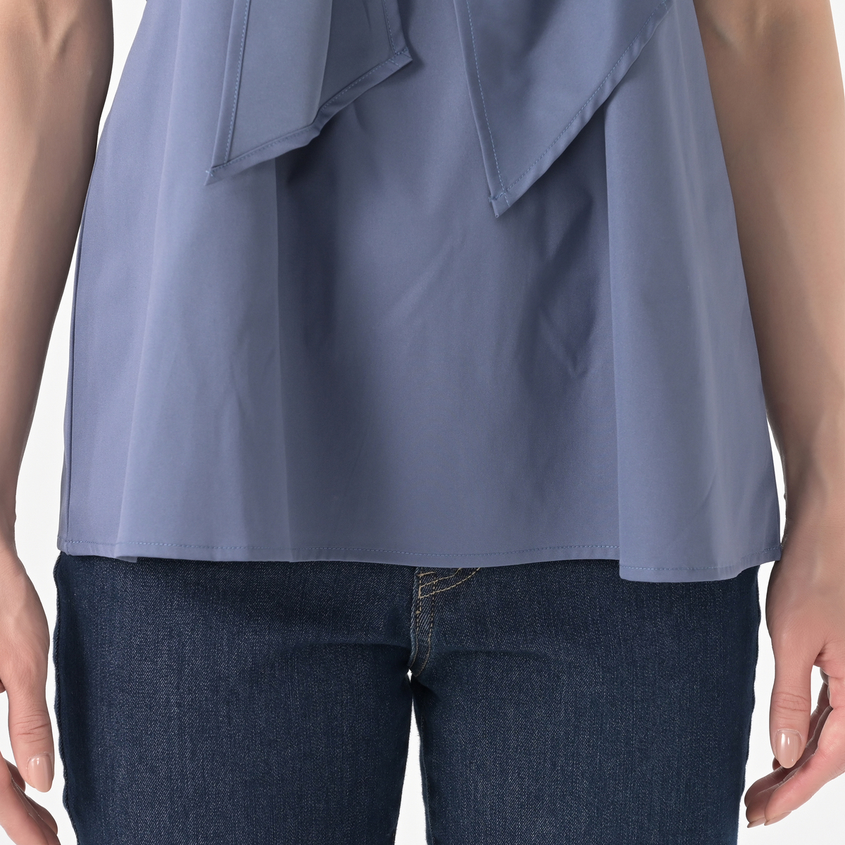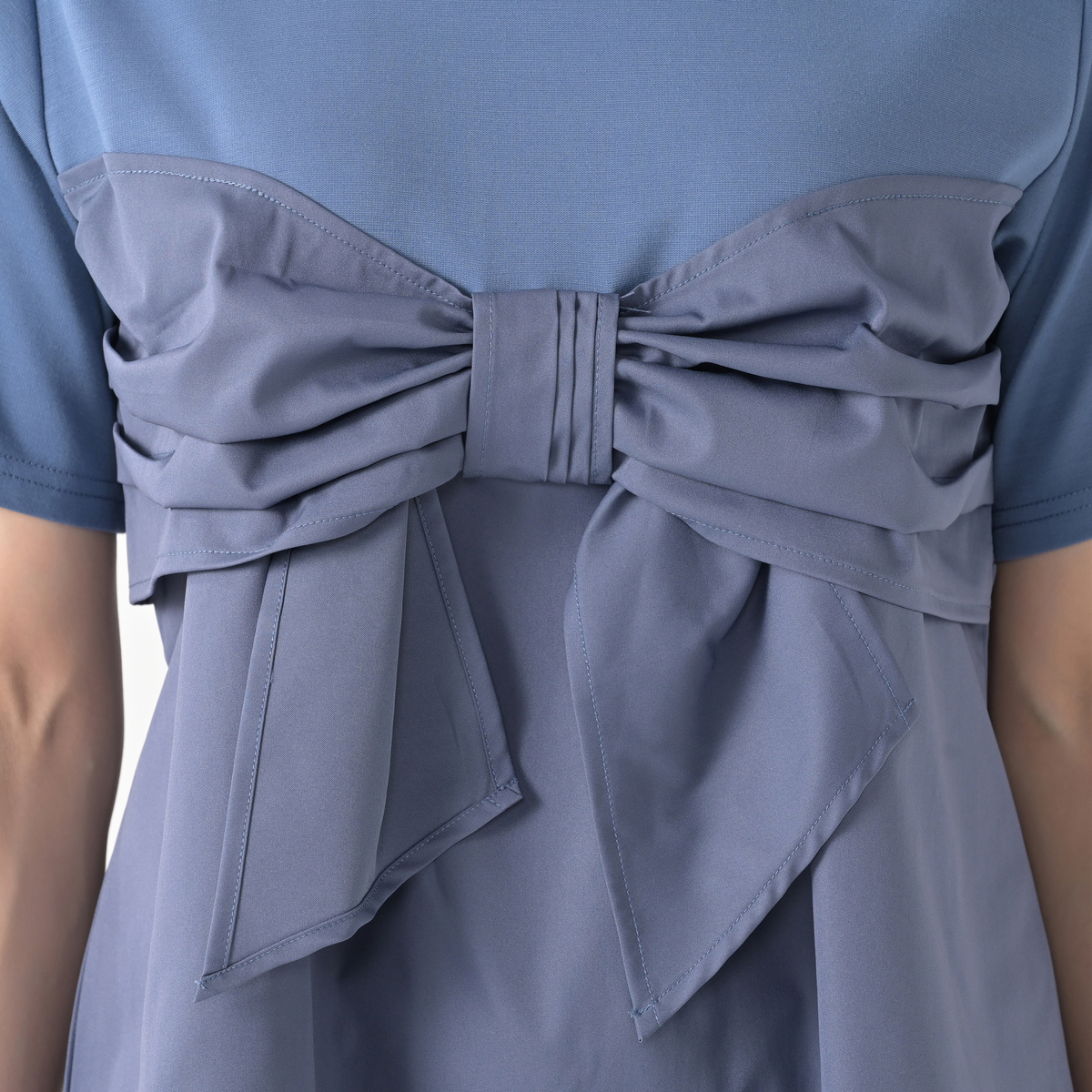 リボンデザインが目を引くトップスです。ウエスト部分には立体的なリボンを施し、裾に向かって広がるフレアシルエットがエレガントさをプラス。脚長効果が期待できる高めのウエスト位置で、スタイルアップを狙えます