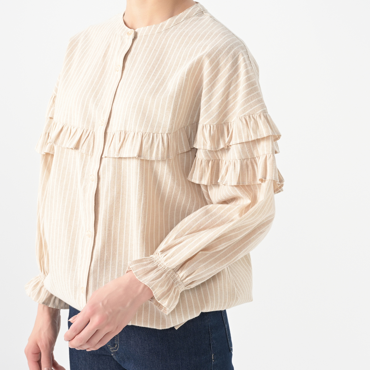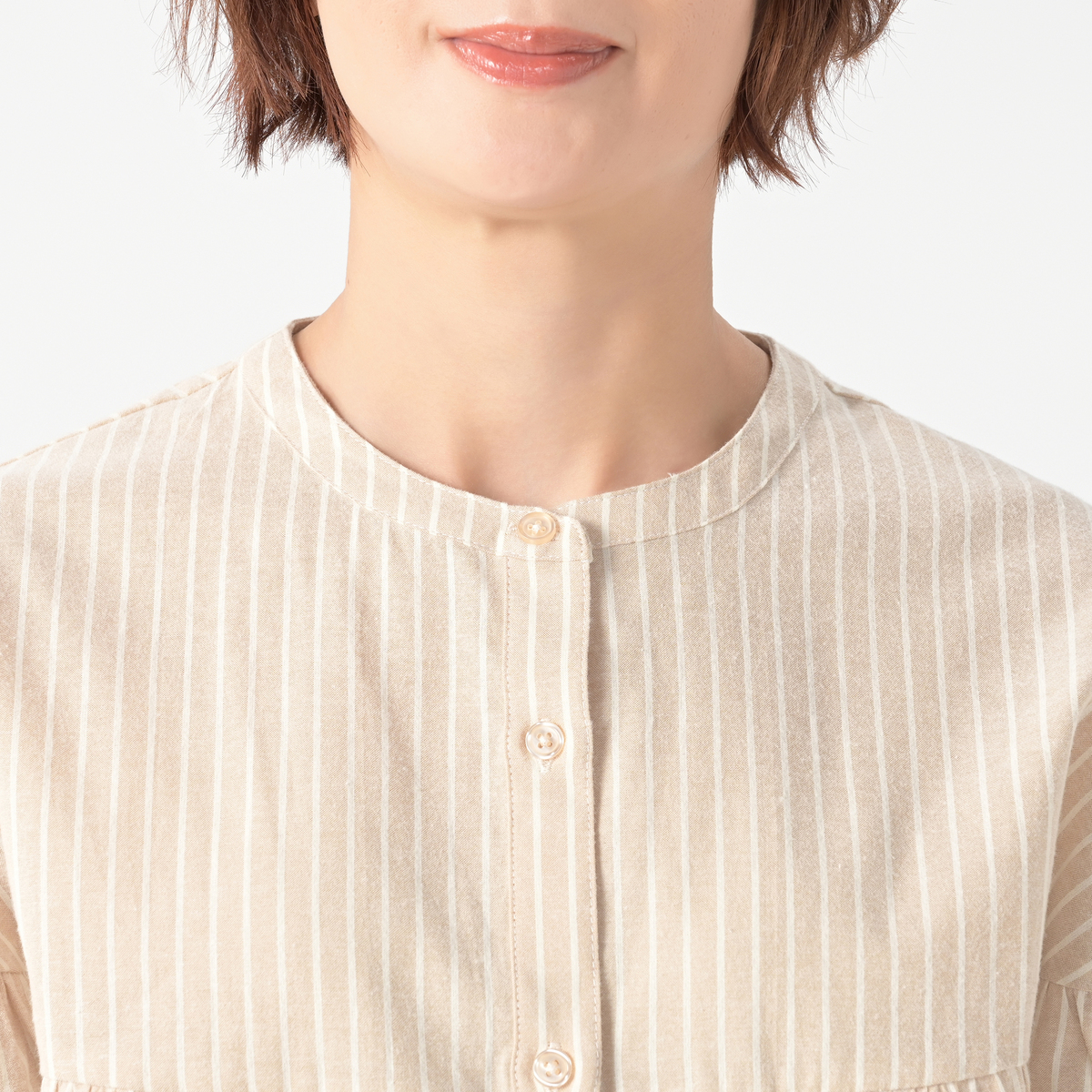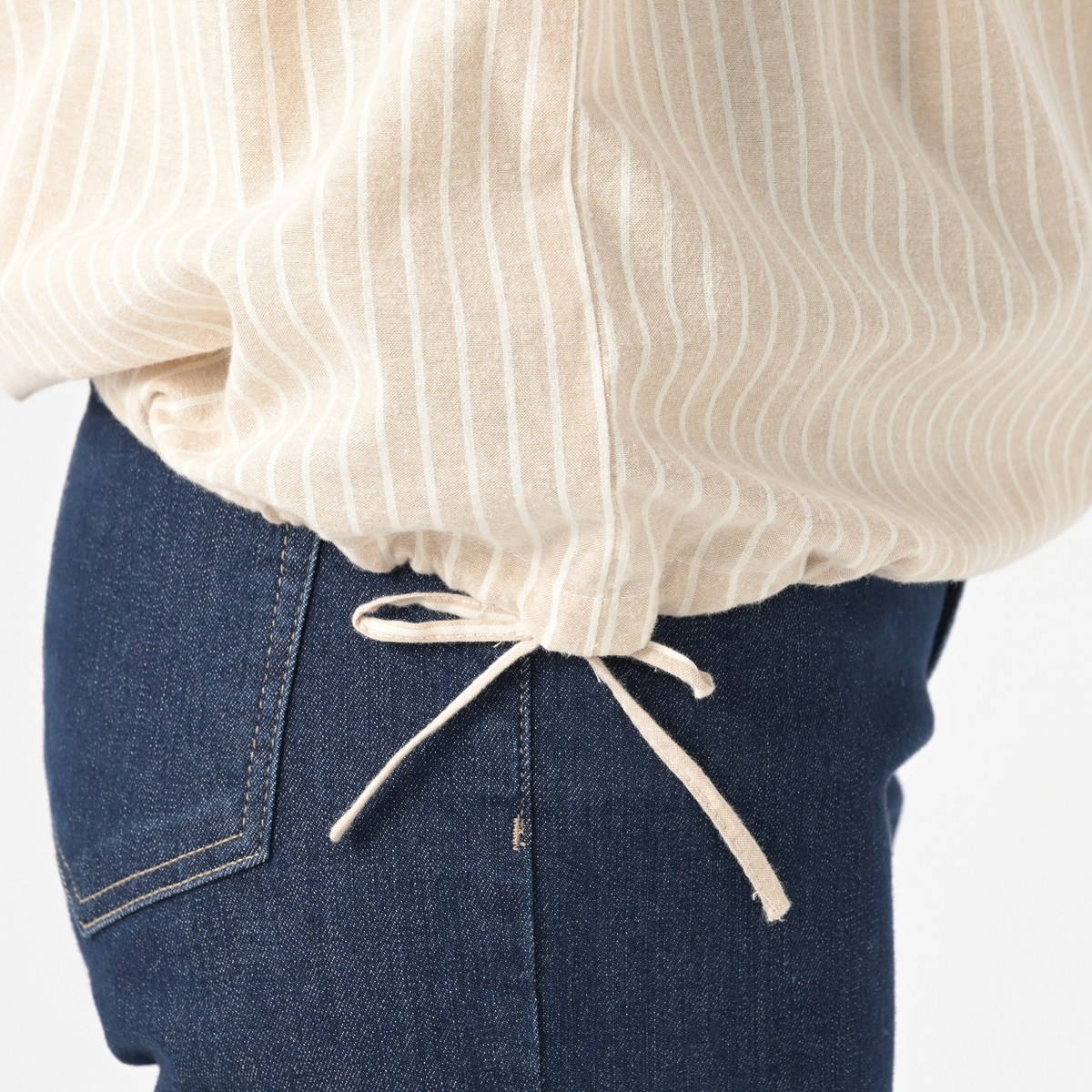 先染め布帛生地の軽やかな素材感で、大人可愛いコーデを叶えるシャツブラウス。控えめなストライプ柄でスタイルアップ見えを叶えます