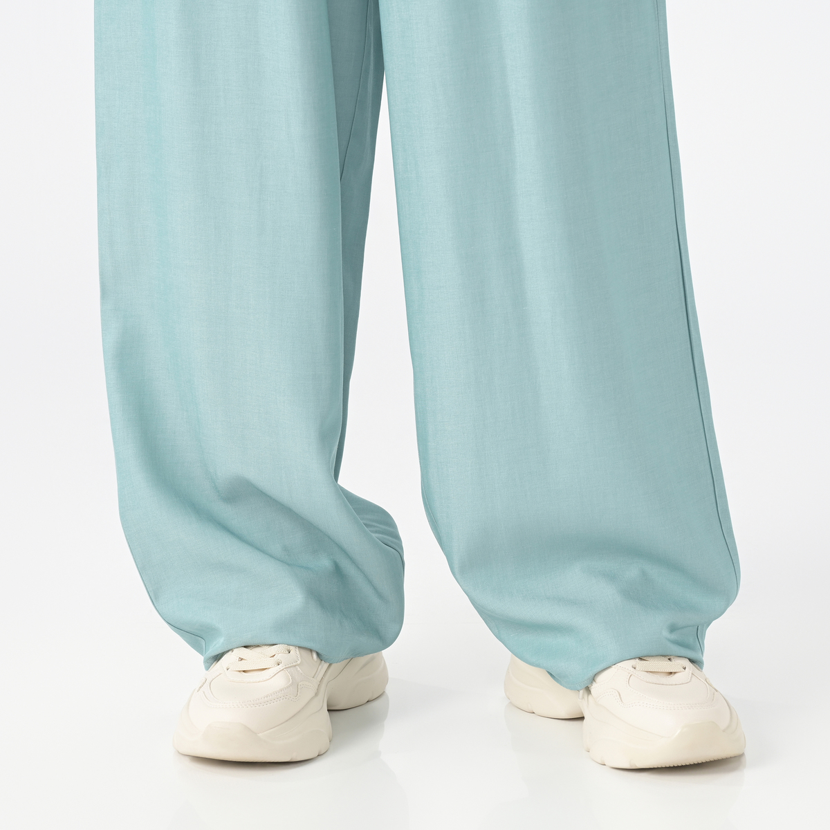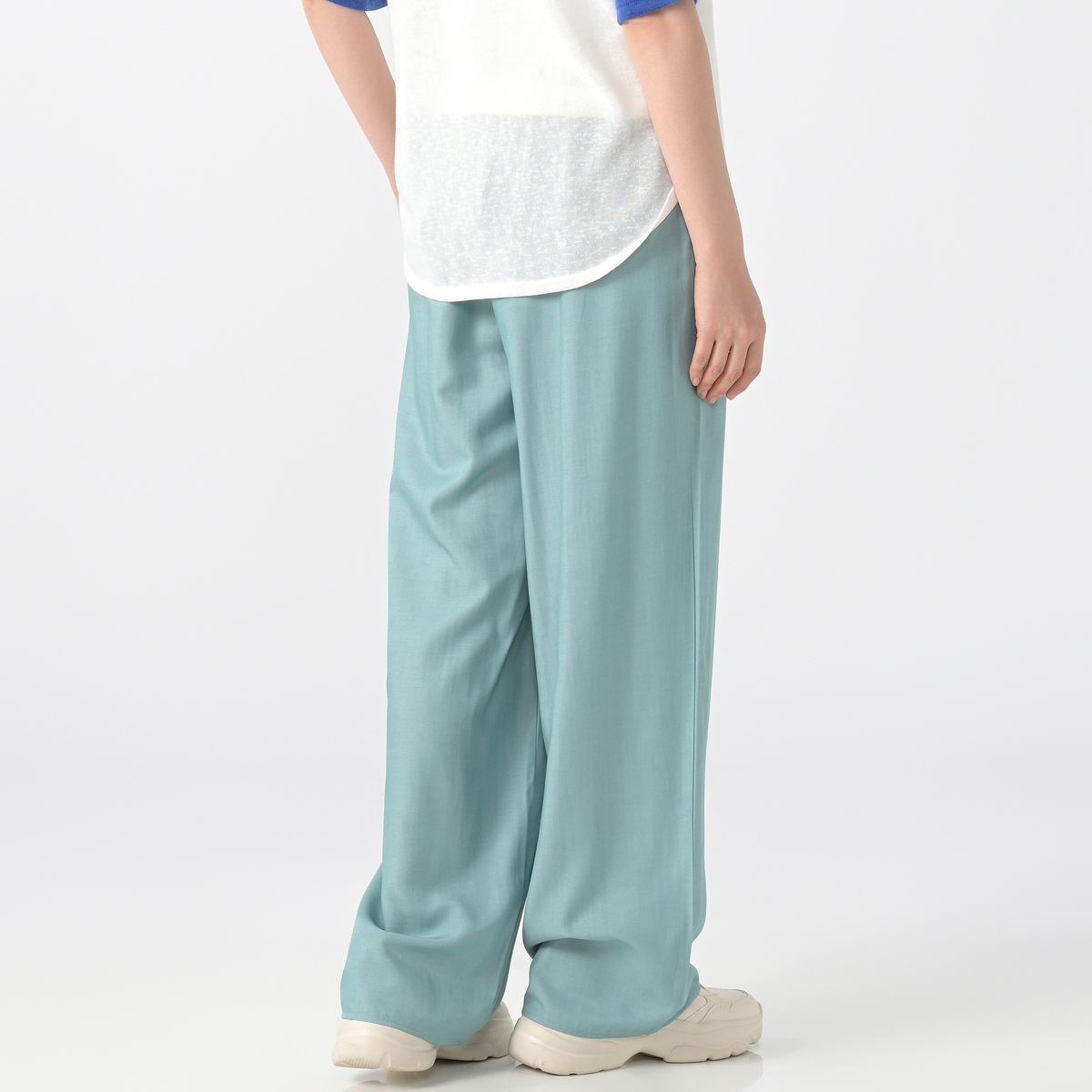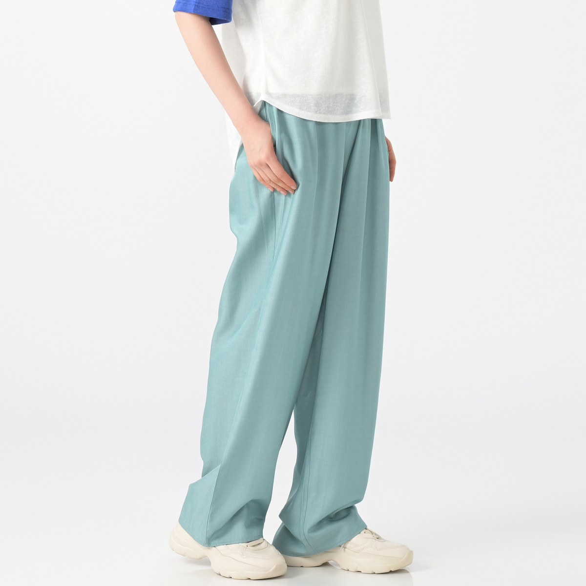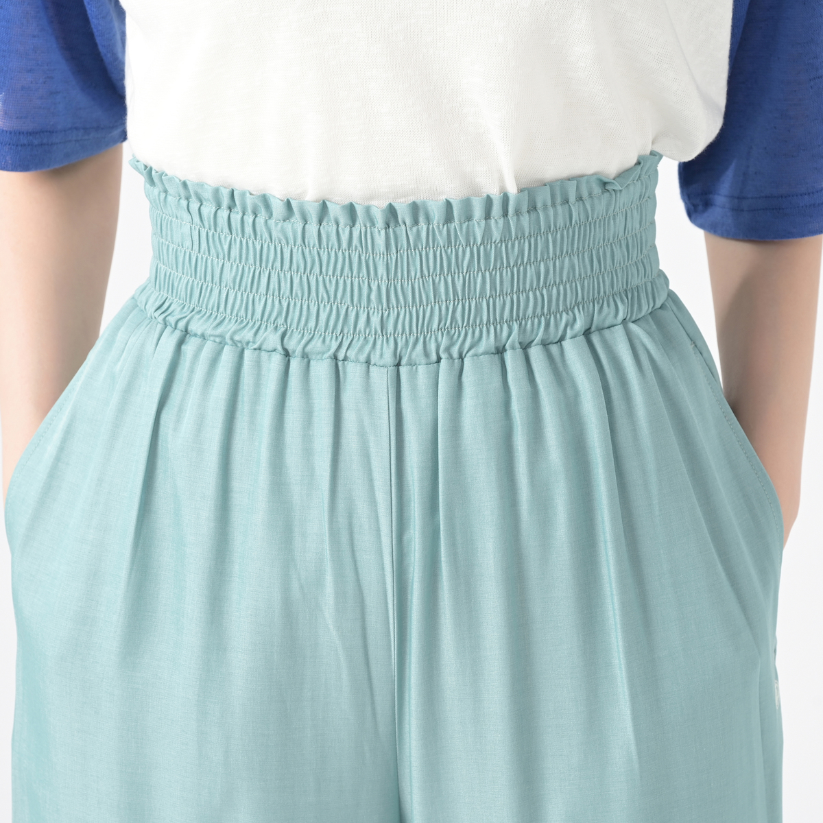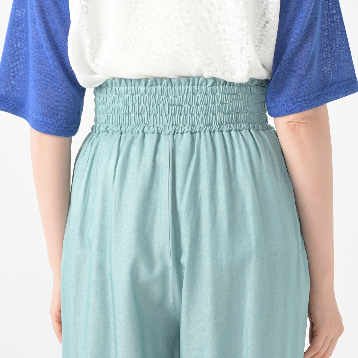 フルレングスのワイドシルエットのイージーパンツ。ウエストは総ゴム仕様で着脱が簡単です。ゴムシャーリング幅を広くとったハイウエスト風で、腰高に演出。カジュアルにもきれいめにも合わせられ、大人のこなれスタイルに重宝します