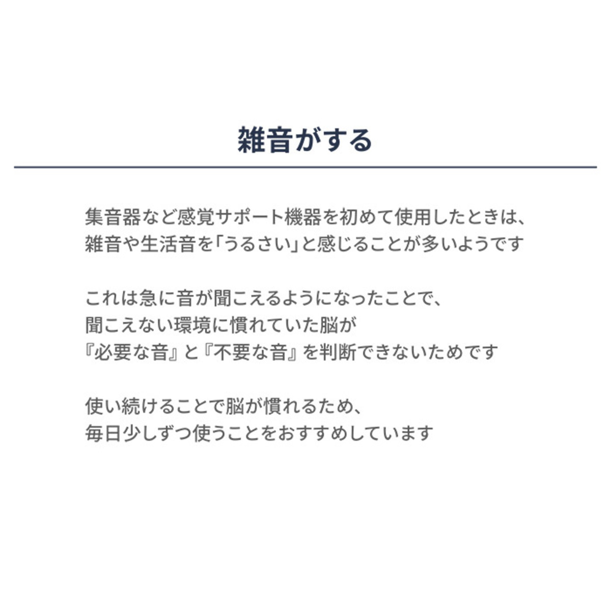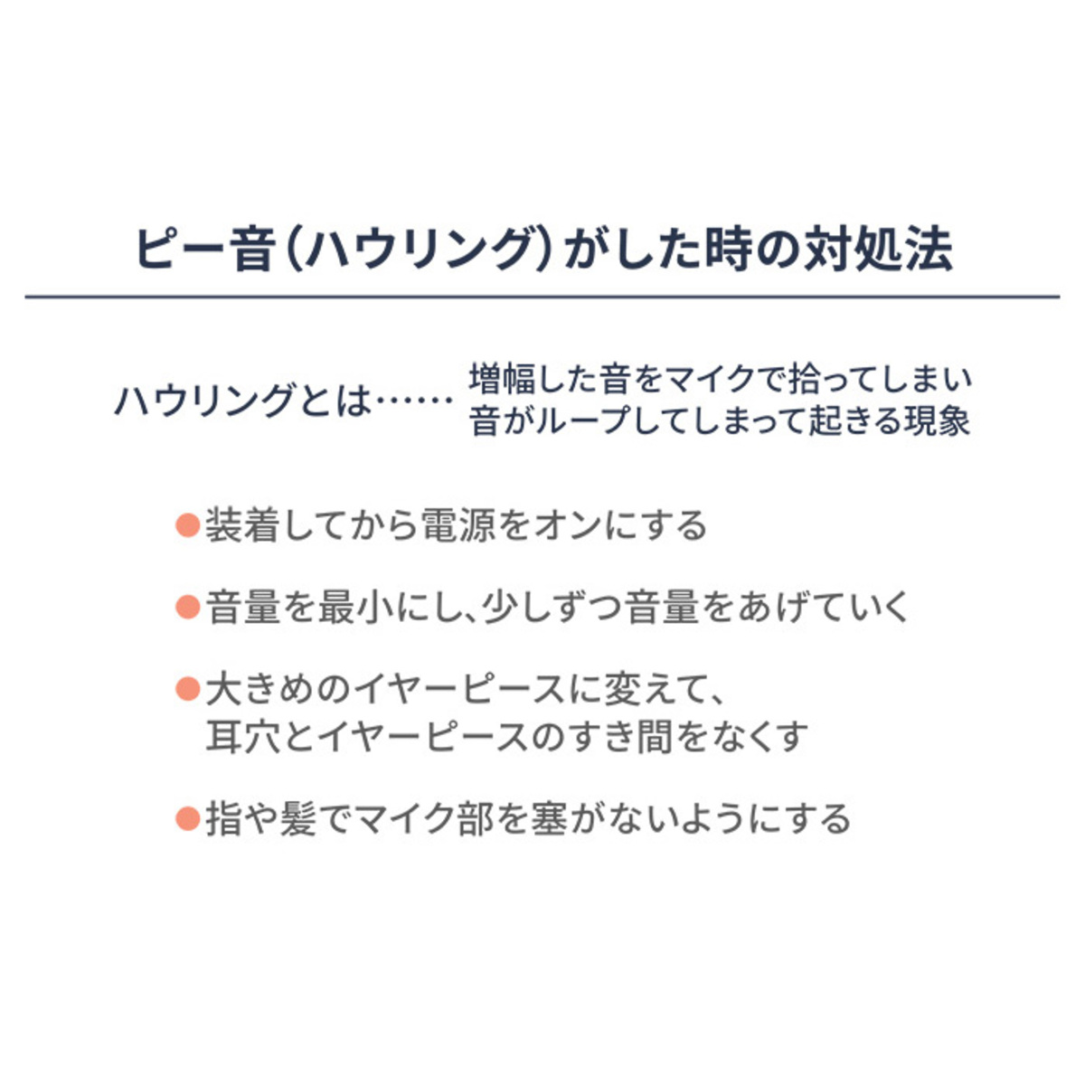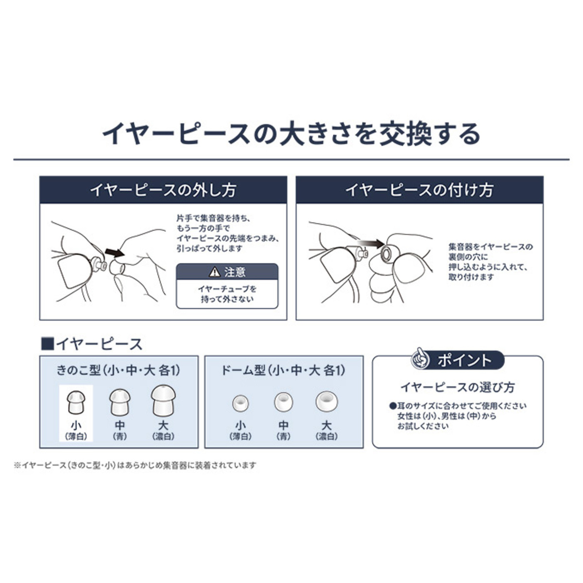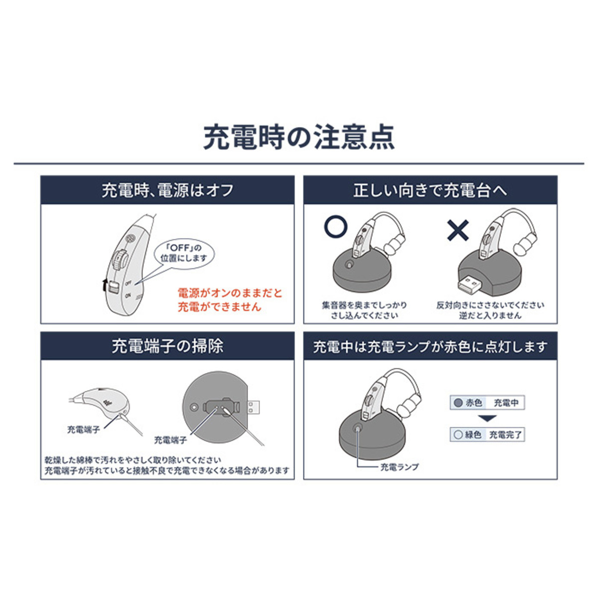 [セット内容] 楽ちんヒアリング片耳 ポーチ付×2セット <1セット内容> ・本体 ・充電アダプター ・充電台 ・USB ケーブル(約1m) ・お掃除ブラシ ・きのこ型イヤーピース小・中・大×各1(小は本体に装着済) ・ドーム型イヤーピース小・中・大×各1 ・収納ポーチ [サイズ(約)] 本体:3.2cm(本体操作部) 充電台:縦5.2×横4.9×高さ2.5cm 収納ポーチ:13×9×4cm [重量(約)] 本体:5g 充電台:34g 収納ポーチ:33g [材質] 本体:ABS樹脂 イヤーピース:シリコン [充電時間] 10時間 [使用可能時間] 30時間 [使用方法] <集音器を充電する> 充電台とUSBケーブル、充電アダプターをセットします。充電には約10時間かかります。10時間経つ前でも充電ランプが緑になったら充電完了です <集音器を耳に装着する> 髪を耳にかけるようにすべらすように耳に装着します。集音器(固い部分)を耳のラインに沿わせて顔側から耳にかけます。髪の毛が長い方は、髪の上から乗せずに、顔側から耳の上に這わせるように装着してください。集音器を耳にぴったり装着できたら、イヤーピースを奥まで耳に入れます <聞こえやすい音量に調整する> 装着している側の手で、人差し指、中指、薬指で耳から落ちないように押さえます。親指で音量調整ダイヤルを回して音量を調整します。音量は4段階で調節できます ■取り扱い説明を十分にご確認の上、ご使用下さい 【中国製】 [注意事項] ※本製品は集音器です。医療機器の補聴器ではありません ※次のような方は医師(主治医)に相談の上で使用する ・耳の手術を受けたことのある方 ・耳だれのある方 ・耳垢の多い方 ・急性または慢性のめまいのある方 ・外耳道に湿疹、痛みまたは不快感のある方 ・長期にわたって継続して使用する方 ※使い始めは音量を小さめにしてから使用する。耳を傷める原因になります ※取扱説明書で指示されている部品(当社が推奨または販売している部品)以外は使用しない。故障やケガの原因になります ※ぶつけたり、重いものを上に載せたり、無理な力を加えない。また、無理に部品を引っ張るなど、乱暴に扱わない。破損し、感電、火災、事故の原因になります ※集音器を次のような場所に設置、保管しない。感電、故障の原因になります ・極端に高温、低温になる場所 ・暖房器具などの熱源や火気の近く ・浴室内など水のかかりやすい、または多湿の場所 ・ホコリが多い場所 ・野外、直射日光の当たる場所 有害物質の近く ・滑りやすいものの近く(グリース、油、雪、未乾燥の塗料など) ※お子様やペット(動物)の手の届かないところに保管する。思わぬ事故やケガの原因になります ※以下の場合は使用しない。思わぬ事故やケガの原因になります ・集音器が故障や劣化した場合 ・集音器が化学物質で腐食した場合 ・集音器が熱で変形した場合 ※お子様には使用させない。思わぬ事故やケガの原因になります ※他人に集音器を貸したり、他人から借りたりしない。耳を傷めたり、耳の病気が感染する原因になります ※故障していたり、故障と思われる場合は、使用しない。思わぬケガの原因になります ※就寝時には使用しない。事故や体調不良の原因になります ※監督が必要な人は使用しない。思わぬケガの原因になります ※電源プラグが曲がった場合は、使用を中止する。カスタマーサービスセンターにご連絡ください。そのままご使用を続けると感電、火災、やけどの原因になります ※AC100V 50/60ヘルツのコンセントに接続して使用する。故障や発熱による火災の原因になります ※ぬれた手で電源プラグを抜きさししたり、電源がオンになった状態の集音器を触らない。感電の恐れがあります ※浴室内や湿気の多いところで充電しない。感電、故障の原因になります <イヤーピース、イヤーチューブ> ※ときどきイヤーピースを外して付属のお掃除ブラシで掃除します ※耳垢などのゴミで音口部が詰まらないように定期的に掃除してください。ゴミが詰まると音が聞こえにくくなる場合があります ※開口部はお掃除ピンで、周囲はブラシで掃除します <集音器、充電台の充電端子> ※乾燥した綿棒で汚れをやさしく取り除いてください ※充電端子が汚れていると接触不良で充電できなくなる場合があります <集音器> ※乾燥した清潔な布で拭いてください。汚れがひどい場合は、中性洗剤を薄めたものを含ませた後、かたく絞った布で拭いてください