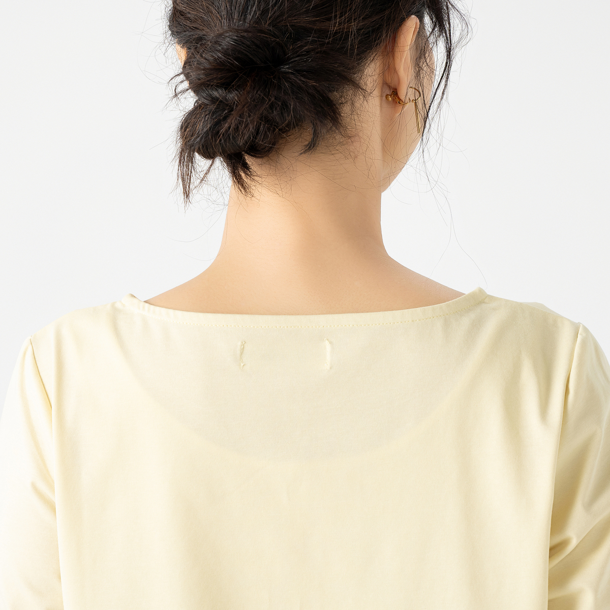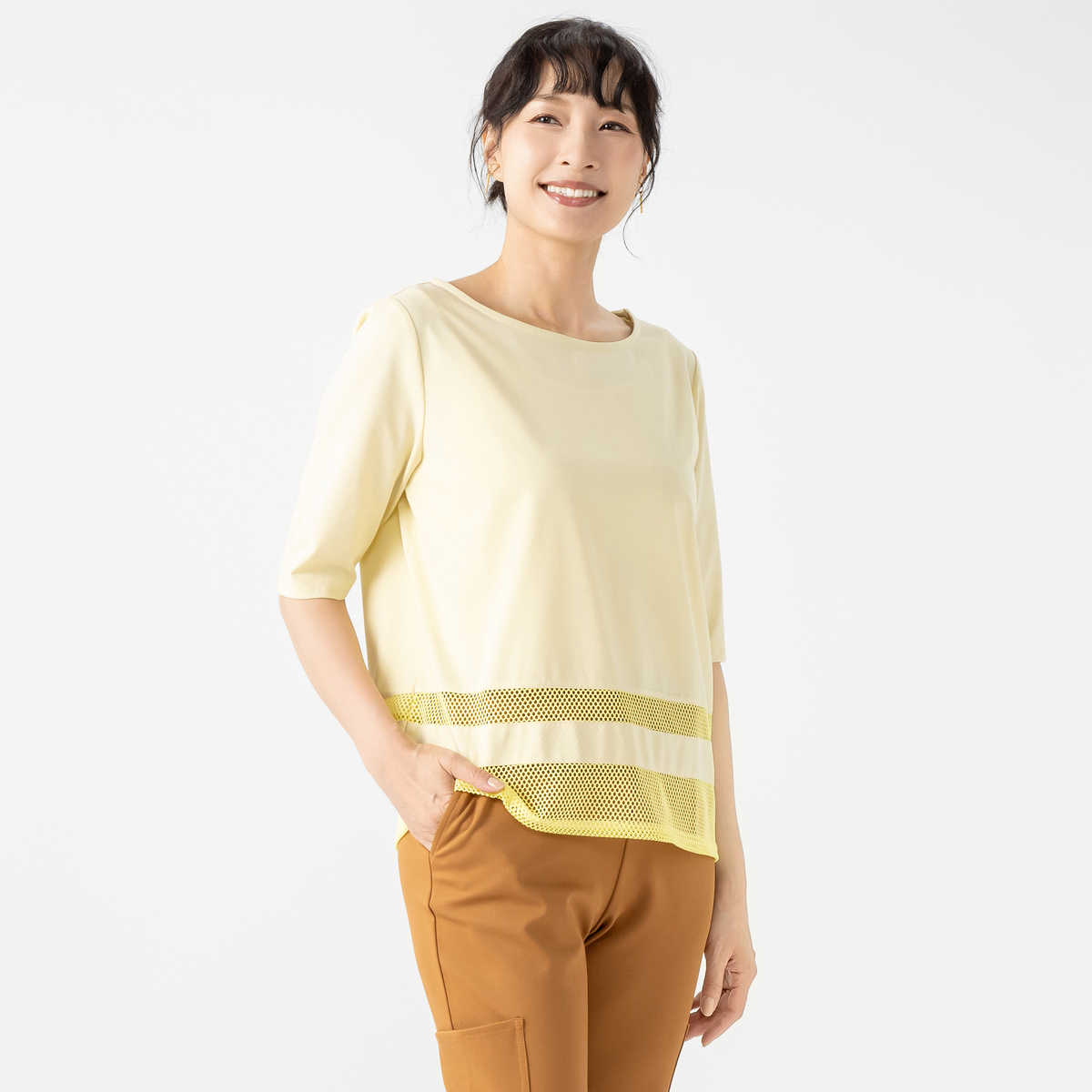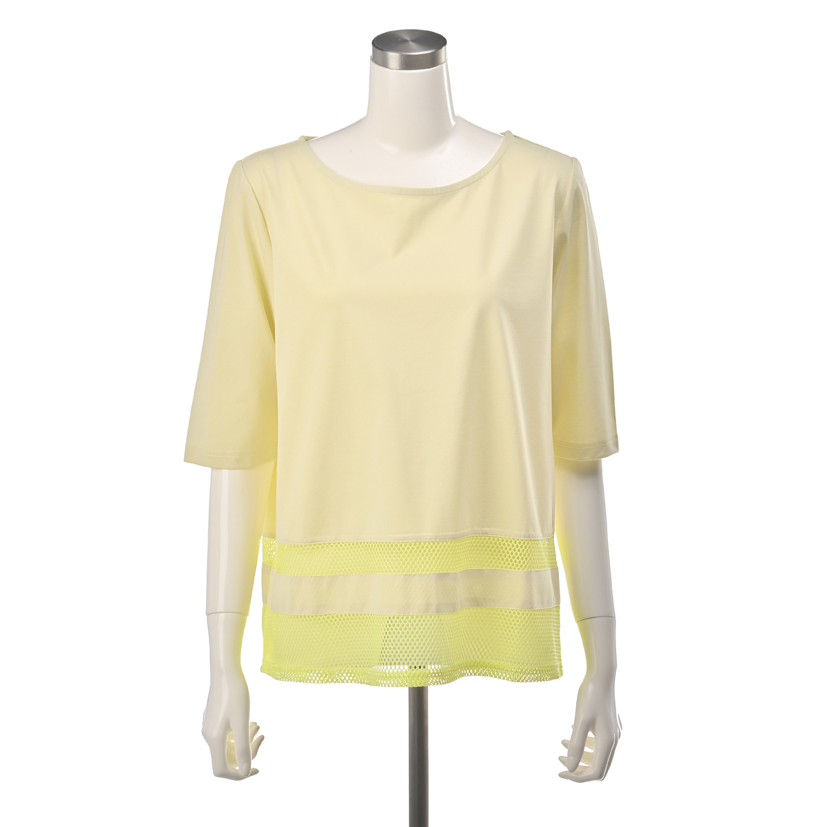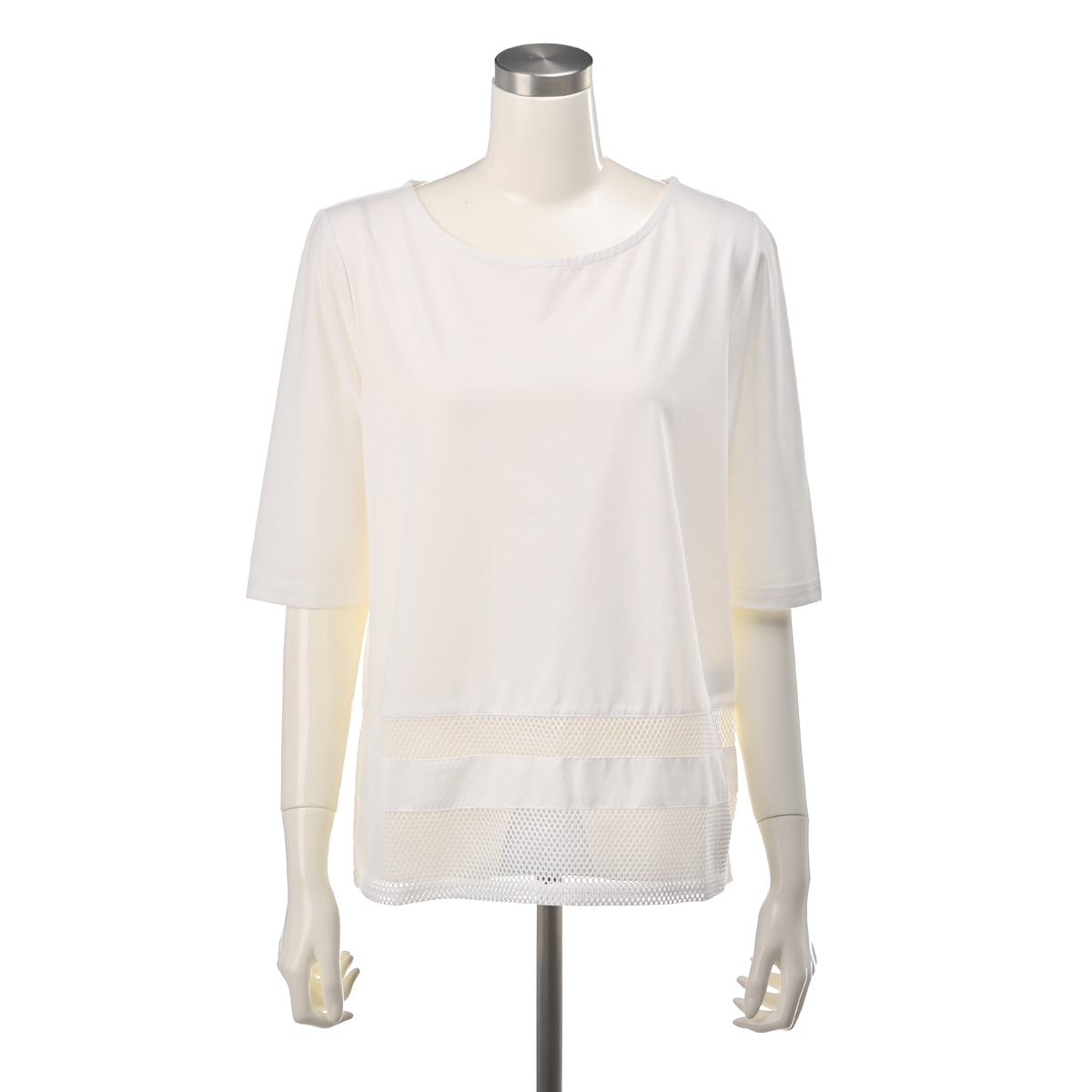裾を2段メッシュで切り替えたプルオーバー。本体にはしなやかで光沢があるシルケット素材を使うことで、大人な表情でお召しいただけます。ボートネック風の首元も、装いをエレガントにまとめてくれます