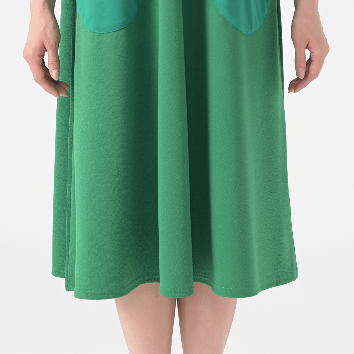 美しいAラインシルエットに、キュートな丸いポケットを付けた、リラクシーなワンピース。表面に凹凸のある軽めの膨れジャガードと、丸いポケットのフラットな素材のコントラストが印象的で、シンプルながら着映えする一着です