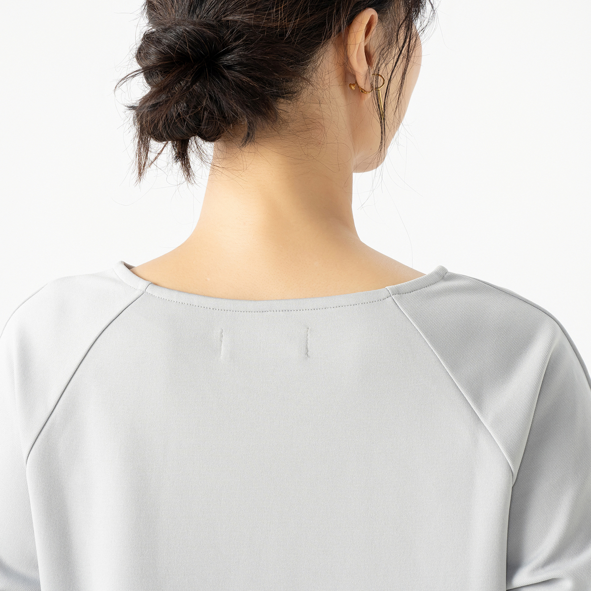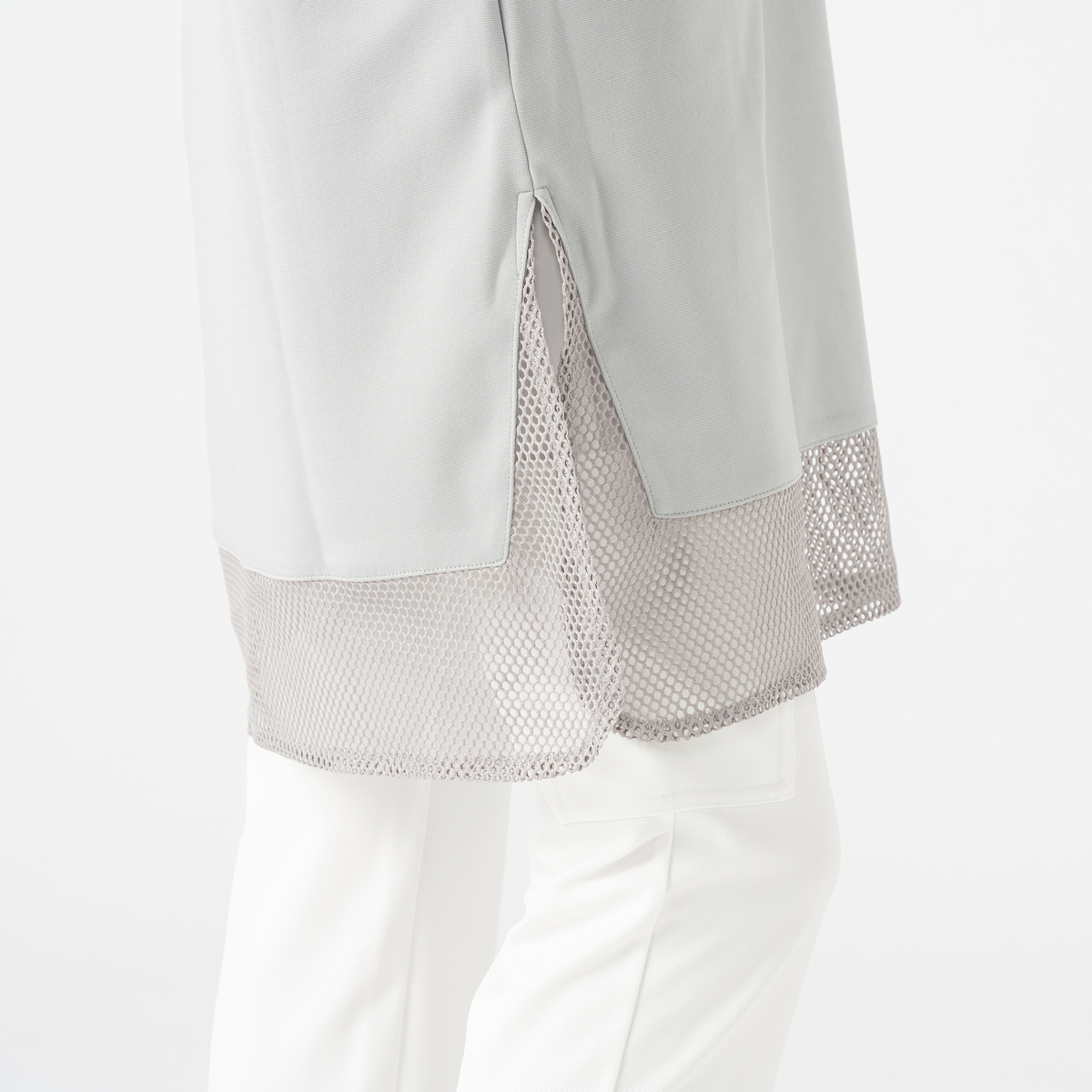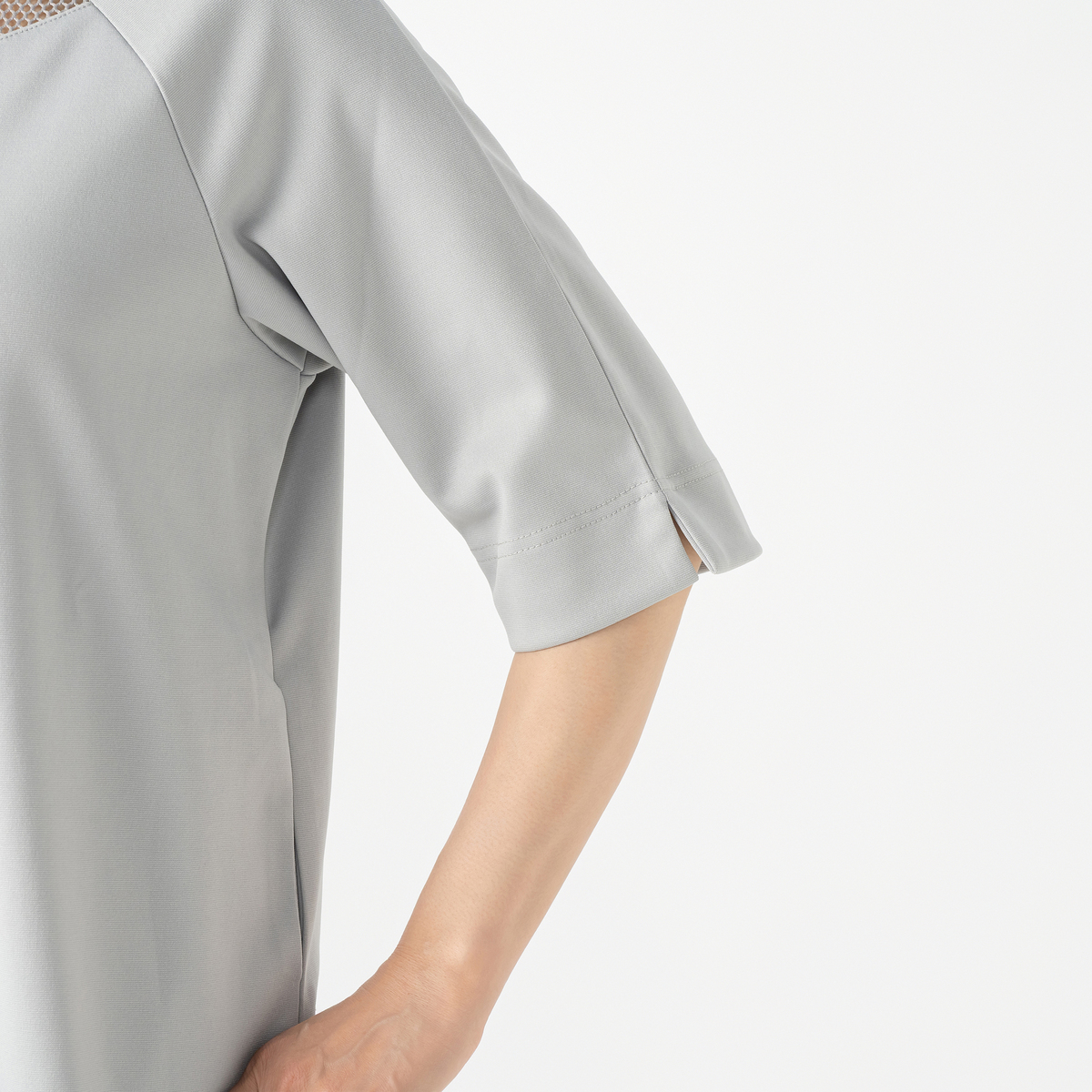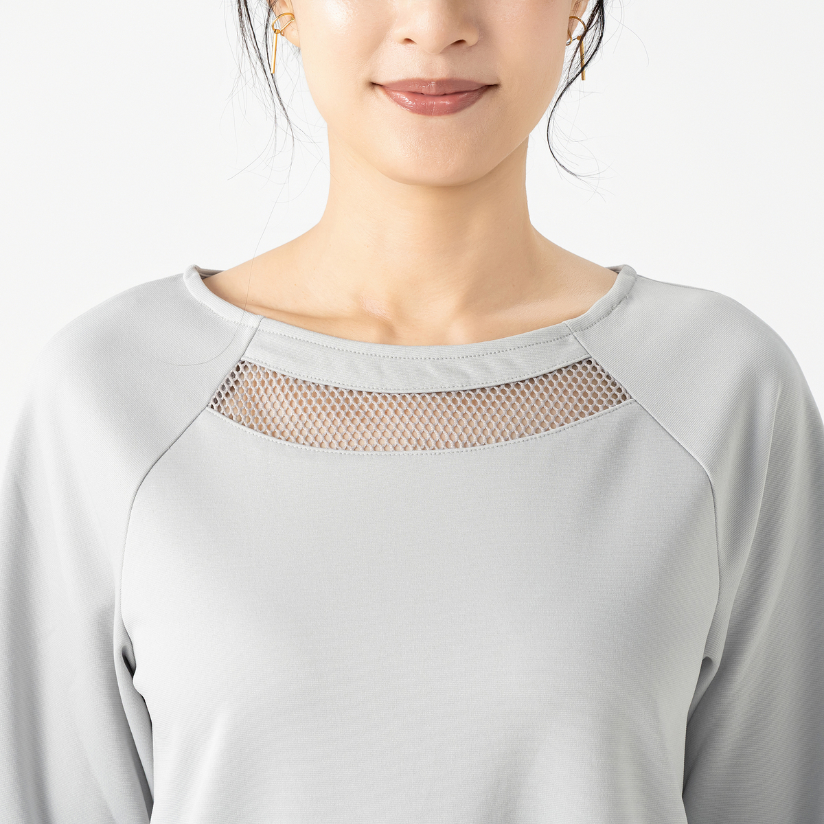 ラグランスリーブの切替えを利用してデザイン。上品なシルエットの裾からメッシュが覗く、抜け感あるスタイリングが楽しめます