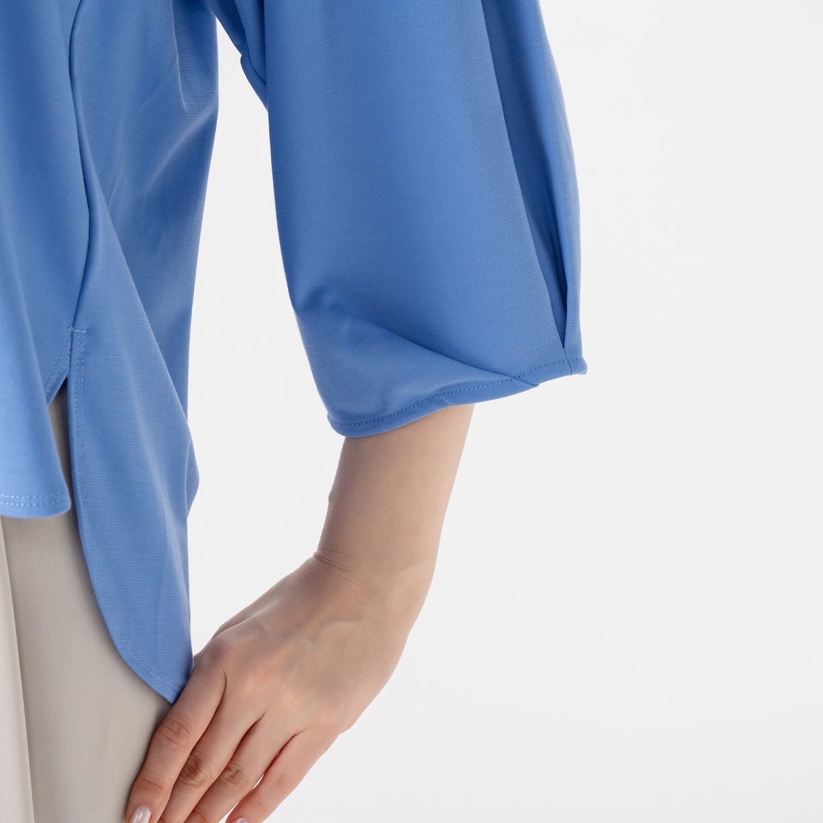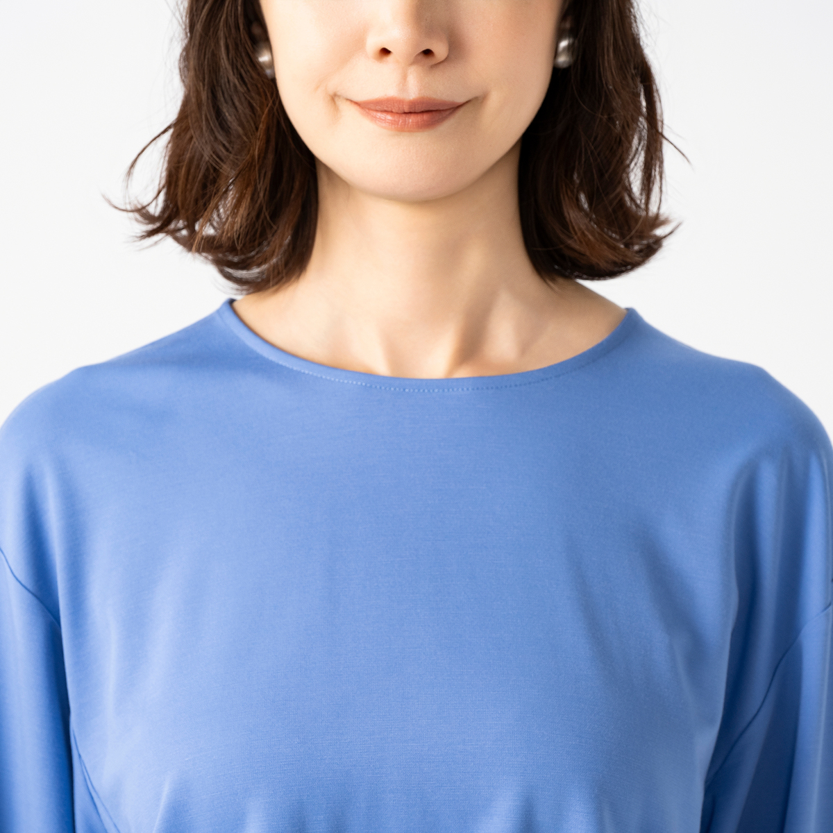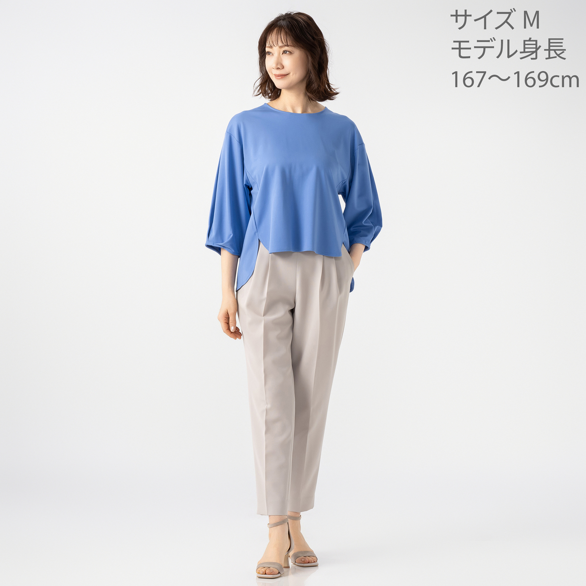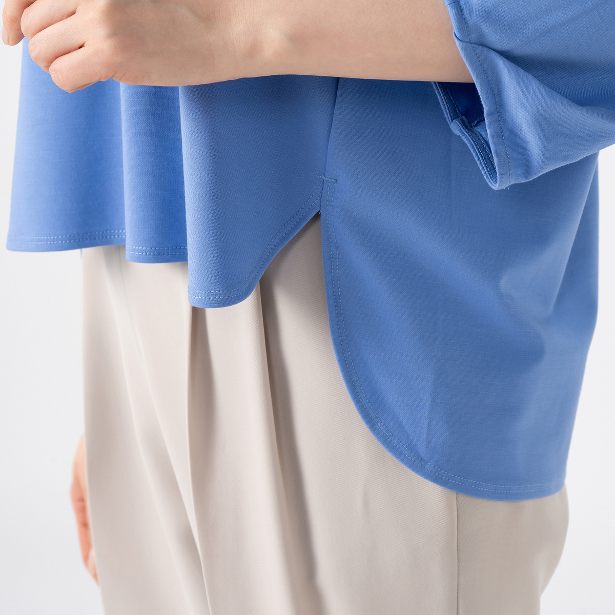 脇のラインを前にふることで、全体的な細見え効果が期待。1枚着るだけでスタイリングが決まり、どんなボトムとも相性が良い、使い勝手の良いアイテムです