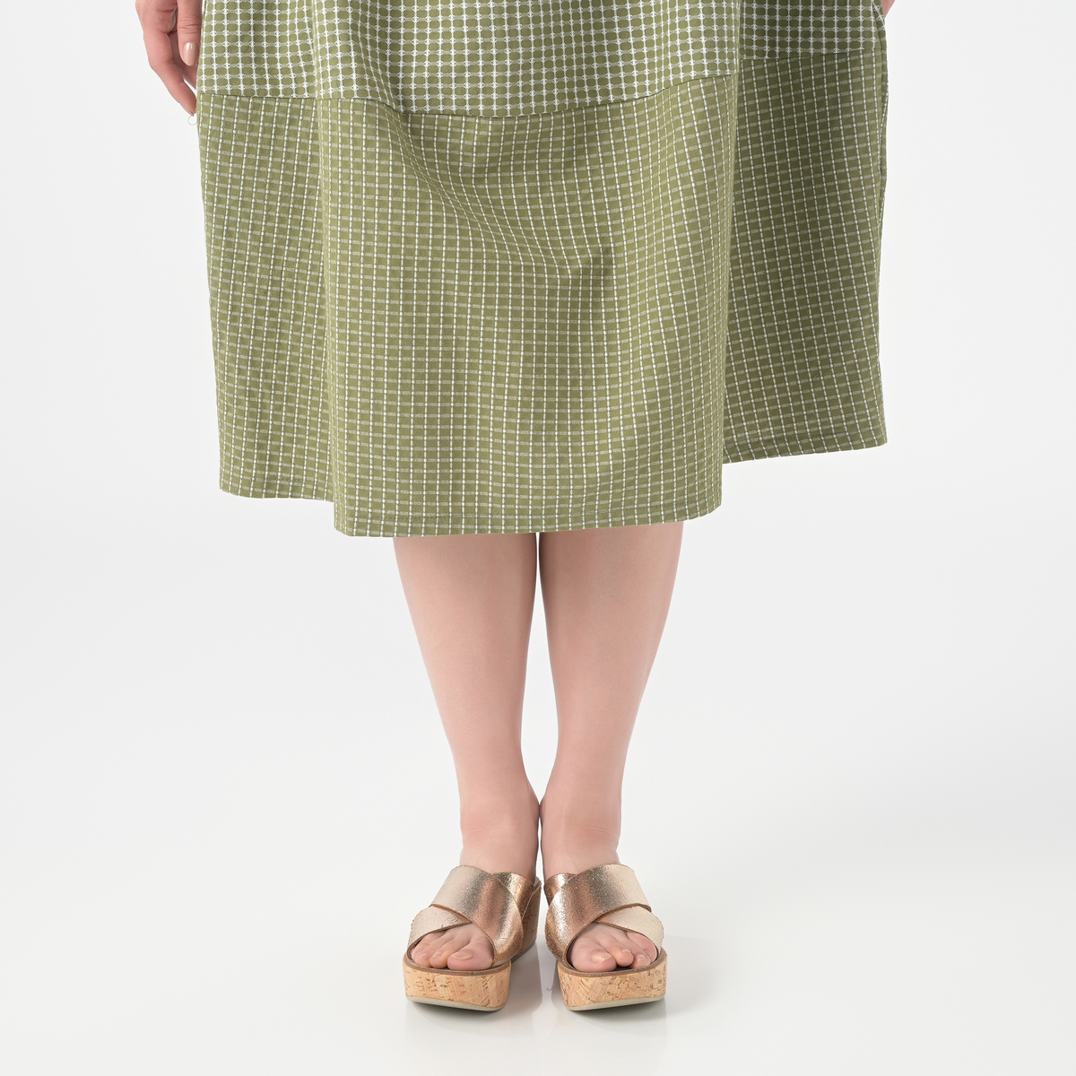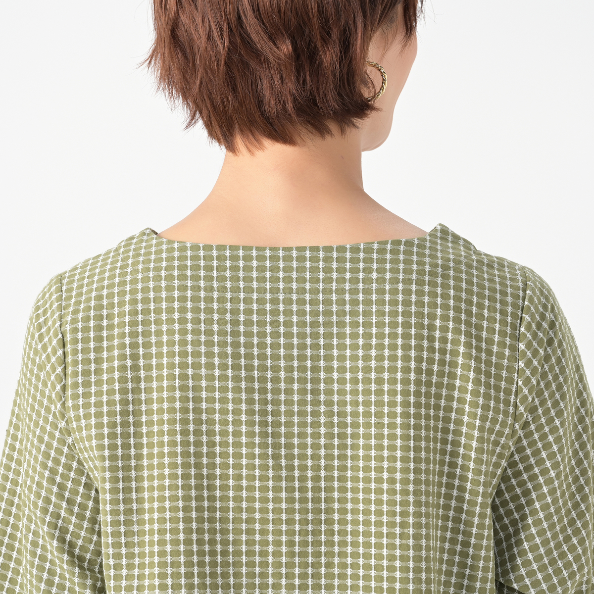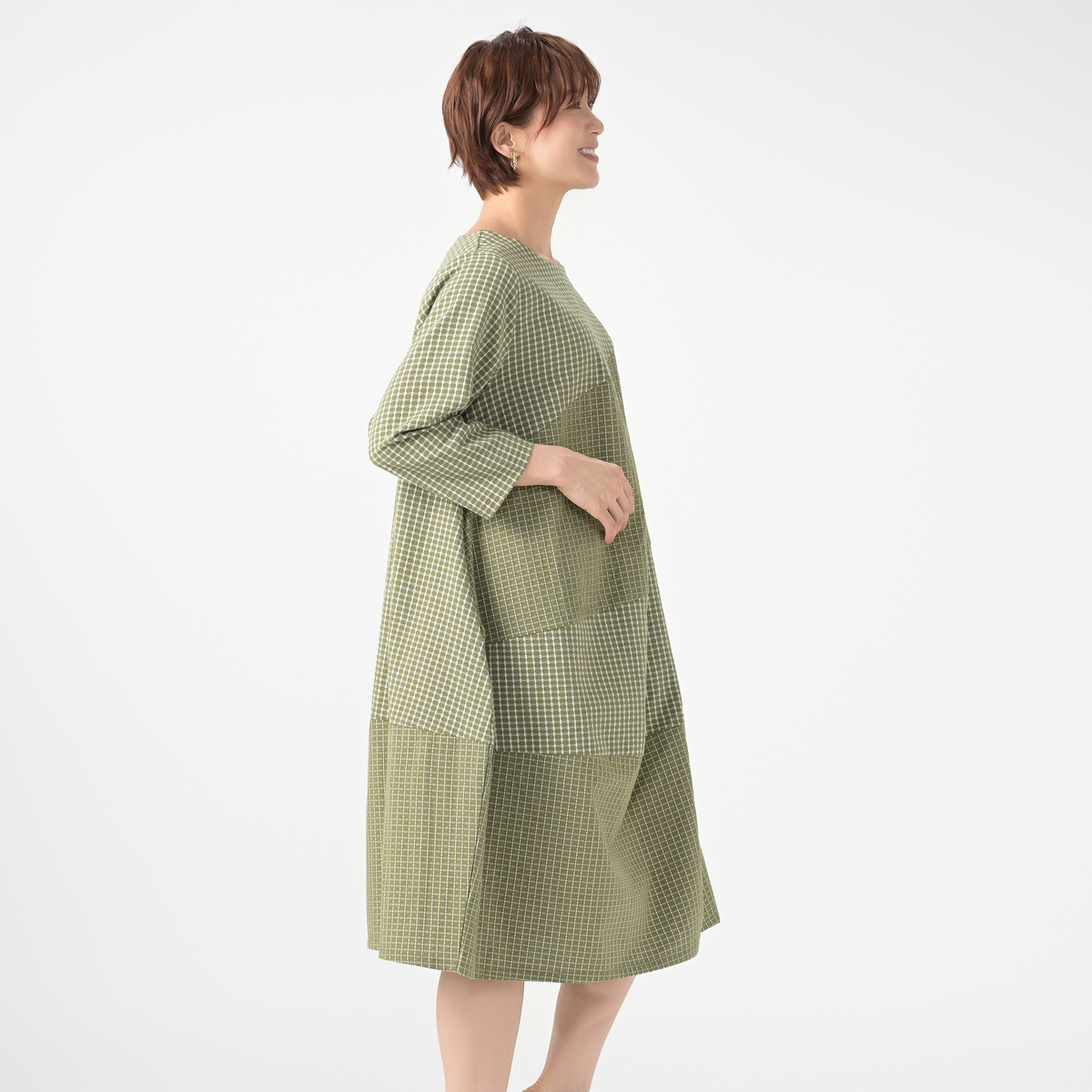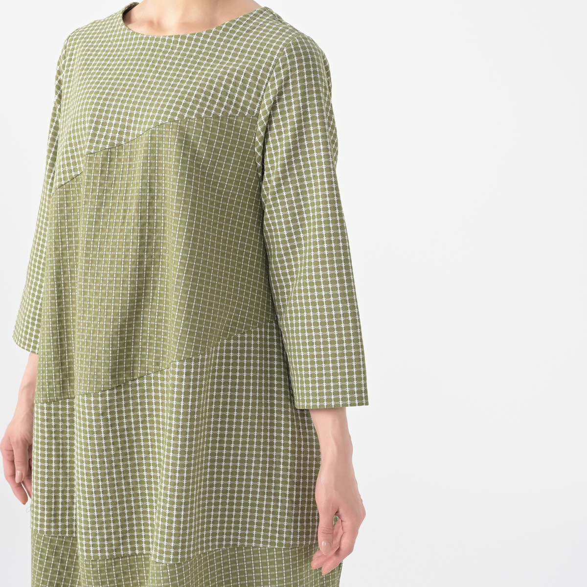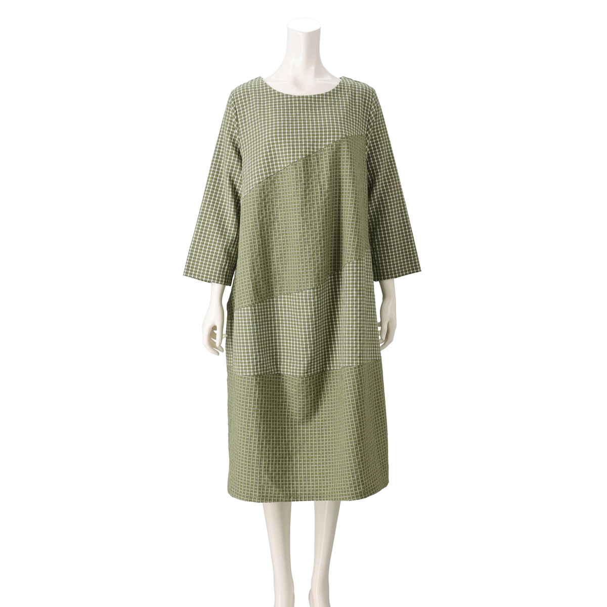 一見シンプルなクルーネックのワンピース。4段に切替えられたパターンで、動きに合わせて表情が変わって見えるデザインです