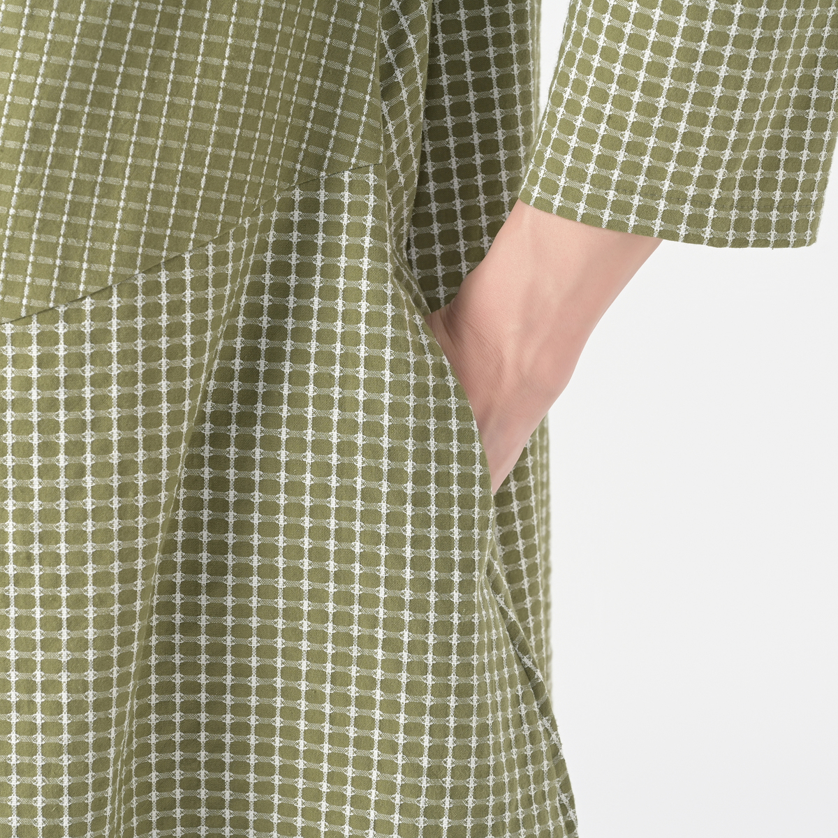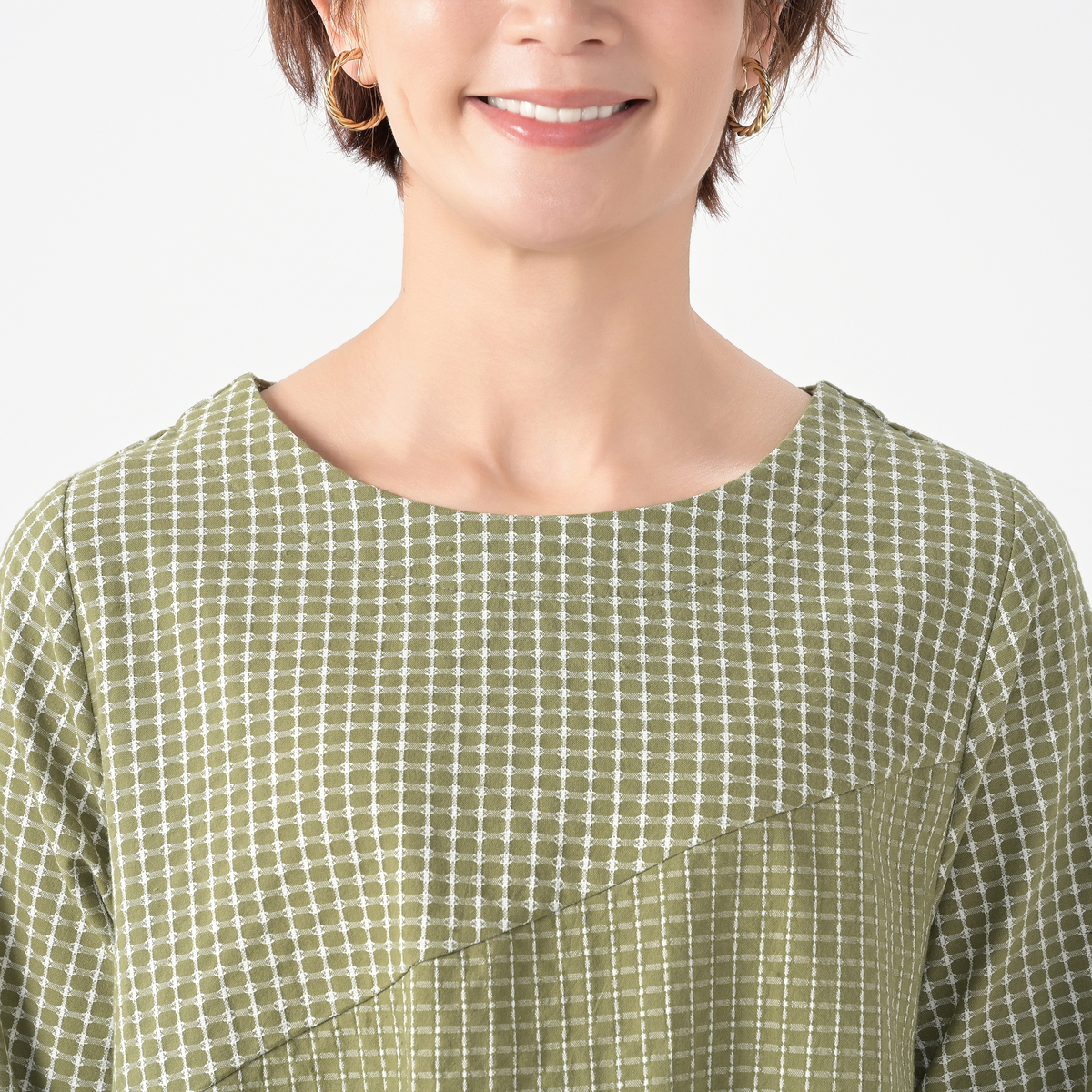 綿が多いのでナチュラルな着心地。細かいチェックが遠目にドット柄に見えるジャガード素材を使用しています
