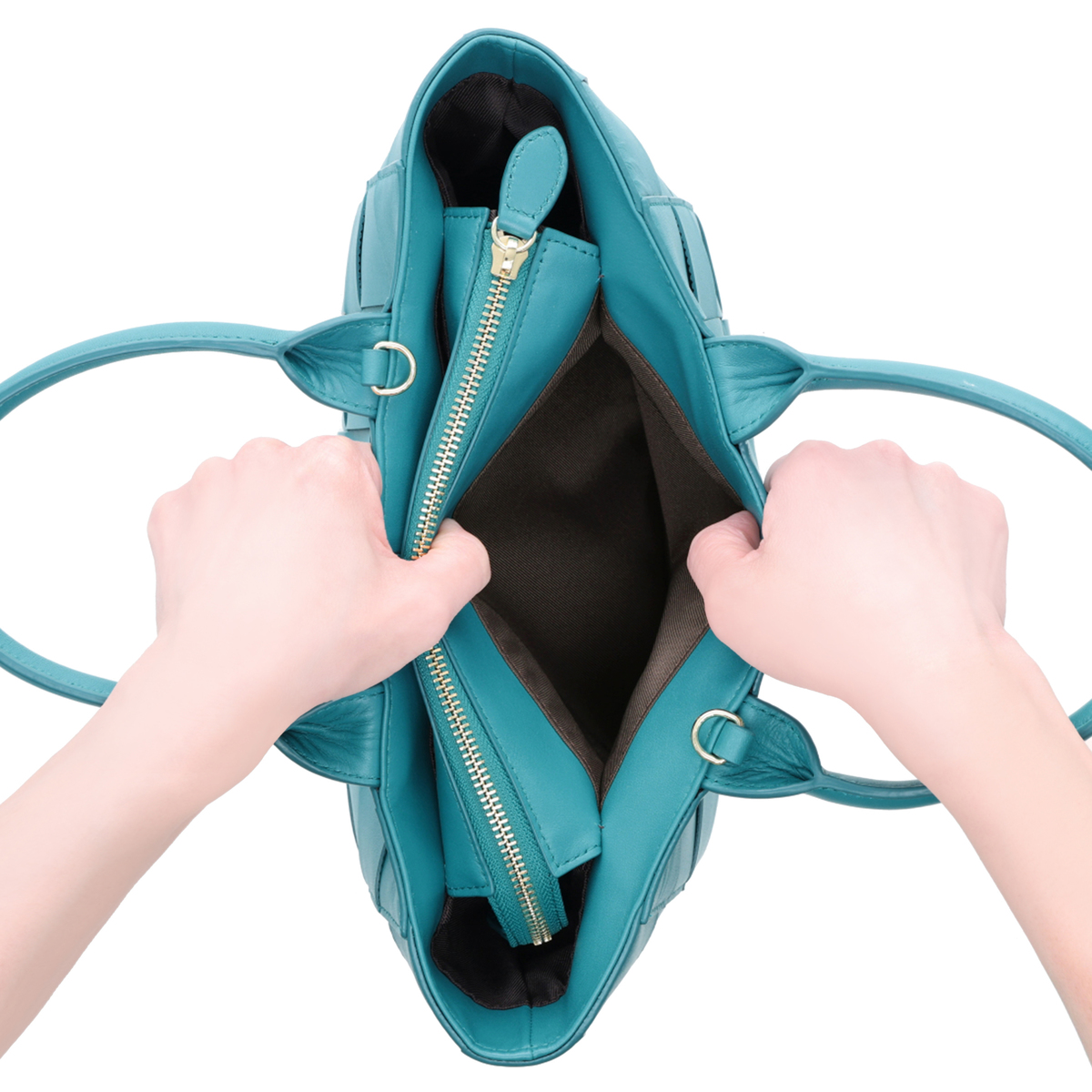 内側には便利なアオリポケット、スマートフォンなども入れやすいオープンポケット、通帳やパスポートなども収納できるファスナーポケット付き。中の仕様にもこだわりました