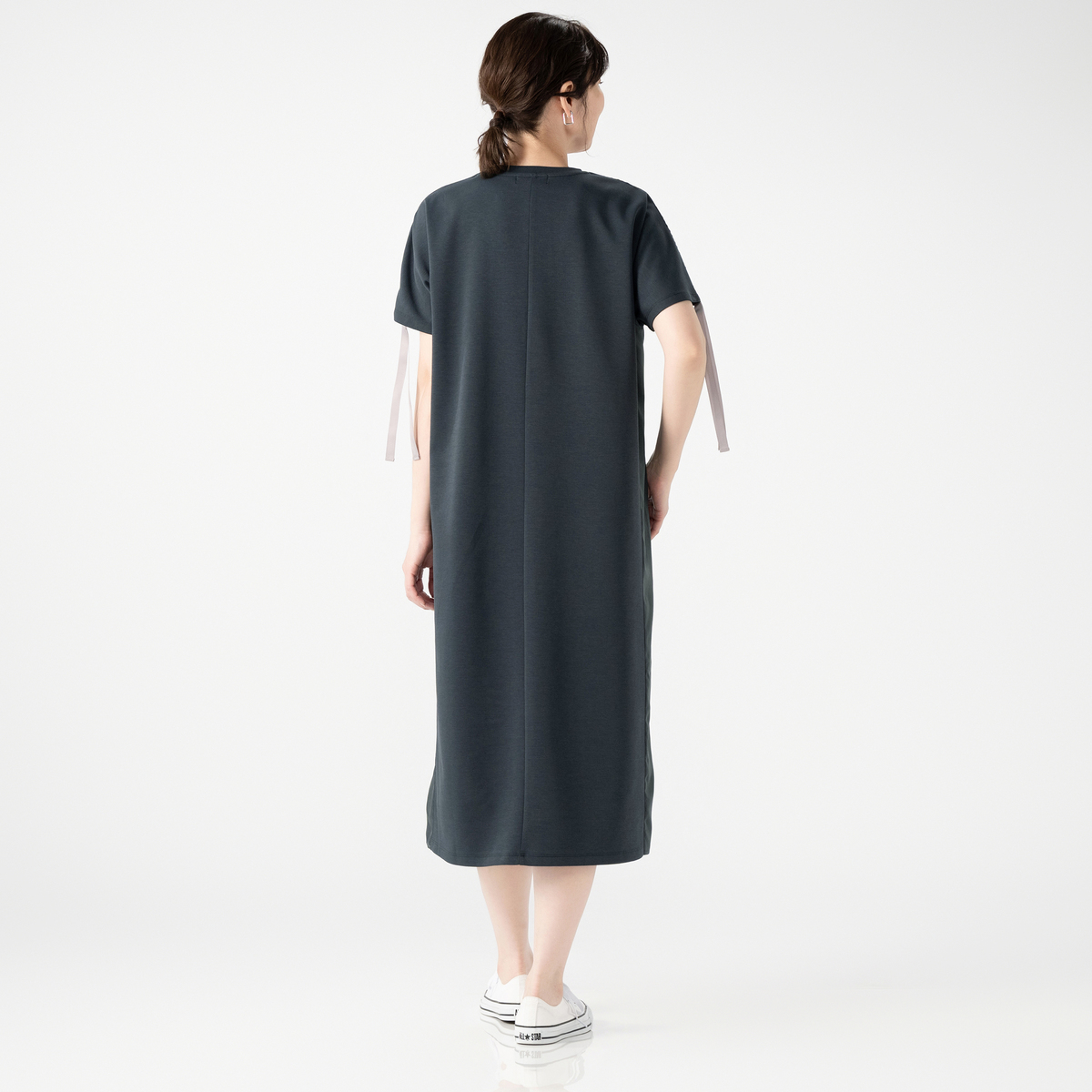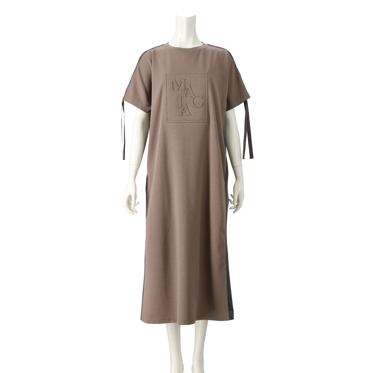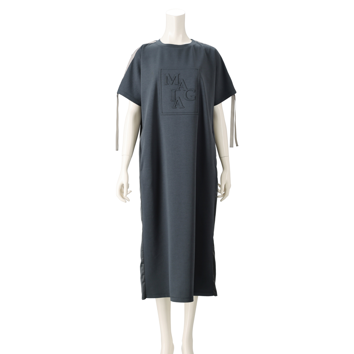綿とポリエステルを混紡させたストレッチダンボールニット素材のワンピース。軽めの素材を使用しているので、ワンピースでも楽々な着用感です。前身頃にエンボス加工でブランドオリジナルのロゴを表現しました