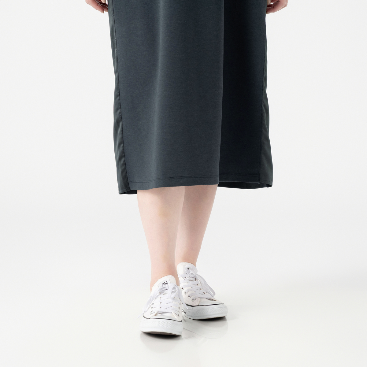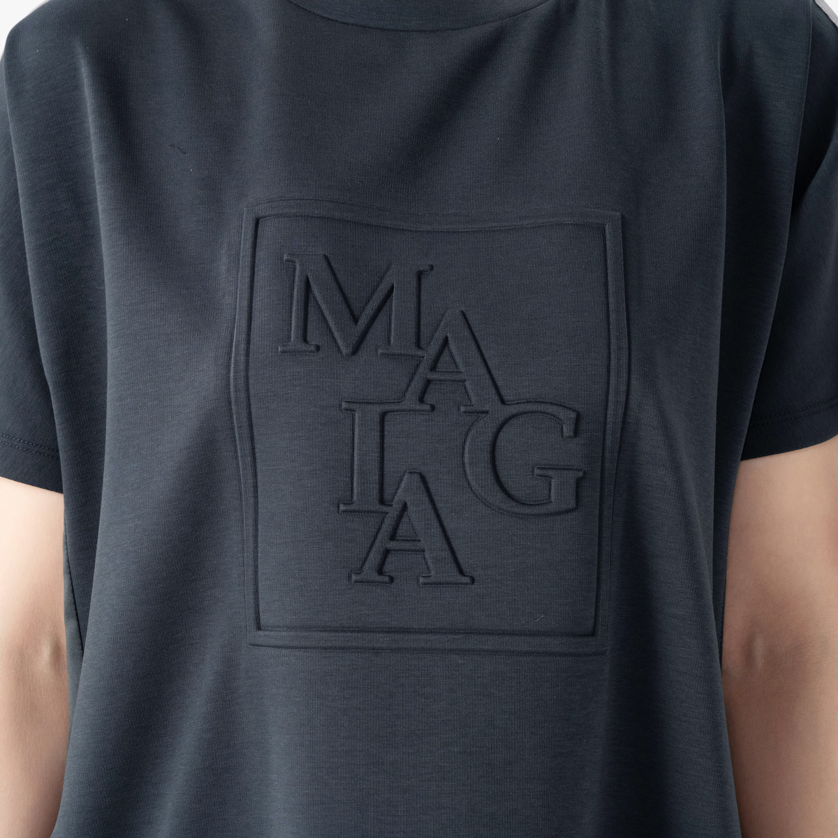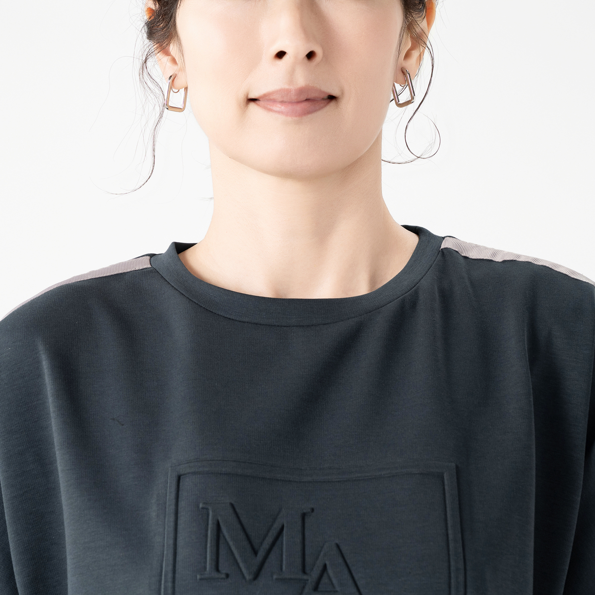 綿とポリエステルを混紡させたストレッチダンボールニット素材のワンピース。軽めの素材を使用しているので、ワンピースでも楽々な着用感です。前身頃にエンボス加工でブランドオリジナルのロゴを表現しました