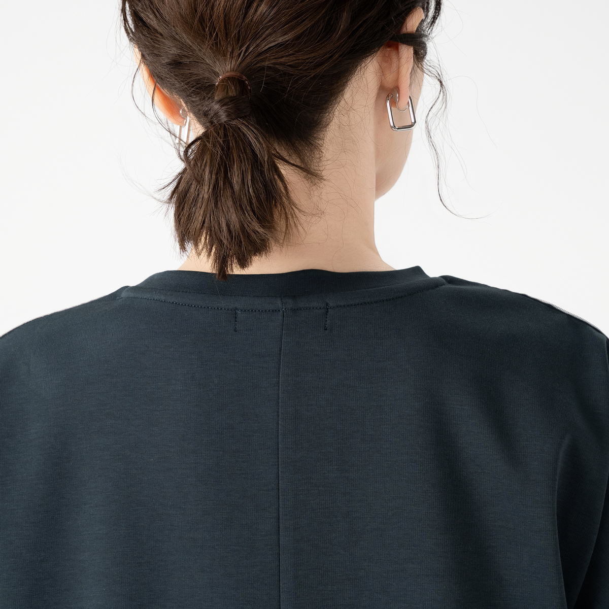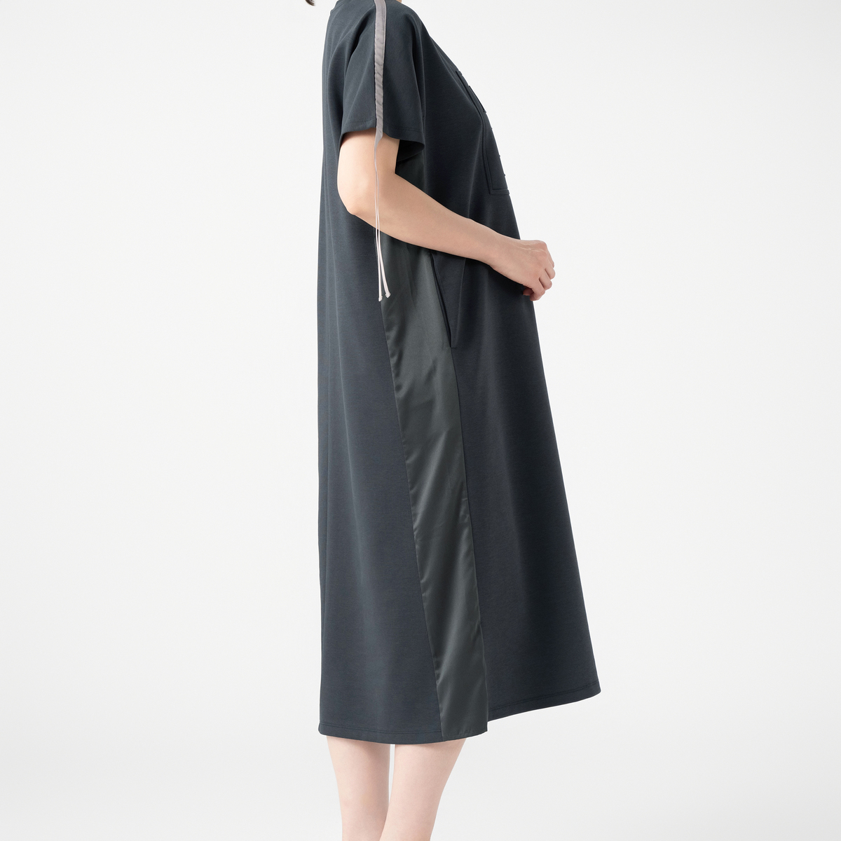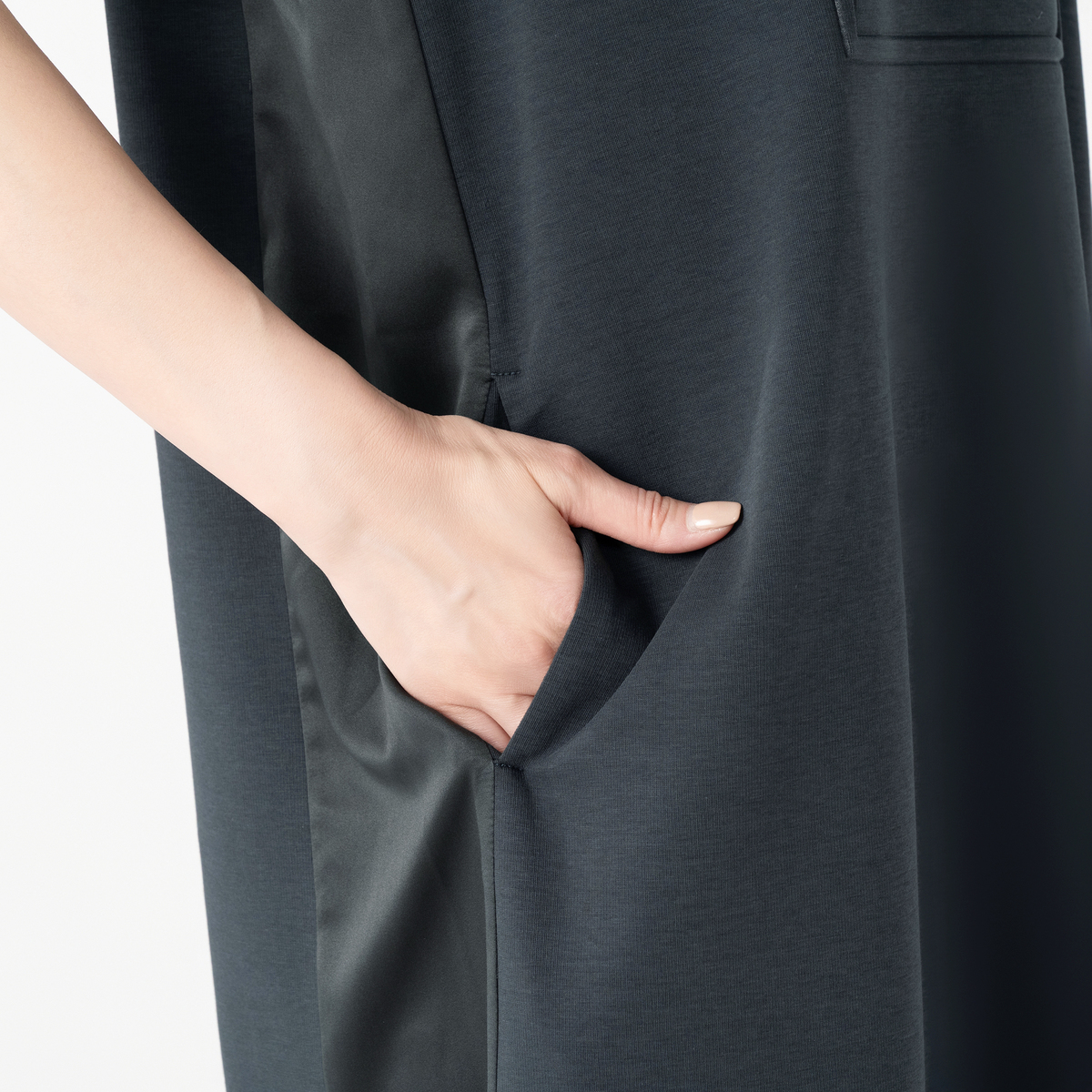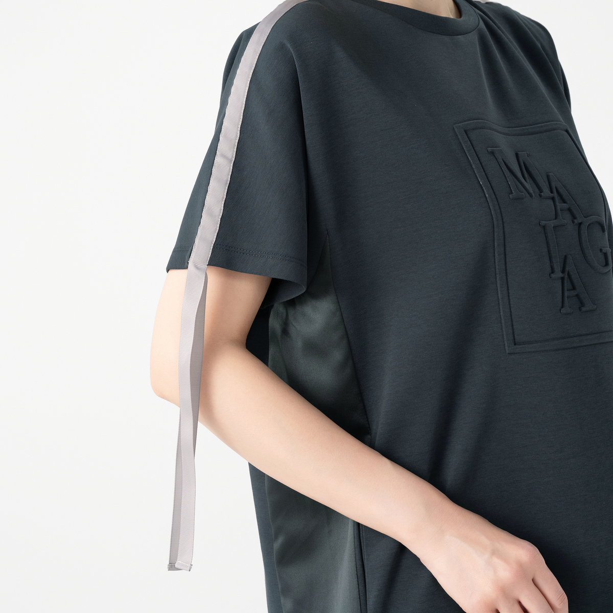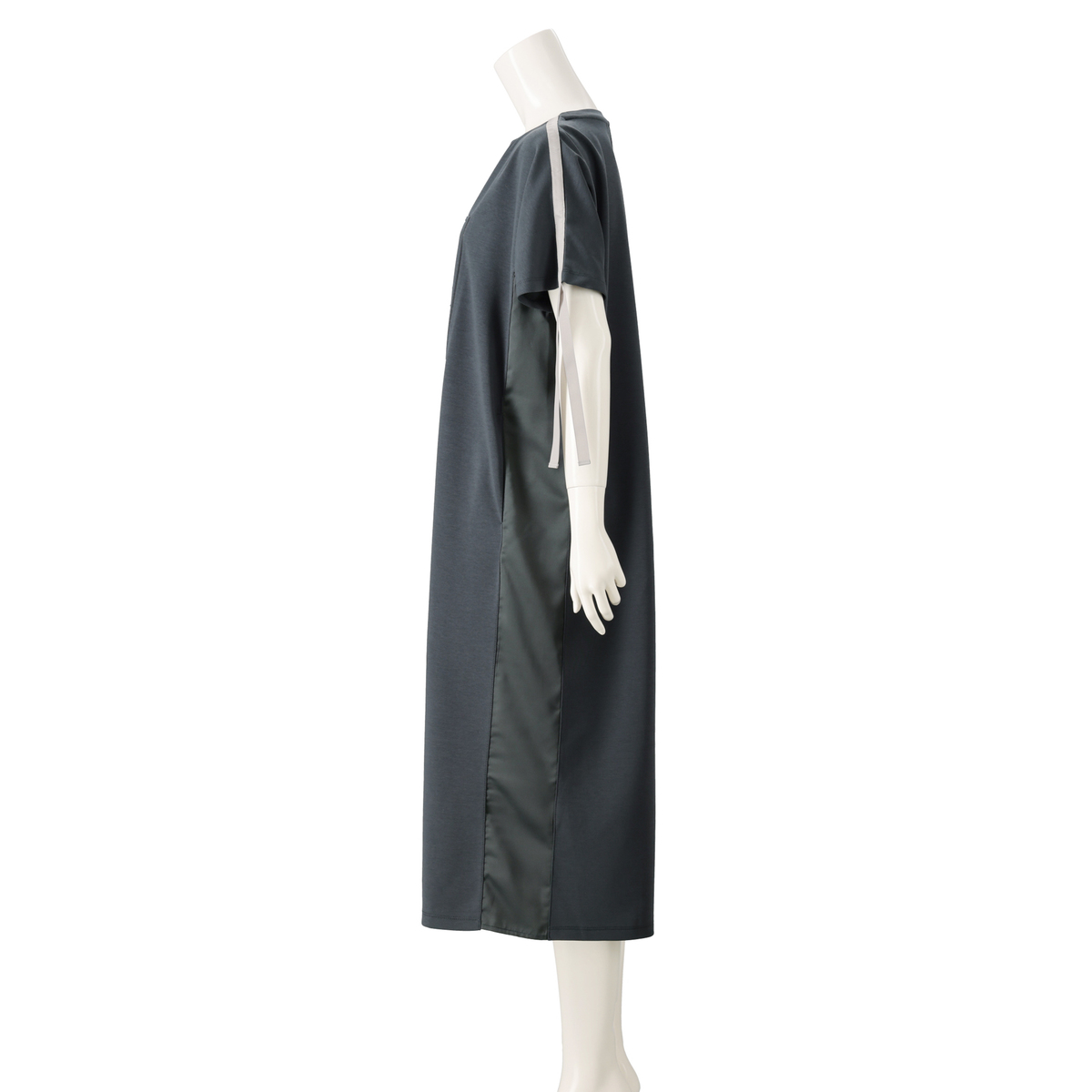 肩に配色でグログランテープを施し、脇にもアクセントになるよう配色で微光沢感のあるマッドサテンを使用。エッジの効いたデザインに仕上げています