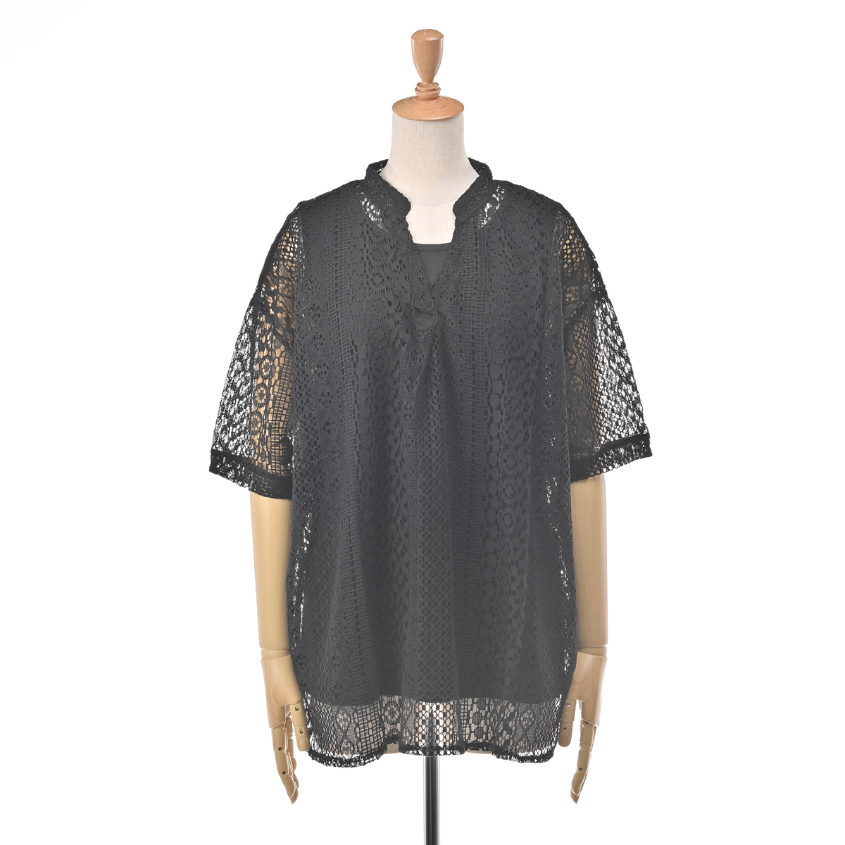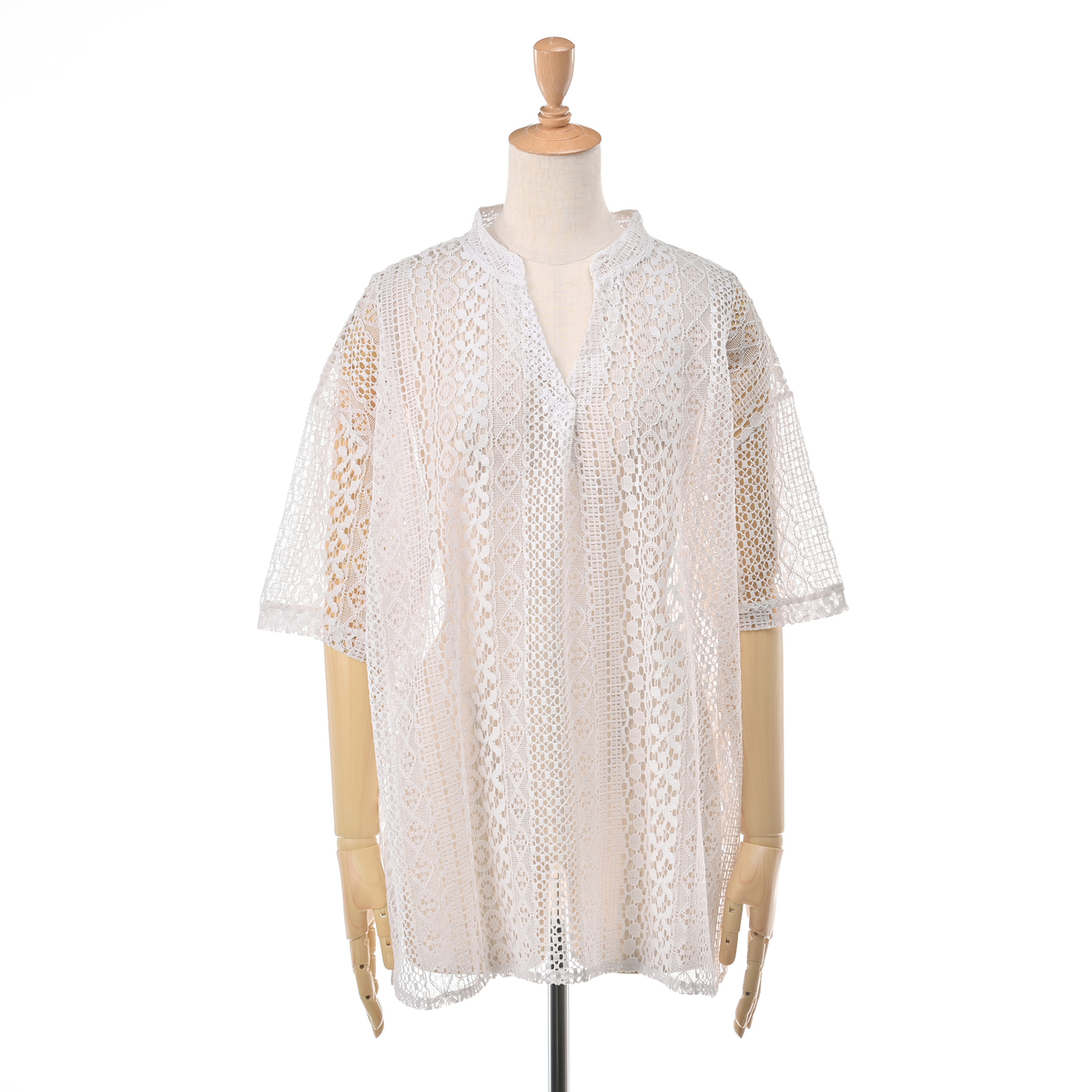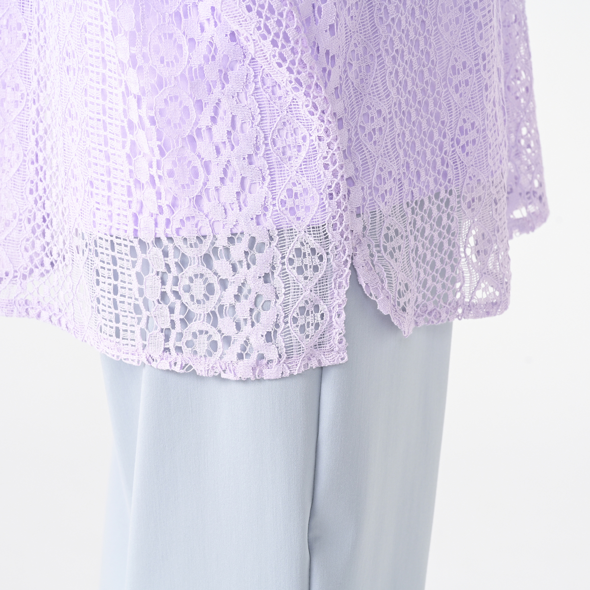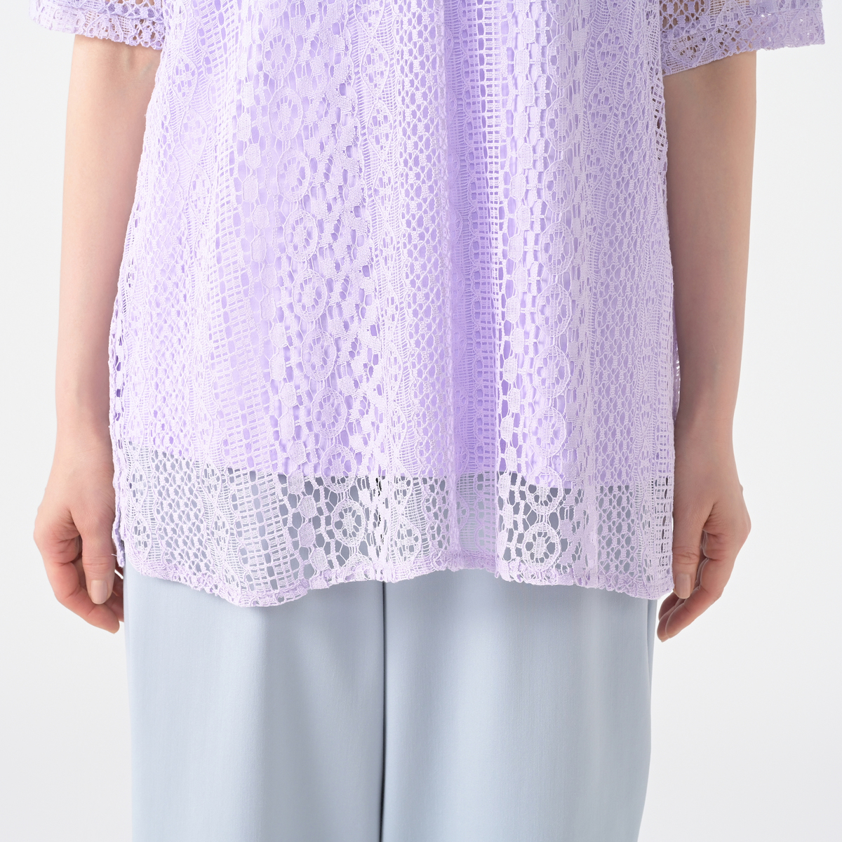 気になるヒップや二の腕をしっかりカバーしながら、小花柄の綿混レースが大人の抜け感を演出してくれる総レースのトップスです。
