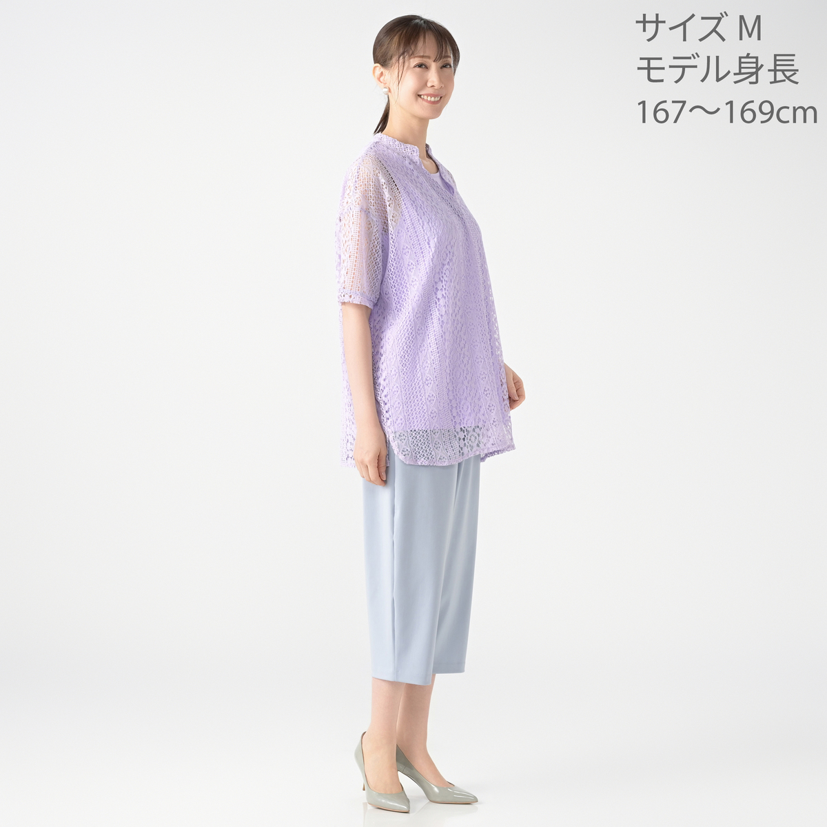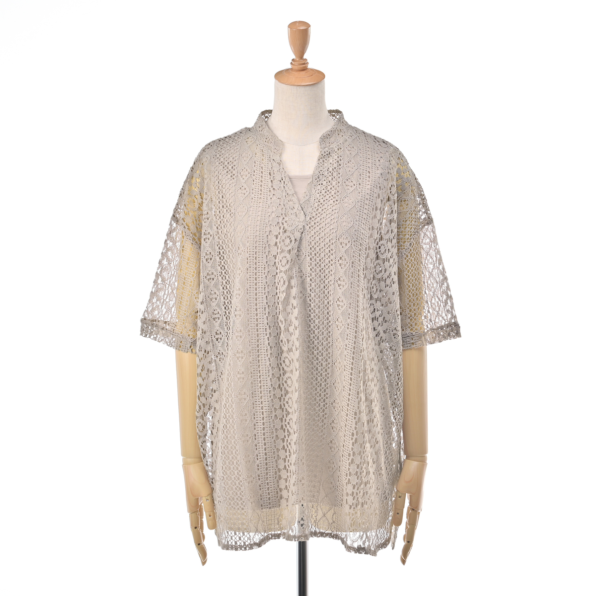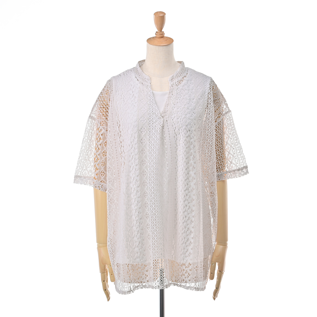 気になるヒップや二の腕をしっかりカバーしながら、小花柄の綿混レースが大人の抜け感を演出してくれる総レースのトップスです。