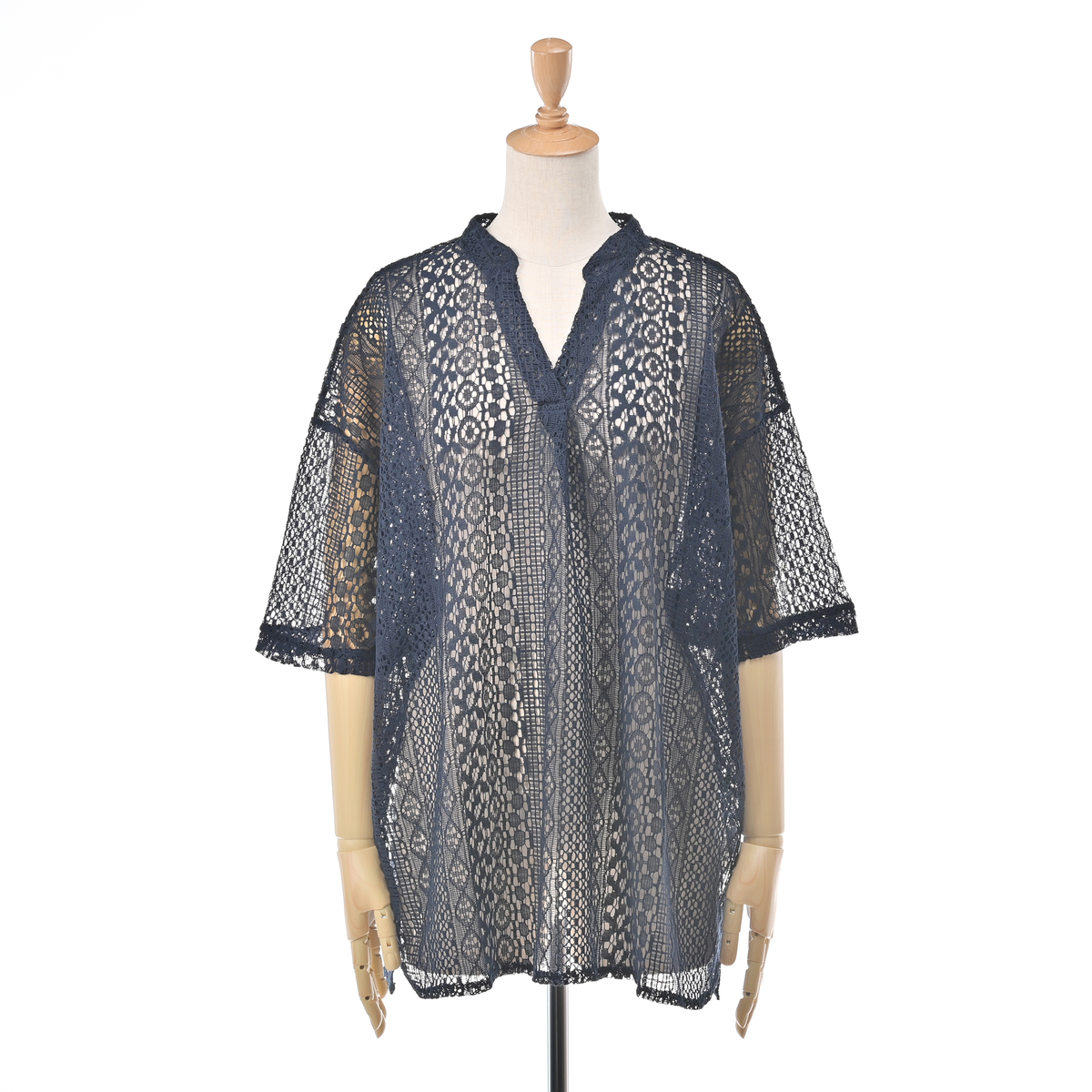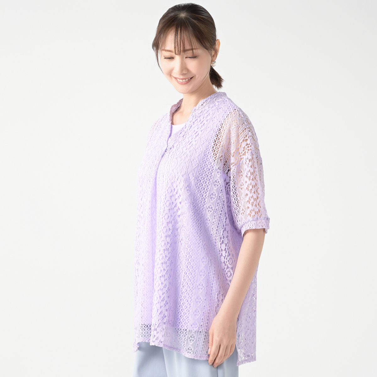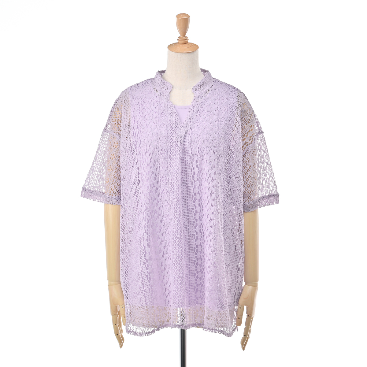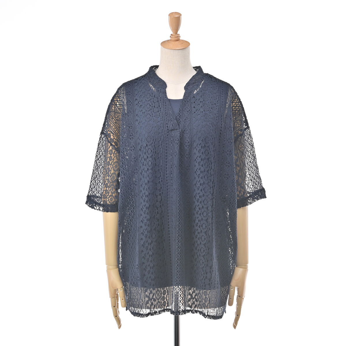 気になるヒップや二の腕をしっかりカバーしながら、小花柄の綿混レースが大人の抜け感を演出してくれる総レースのトップスです。