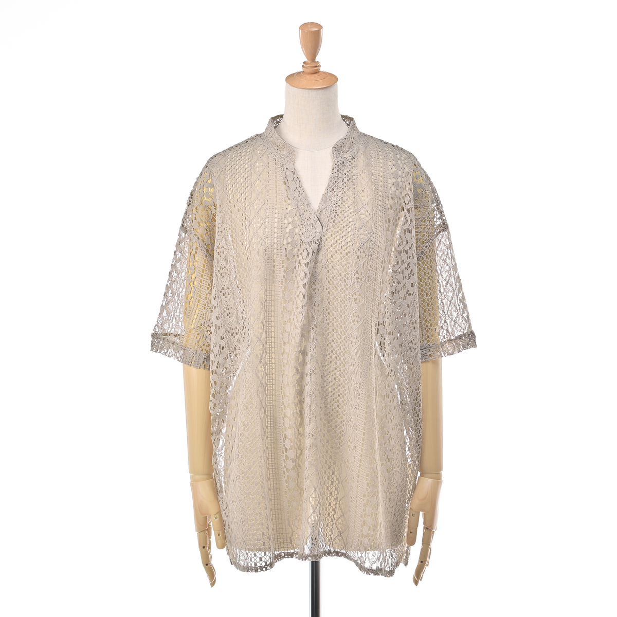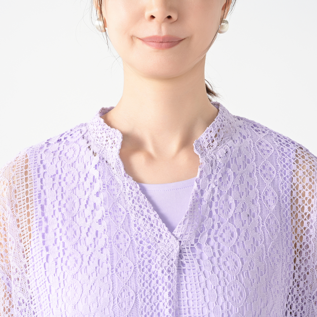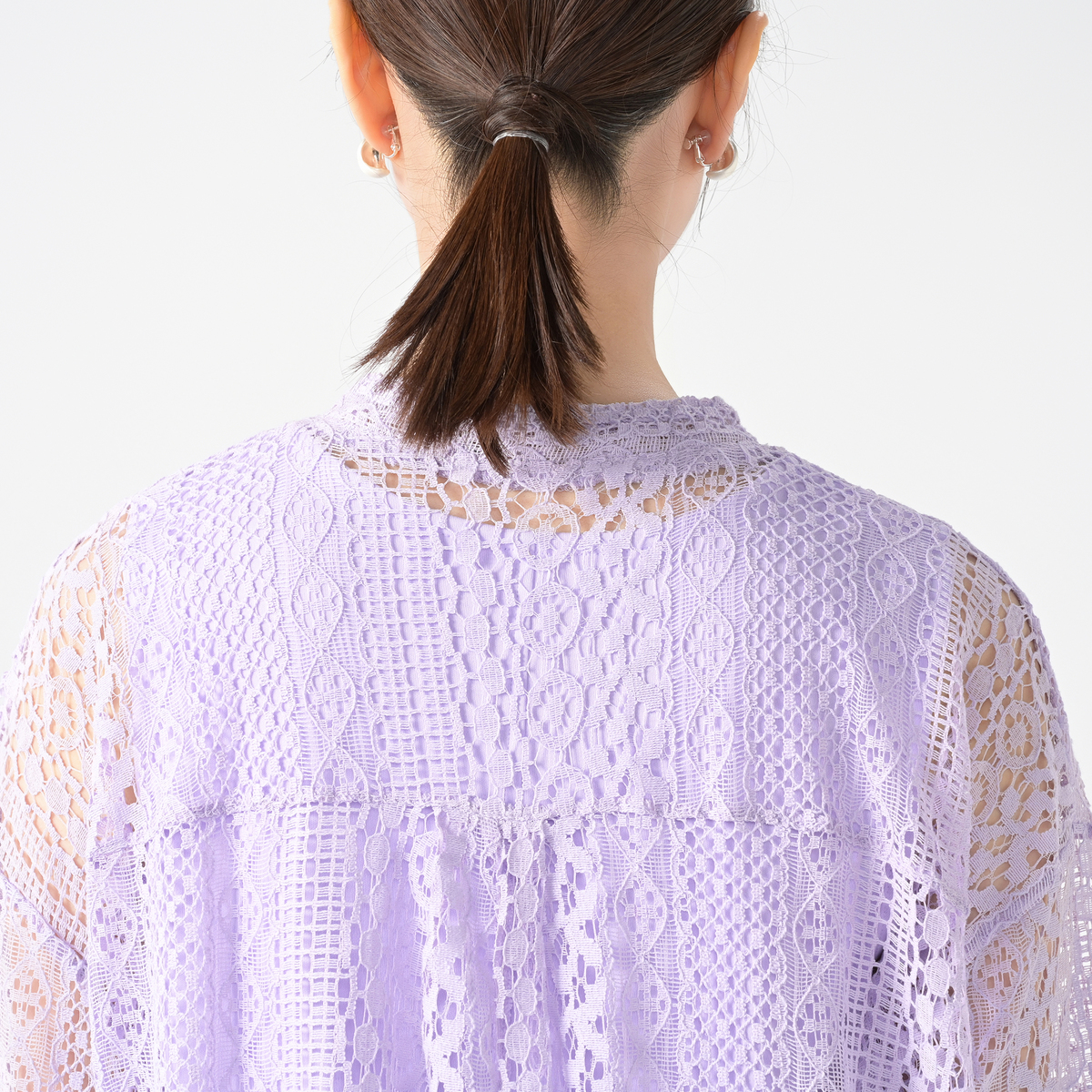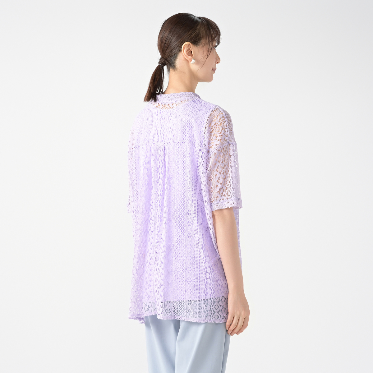 縦に小花柄が入った綿混レース生地を使用。ほどよい透け感とハリ感があり、甘すぎず上品に着こなせます。オーバーサイズシルエットで、衿元はスキッパー開きのデザイン。衿を抜いて、こなれた印象で着こなしてもおしゃれに決まります