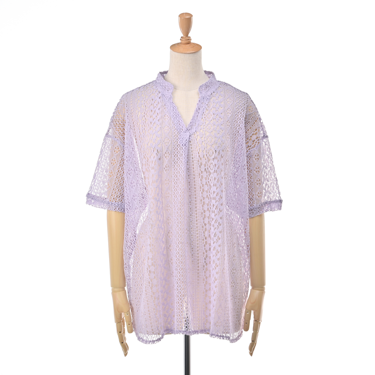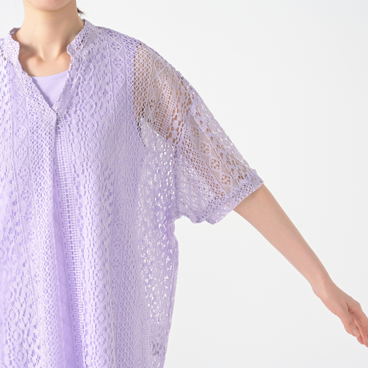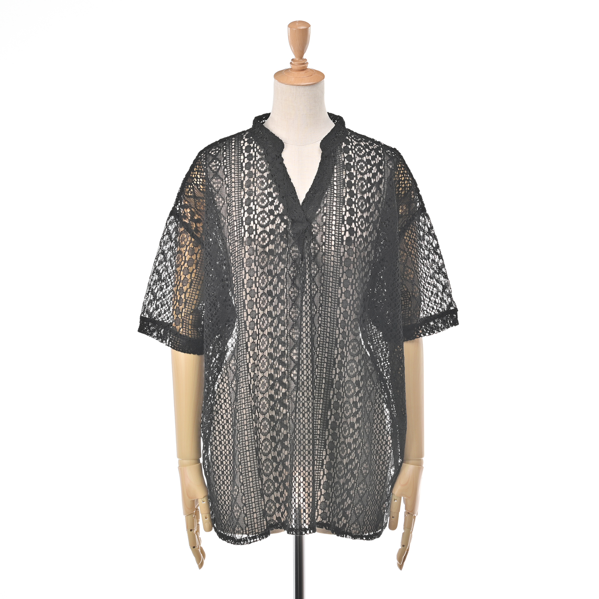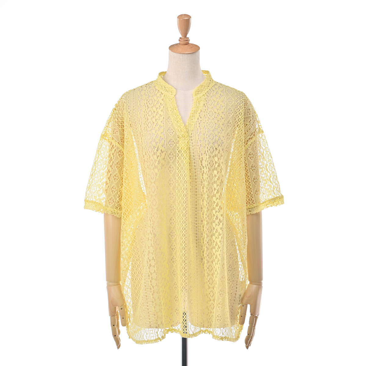縦に小花柄が入った綿混レース生地を使用。ほどよい透け感とハリ感があり、甘すぎず上品に着こなせます。オーバーサイズシルエットで、衿元はスキッパー開きのデザイン。衿を抜いて、こなれた印象で着こなしてもおしゃれに決まります