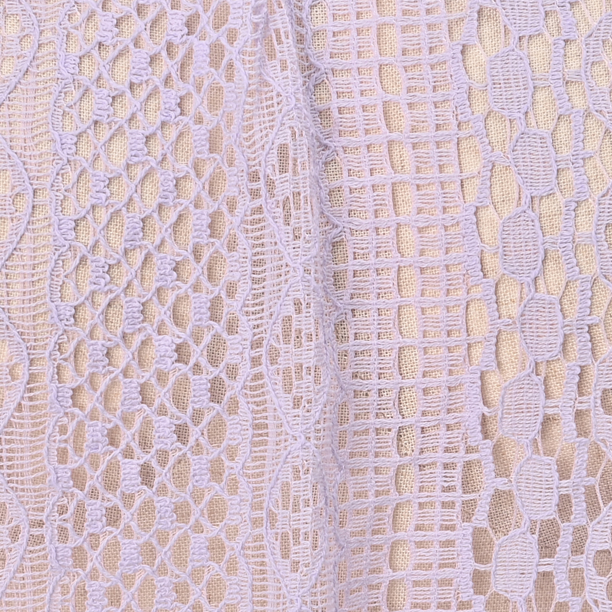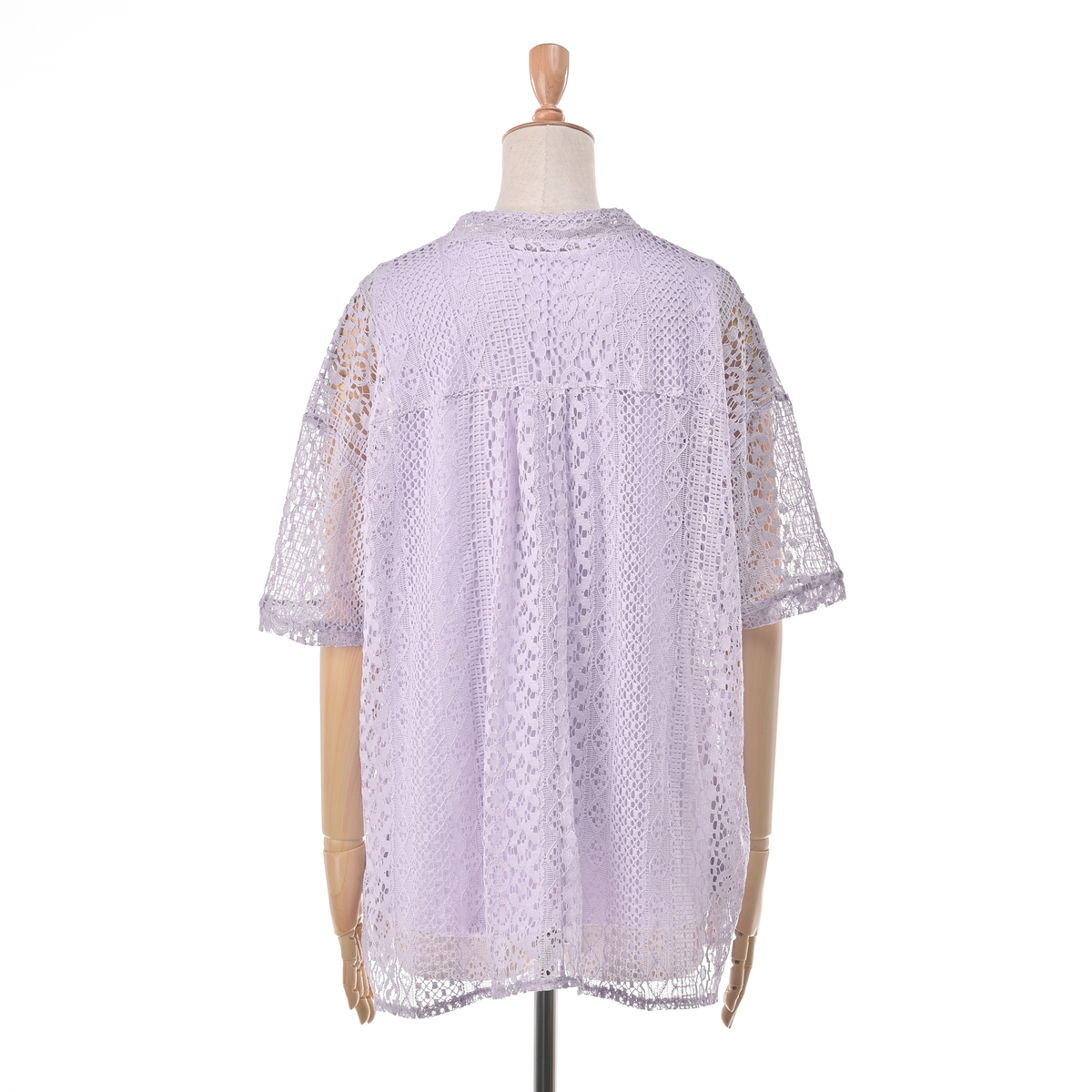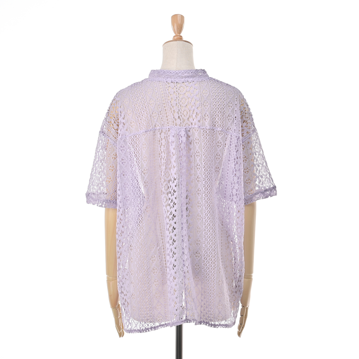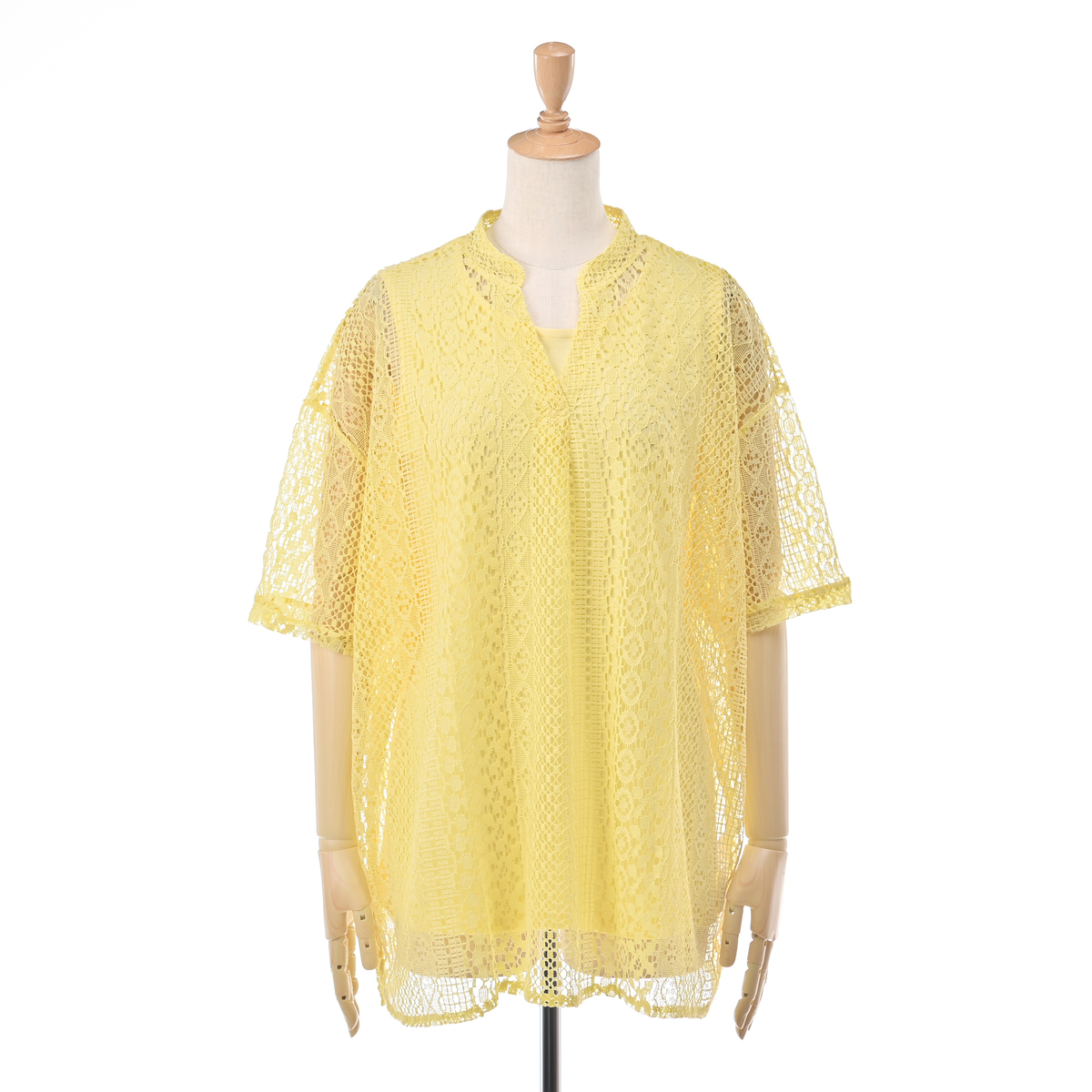 縦に小花柄が入った綿混レース生地を使用。ほどよい透け感とハリ感があり、甘すぎず上品に着こなせます。オーバーサイズシルエットで、衿元はスキッパー開きのデザイン。衿を抜いて、こなれた印象で着こなしてもおしゃれに決まります
