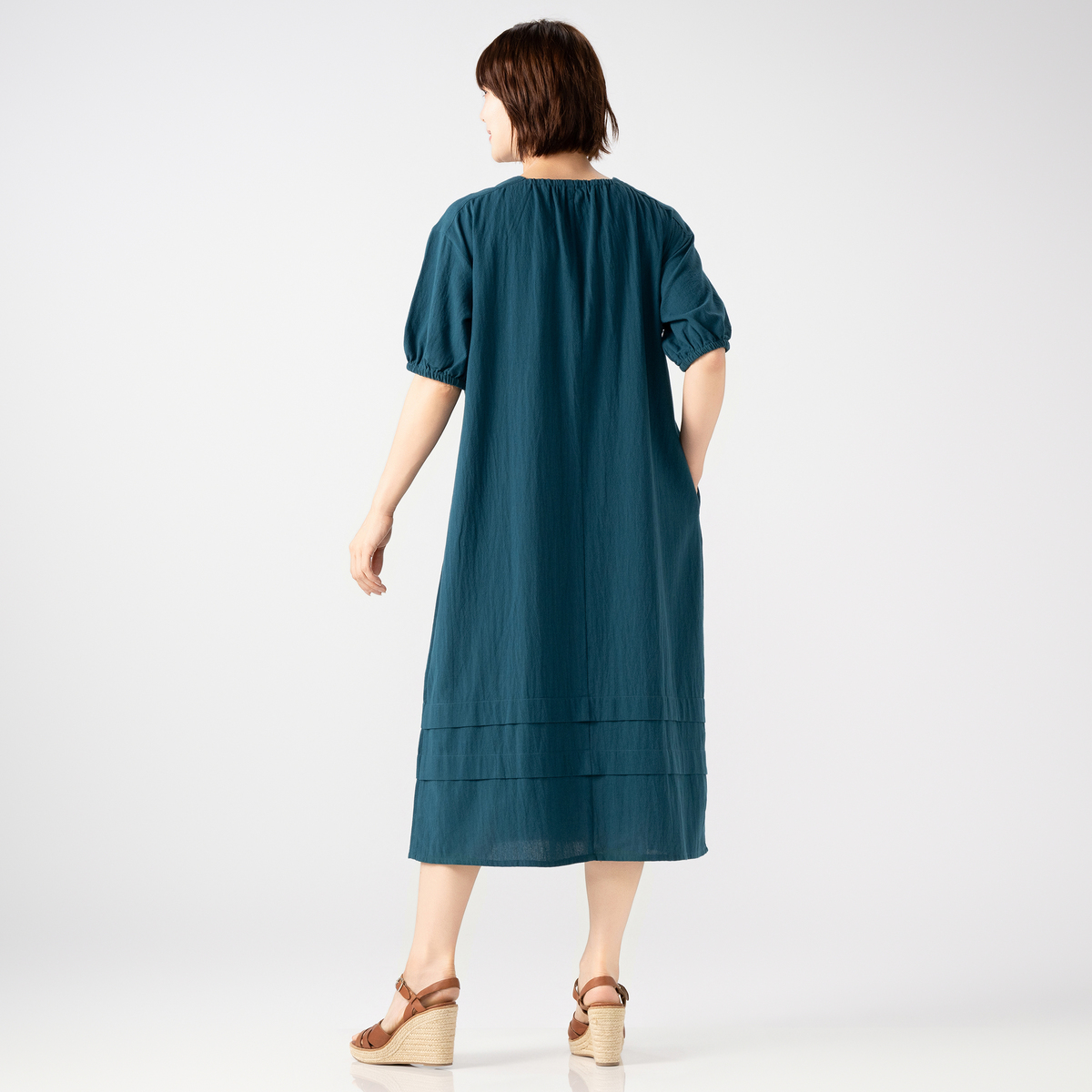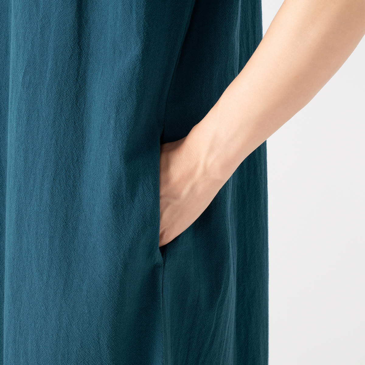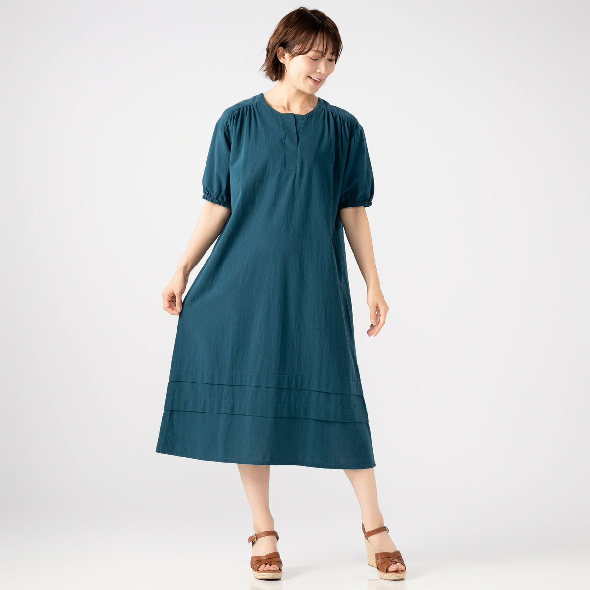 着心地の良いコットン素材のワンピース。ストーンウォッシュ加工をする事で自然なシワ感の凹凸が出て、肌にまとわりつきにくくサラリとした清涼感のあるドライタッチの風合いに。薄手ながら適度なふくらみがあり、軽やかで透けにくい仕上がりです