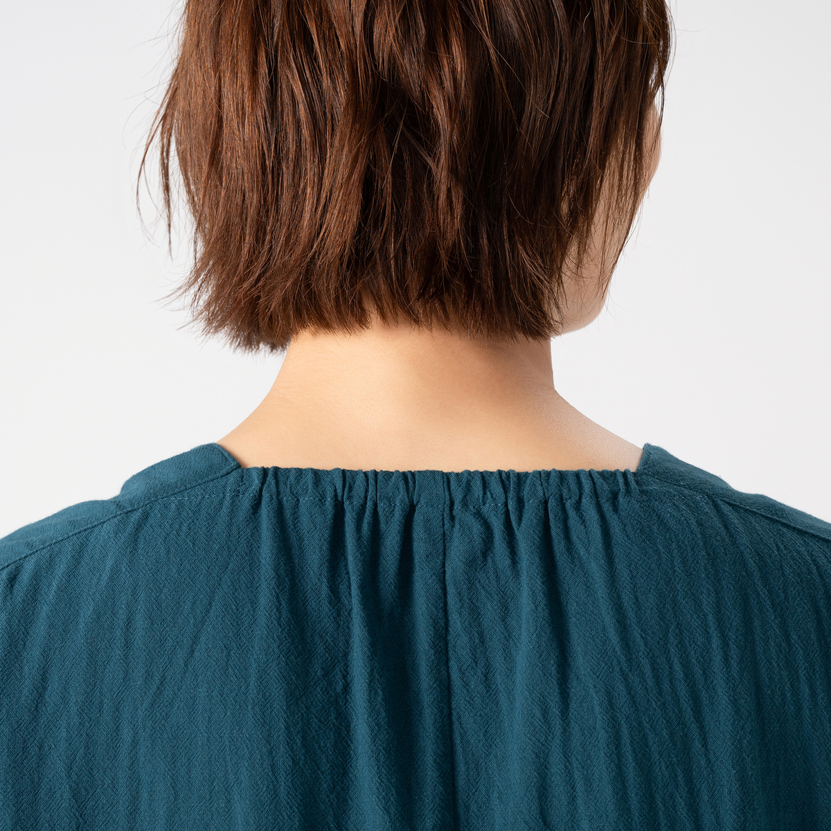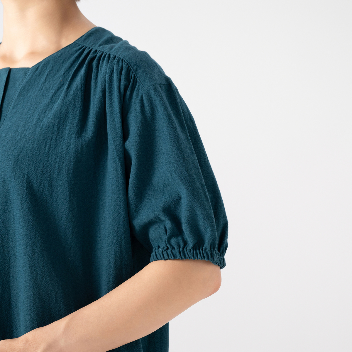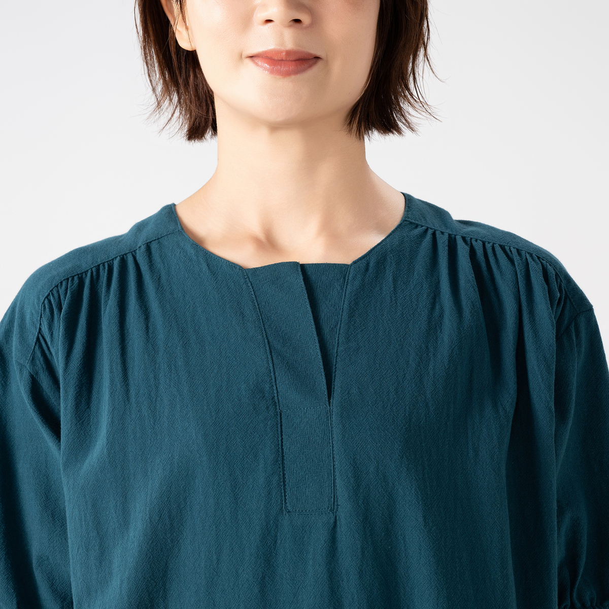 ヨーク切替や後ろギャザーでふんわりとしたシルエットに。袖は6分袖でさりげなく二の腕をカバーし、ドロップショルダーは、肩周りやアームホールにゆとりがあり楽な着心地です。裾に向かって広がるラインで締め付け感がなく、リラックスして着こなせます
