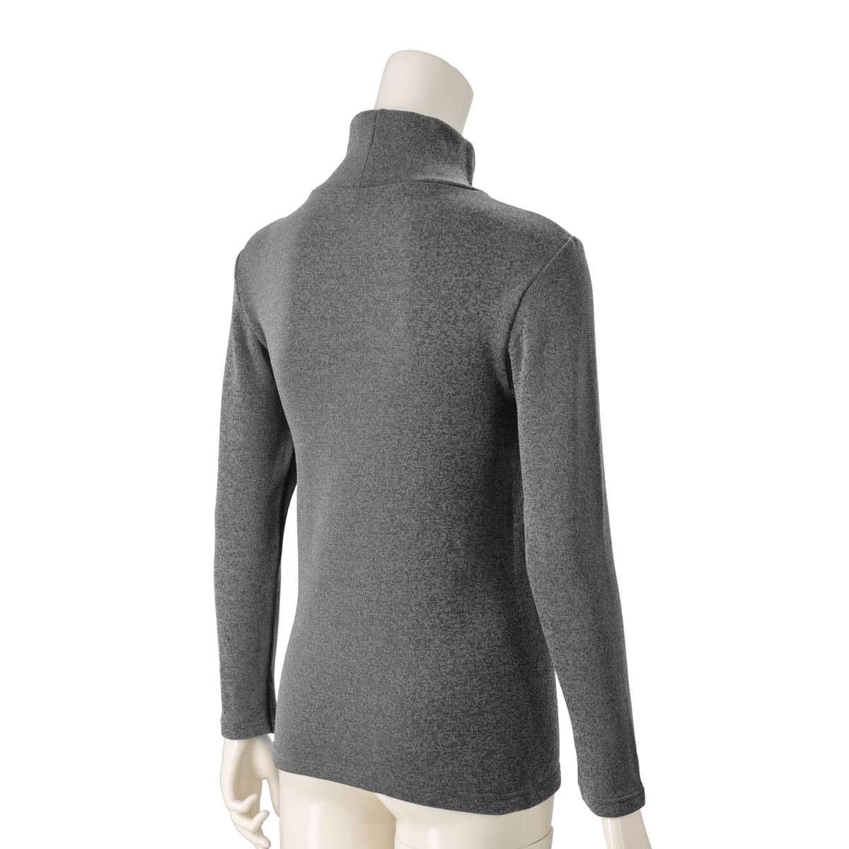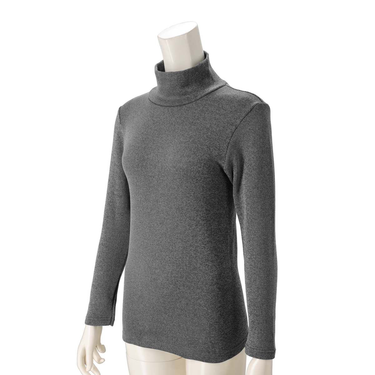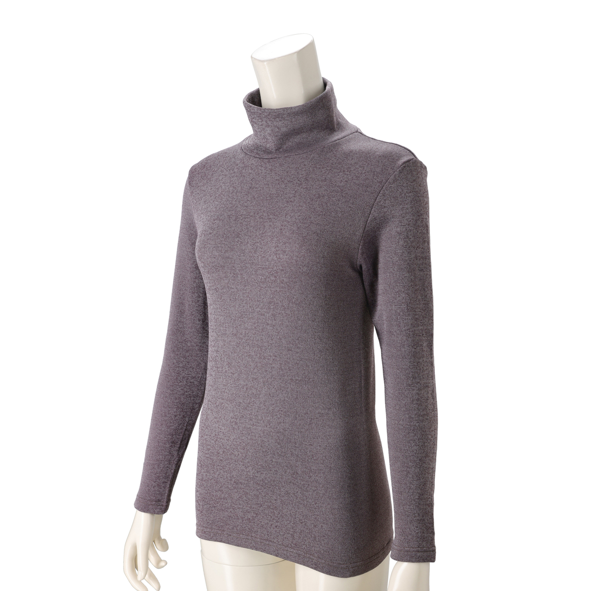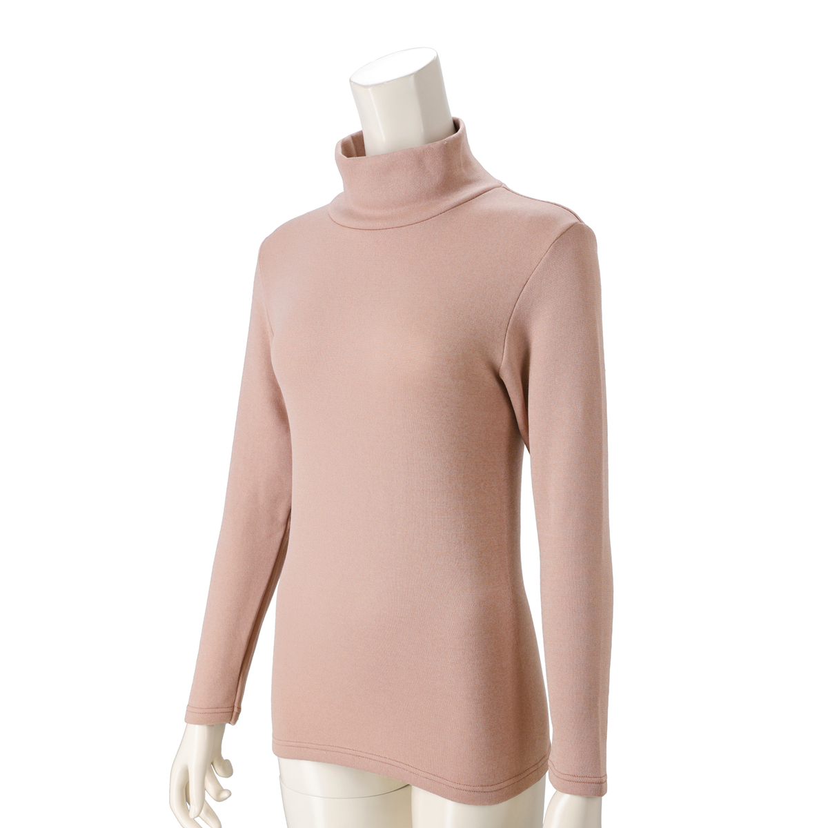 首元からの冷気をシャットアウトするハイネックタイプ。袖丈も長めに設計し、手首までしっかりカバーします。ストレッチ性のある、やわらかな着心地で動きやすく。脇には縫い目のない丸編み仕様。縫い目によるゴロつきがなく、チクチク感や違和感を軽減します