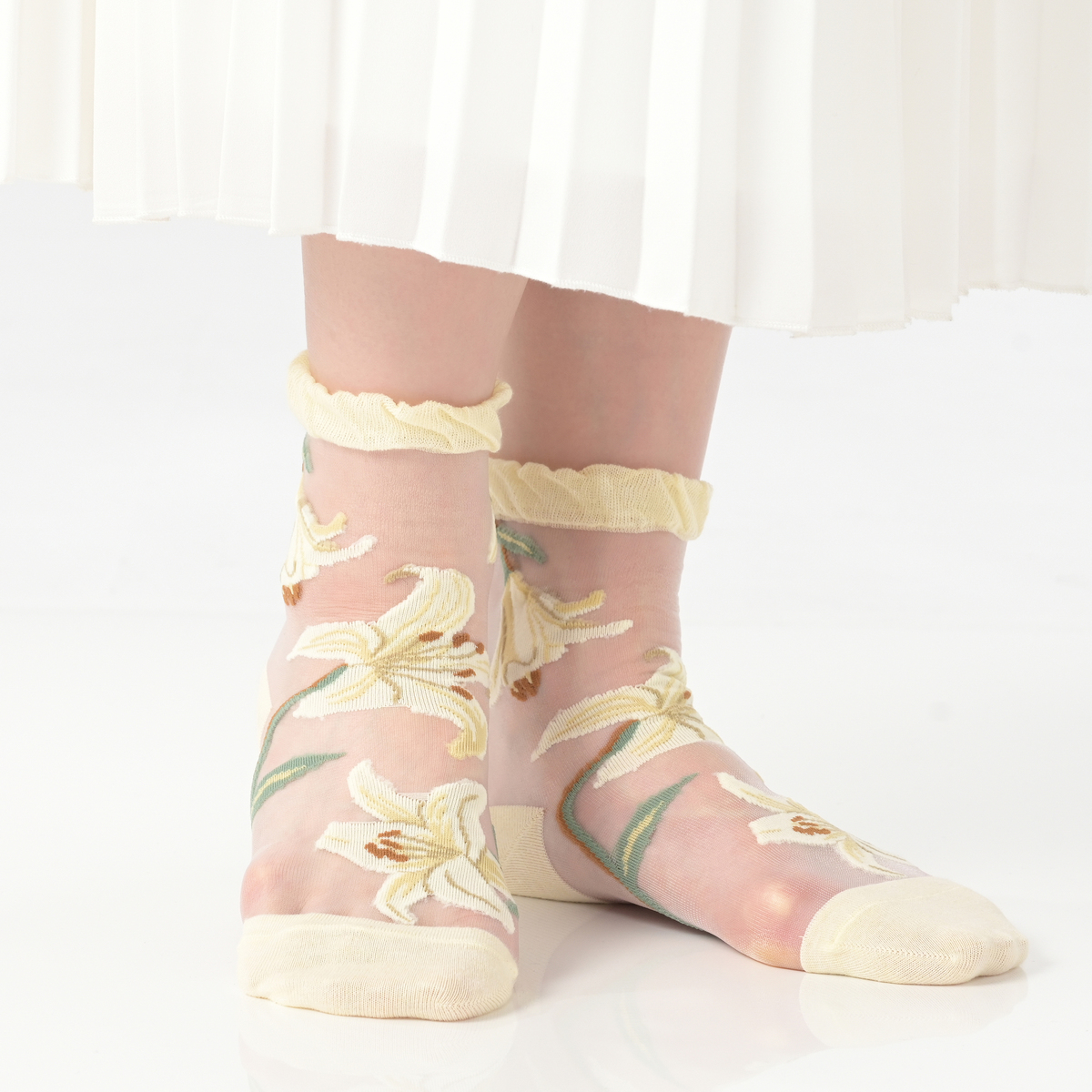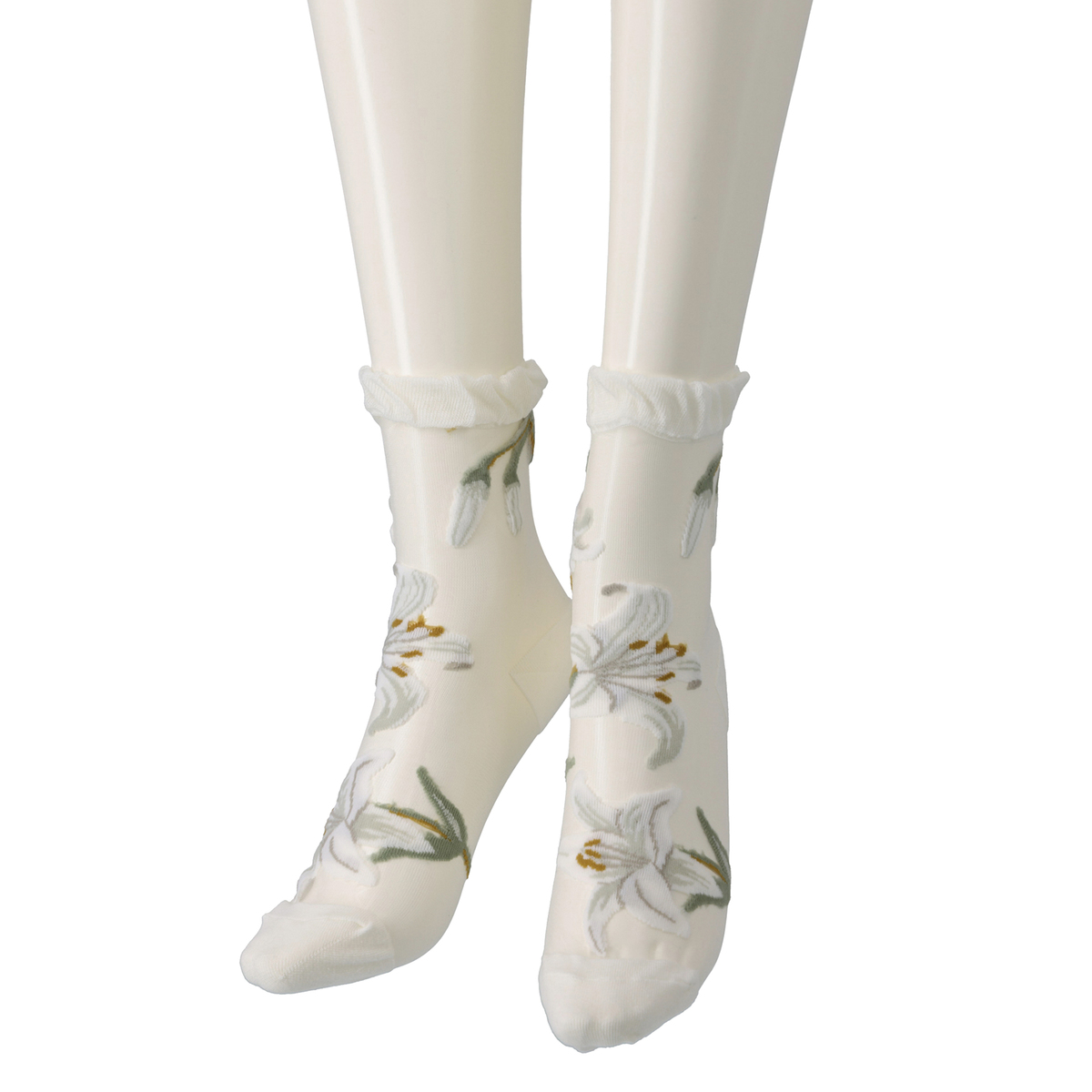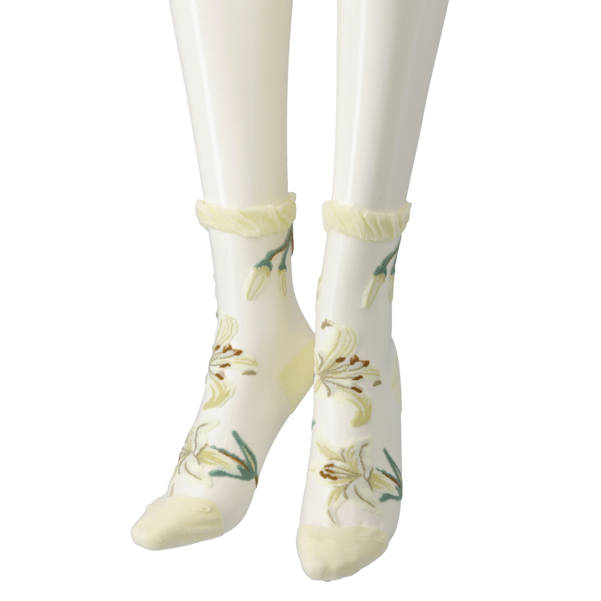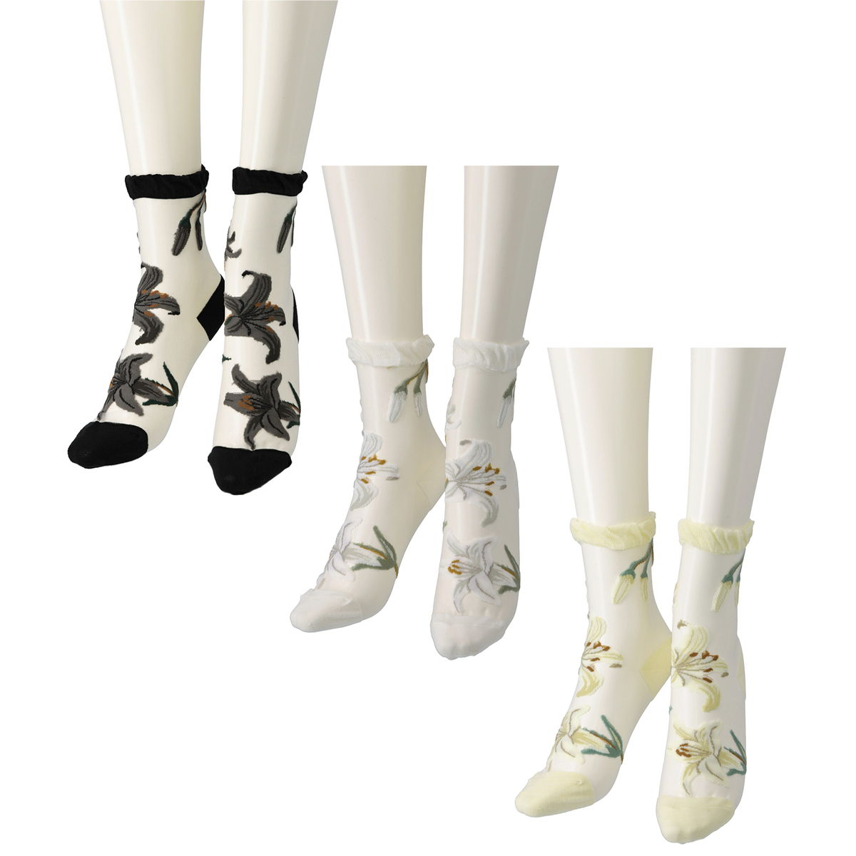 涼しげで軽やかなクリア素材に、5色の色糸でユリ柄を表現したソックス。装いの華やかなポイントになってくれます