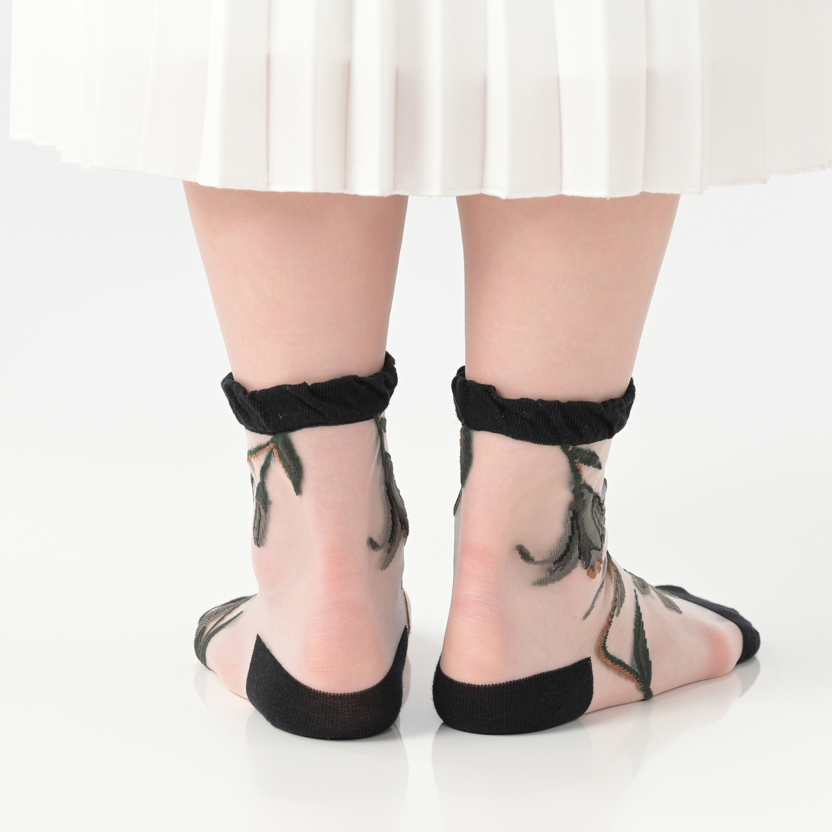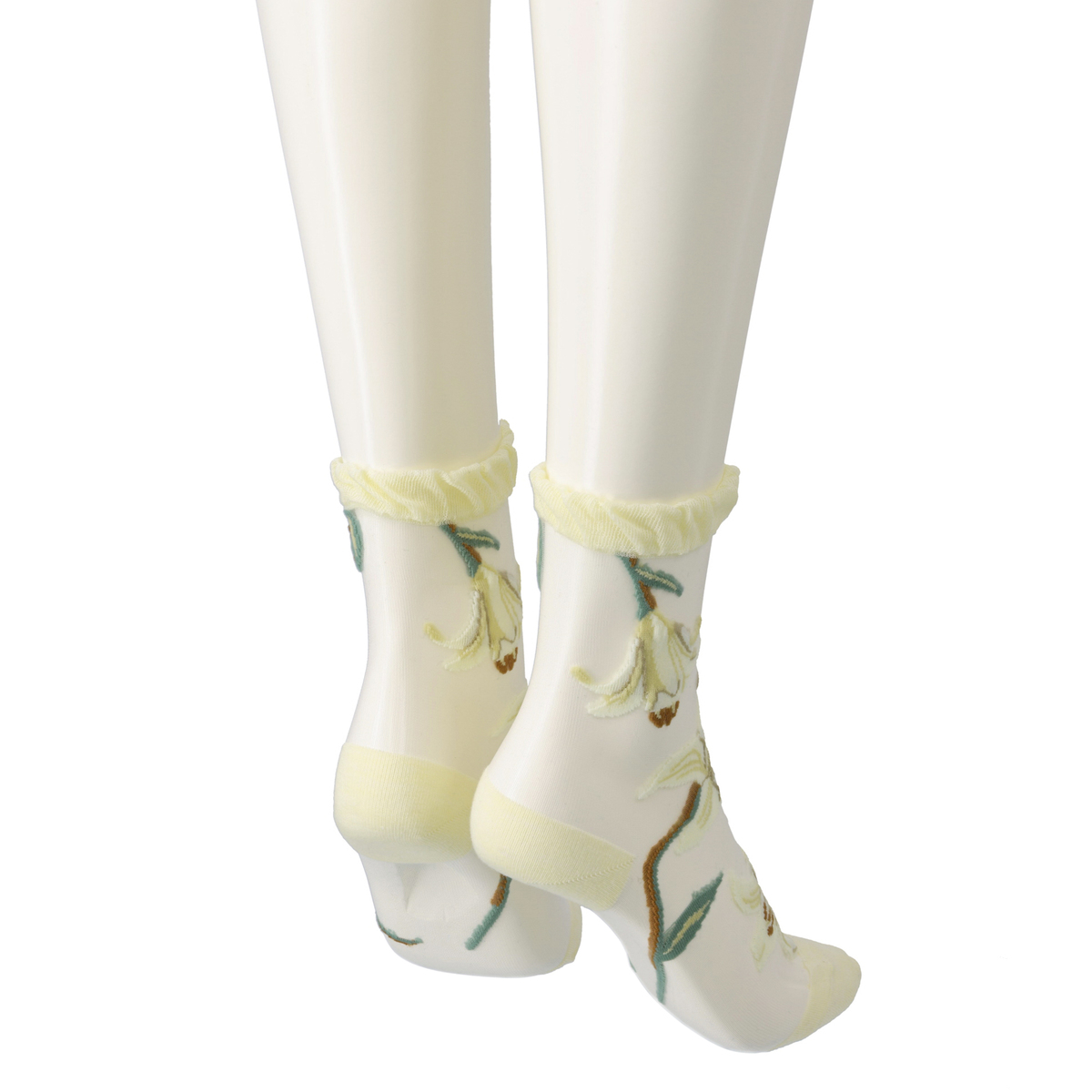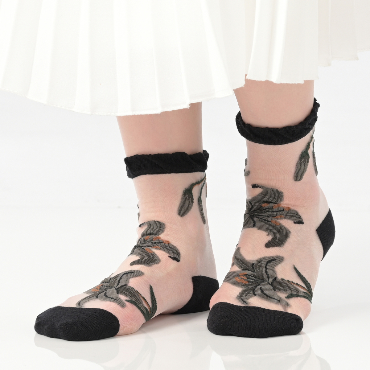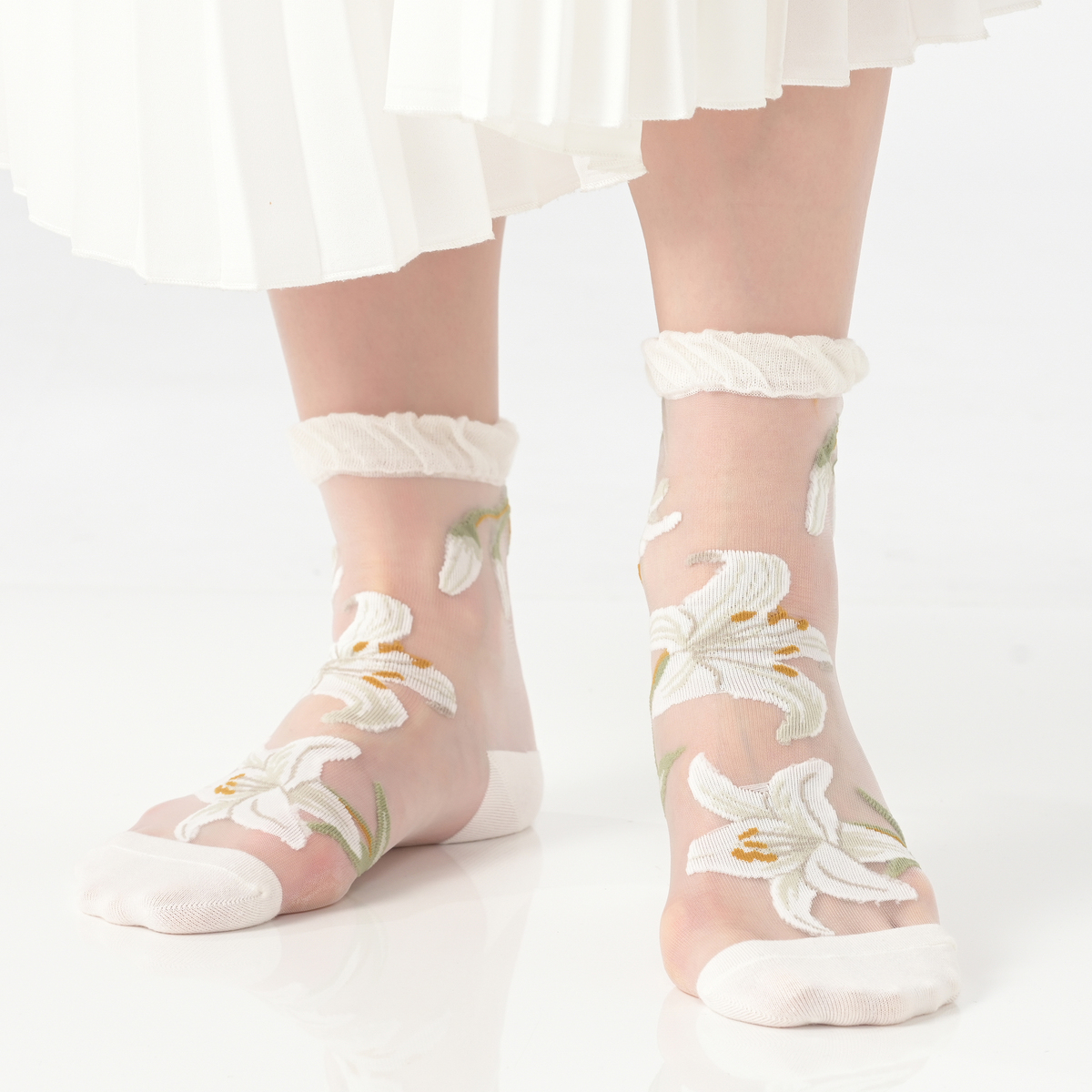 涼しげで軽やかなクリア素材に、5色の色糸でユリ柄を表現したソックス。装いの華やかなポイントになってくれます