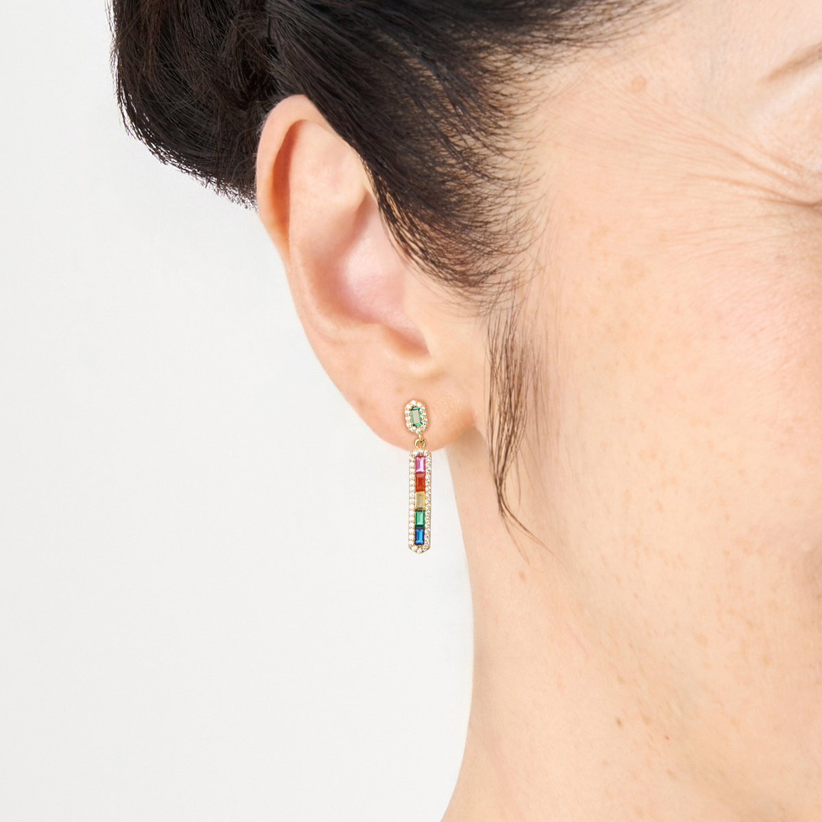 カラフルなキュービックジルコニアを美しく並べた、縦長フォルムのピアス。鮮やかな色彩が耳元を華やかに演出します