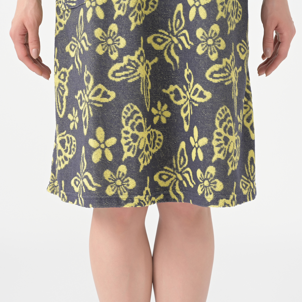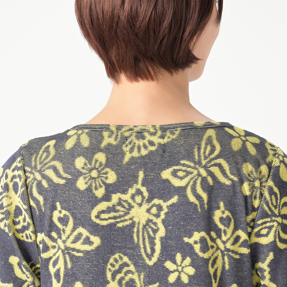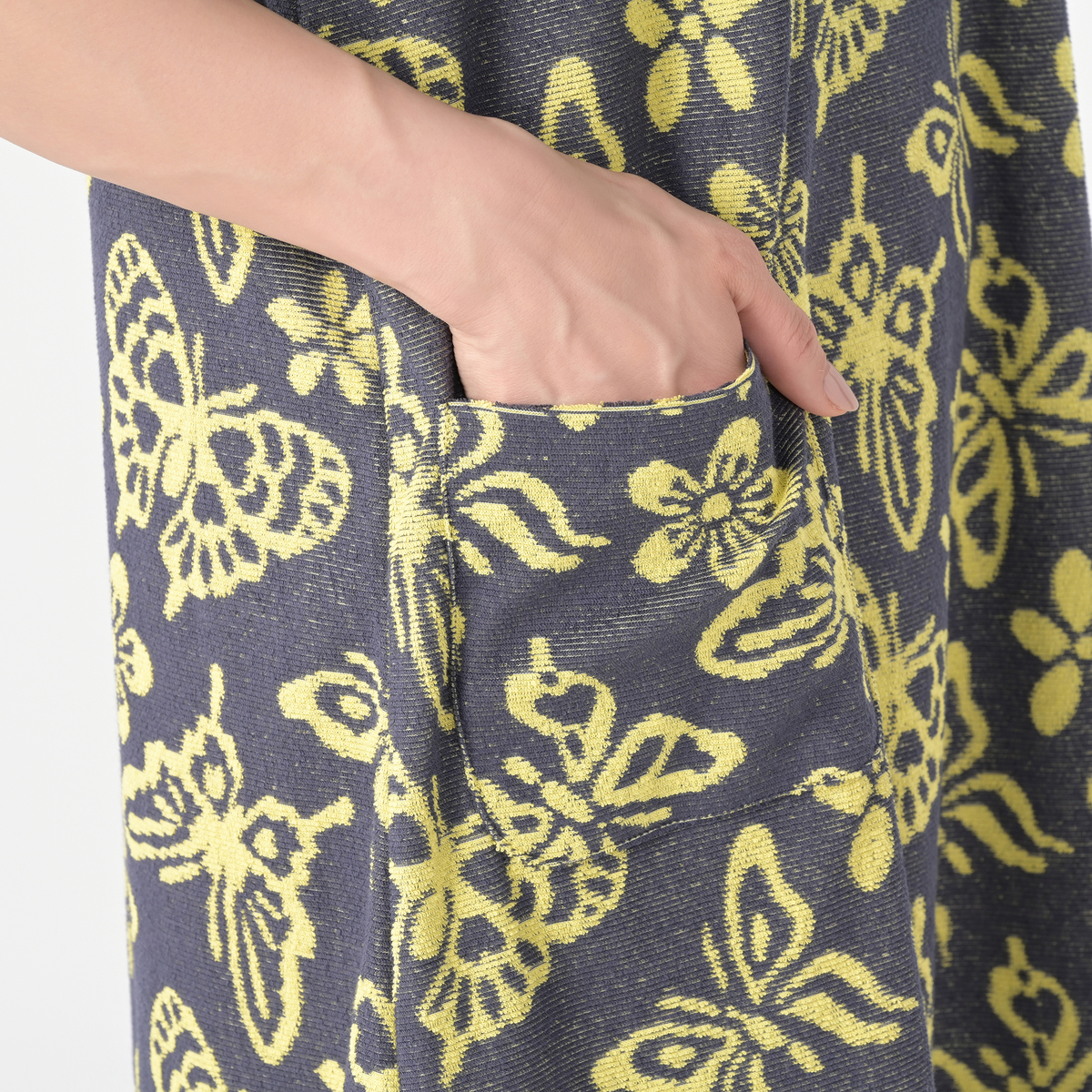 ゆったりしたAラインシルエットのタオルドレス。2000年代のトレンドを再現したレトロなバタフライ柄のデザインです