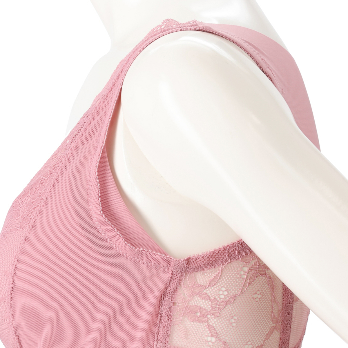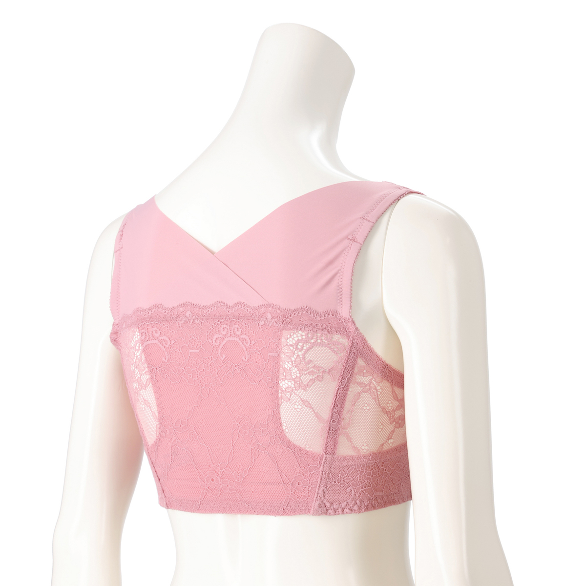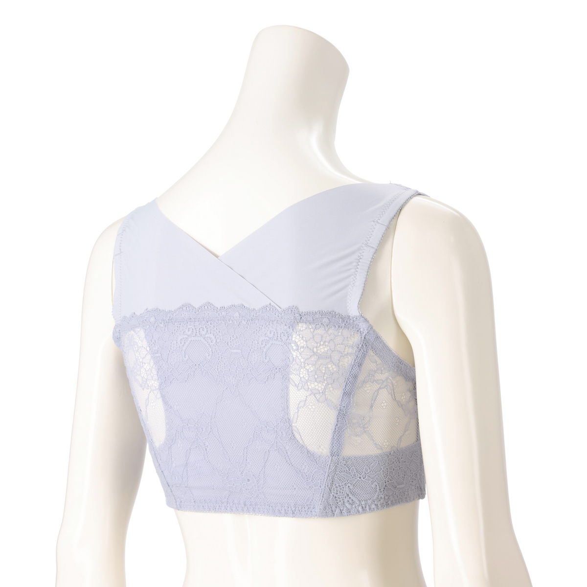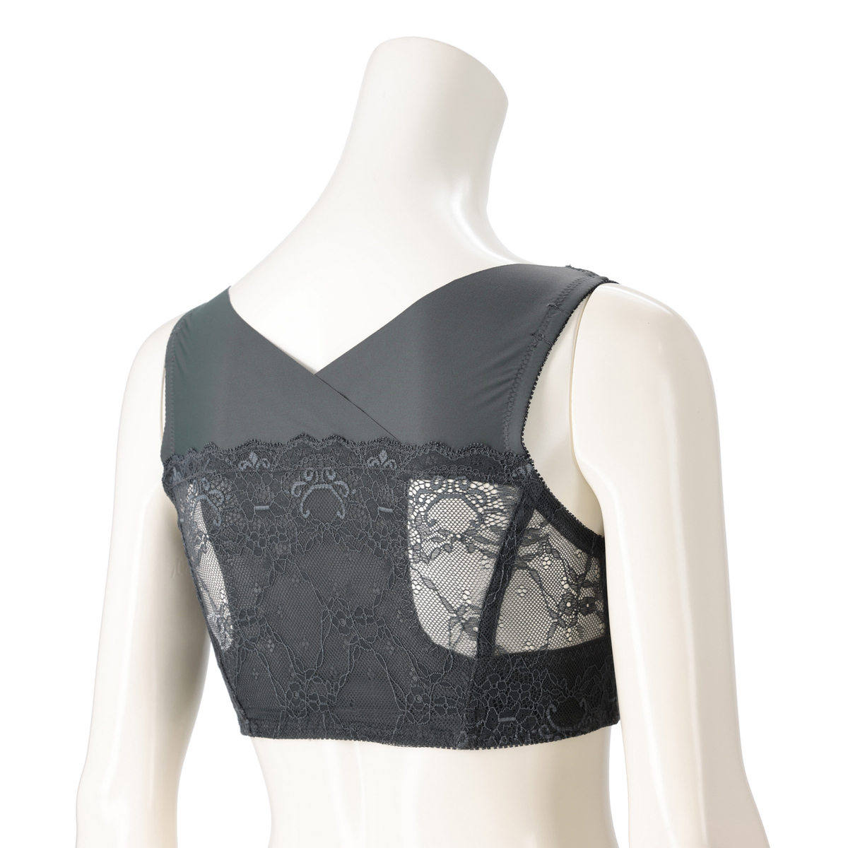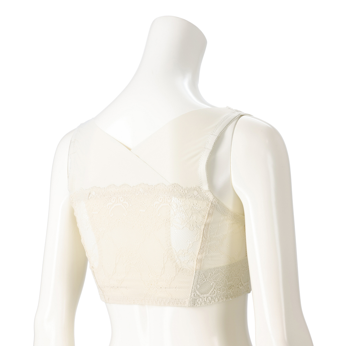 背面はストレッチレースとパワーネットの2枚重ね。背中心のパワーが強くなるように中央にパワーネットを配置しました。レースの上部には伸縮性の高いトリコットをカシュクールでセット。胸も開きやすくなり、深い呼吸をサポートします