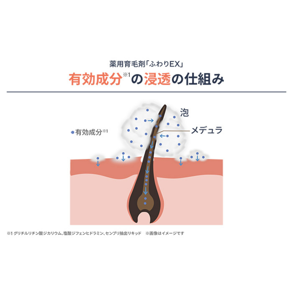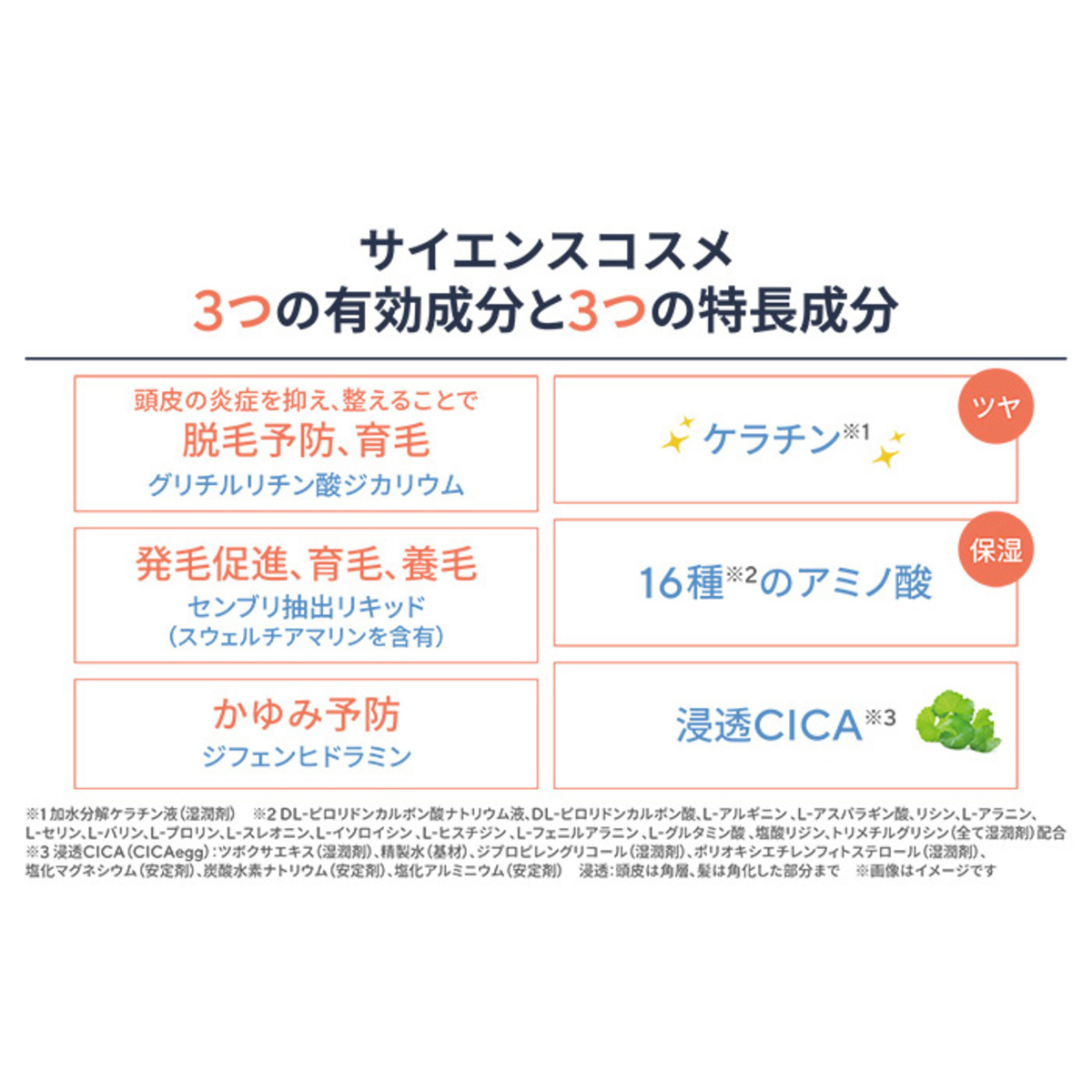 有効成分はグリチルリチン酸ジカリウム、塩酸ジフェンヒドラミン、センブリ抽出リキッド。グリチルリチン酸ジカリウムは、脱毛予防と育毛。ジフェンヒドラミンは、かゆみ予防。センブリ抽出リキッドは発毛促進、毛生促進、育毛、養毛、薄毛。センブリ抽出リキッドにはスウェルチアマリンを含有しています