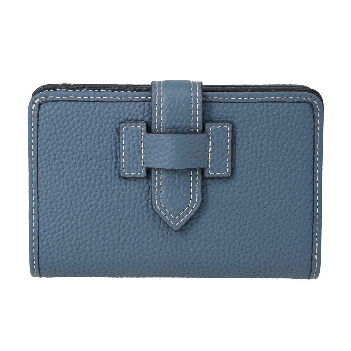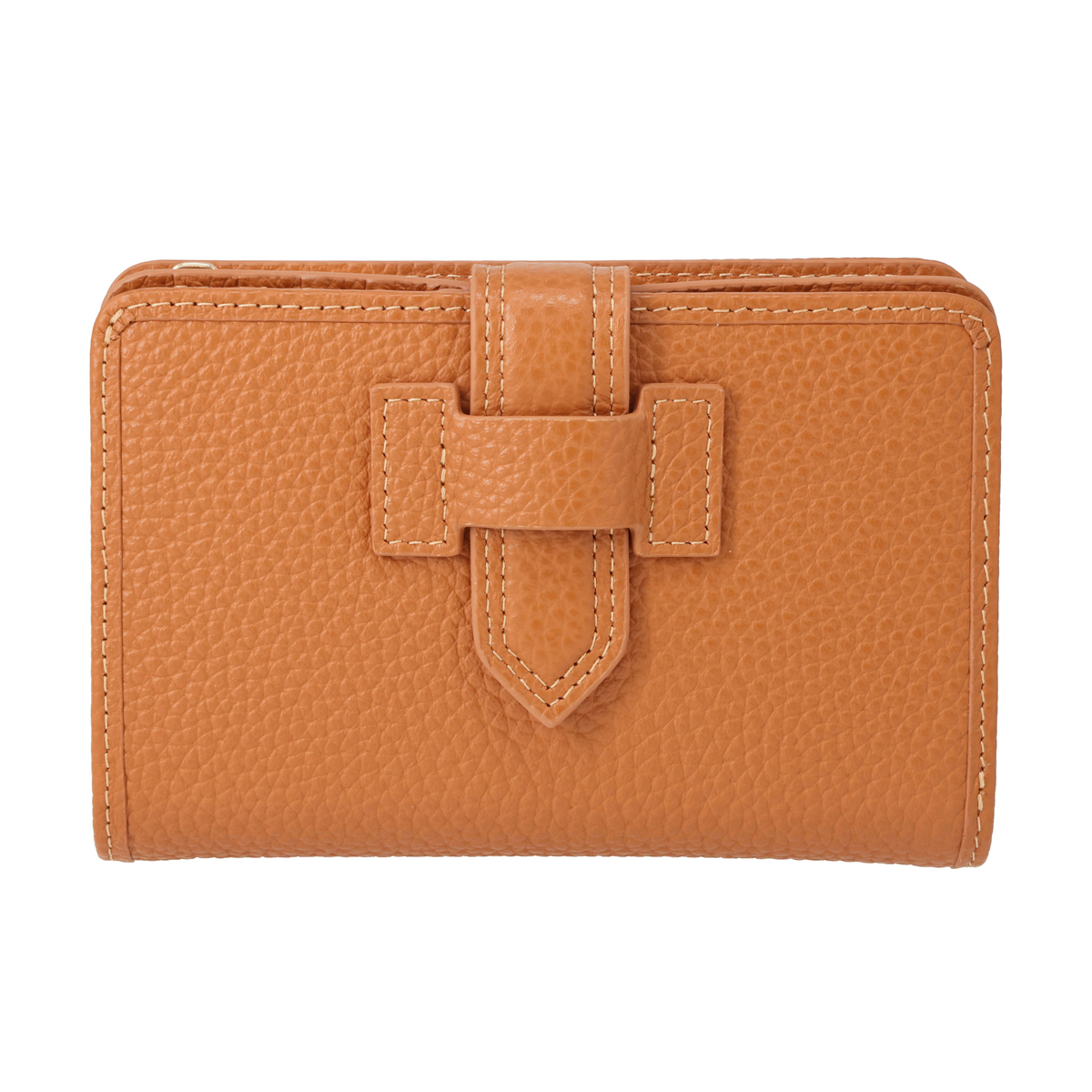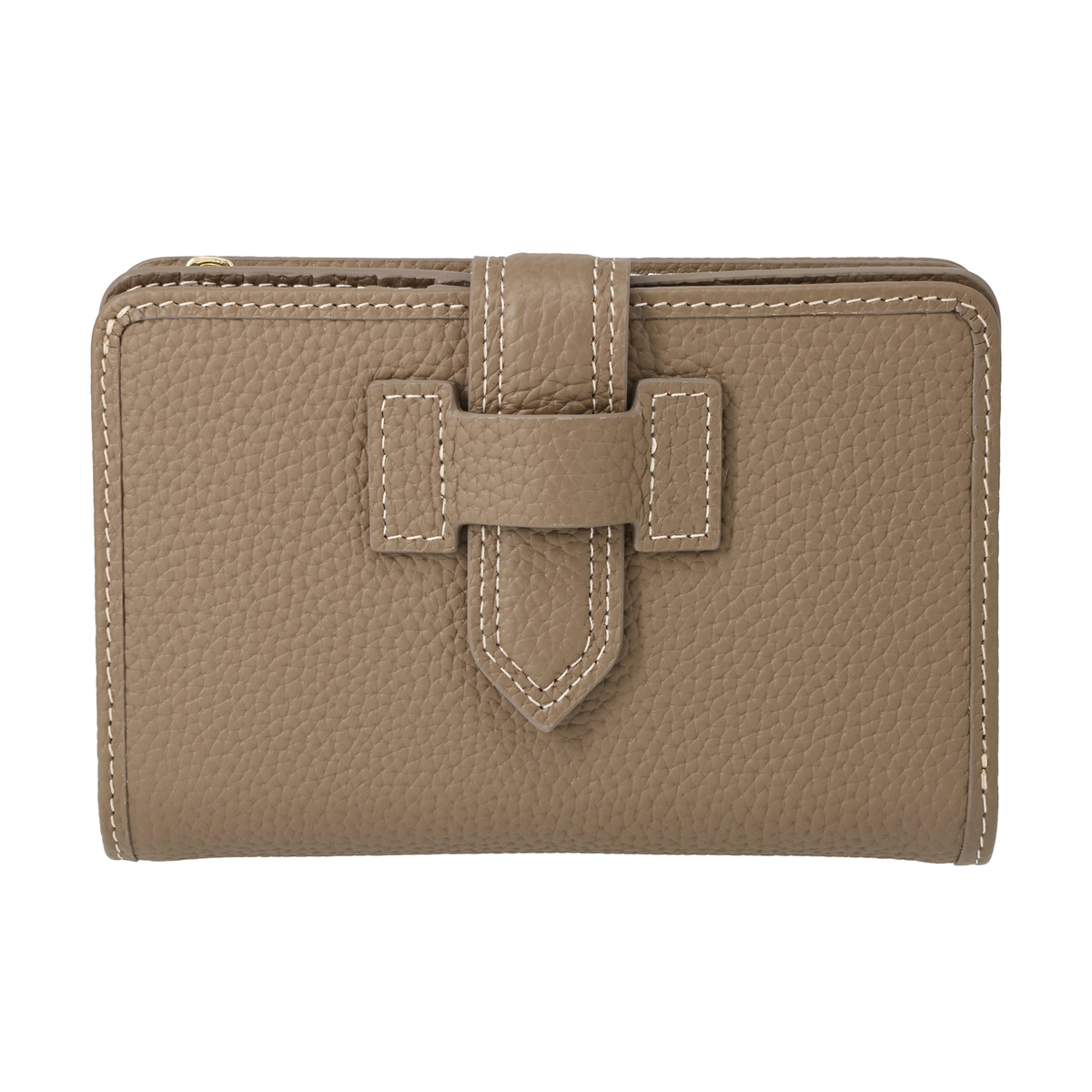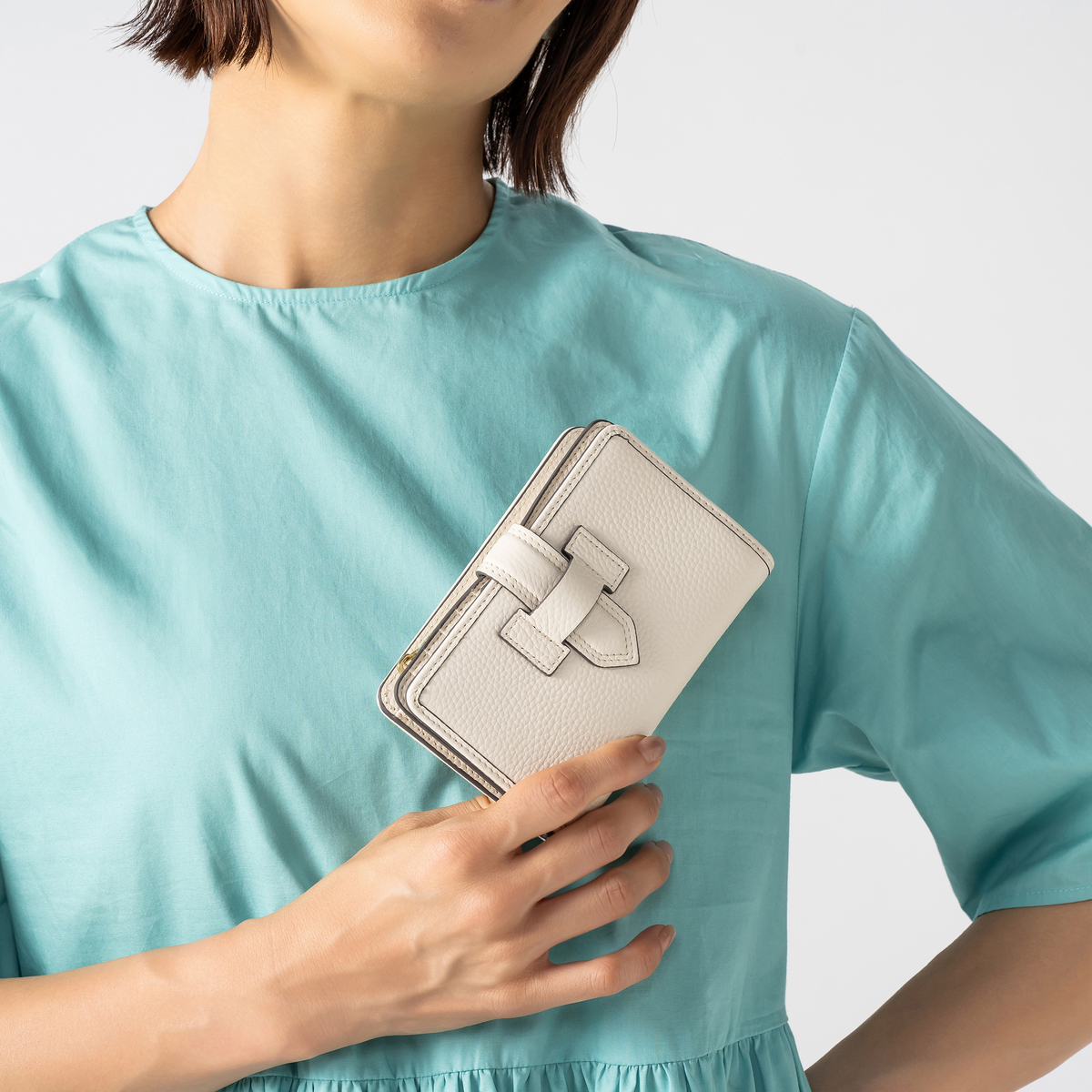 上品なシュリンクレザーを使用したコンパクトウォレットです。表面に凹凸のある質感とベルトデザインが洗練された印象を演出。素材を生かしたつくりで、女性の手にも馴染みやすいサイズ感もポイントです