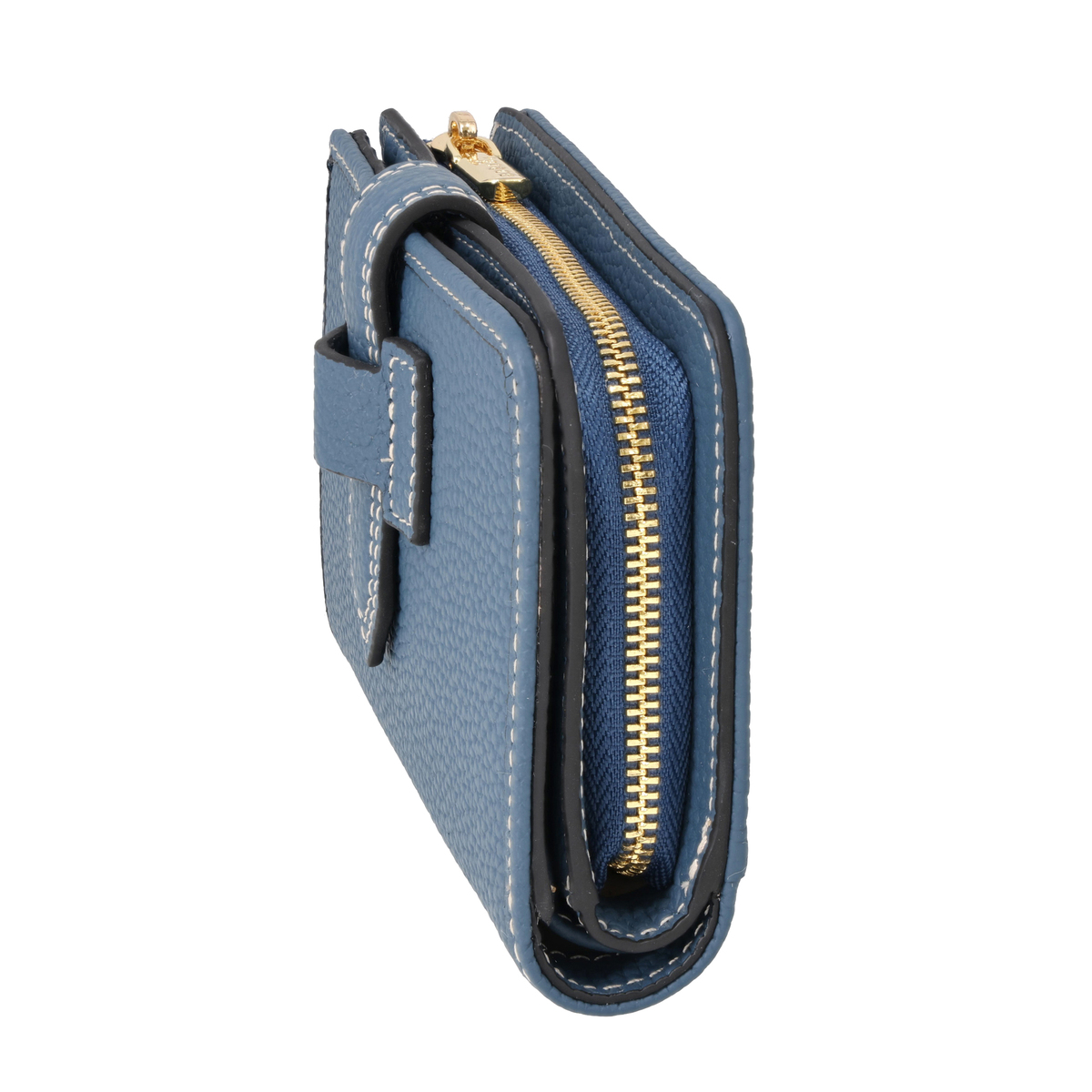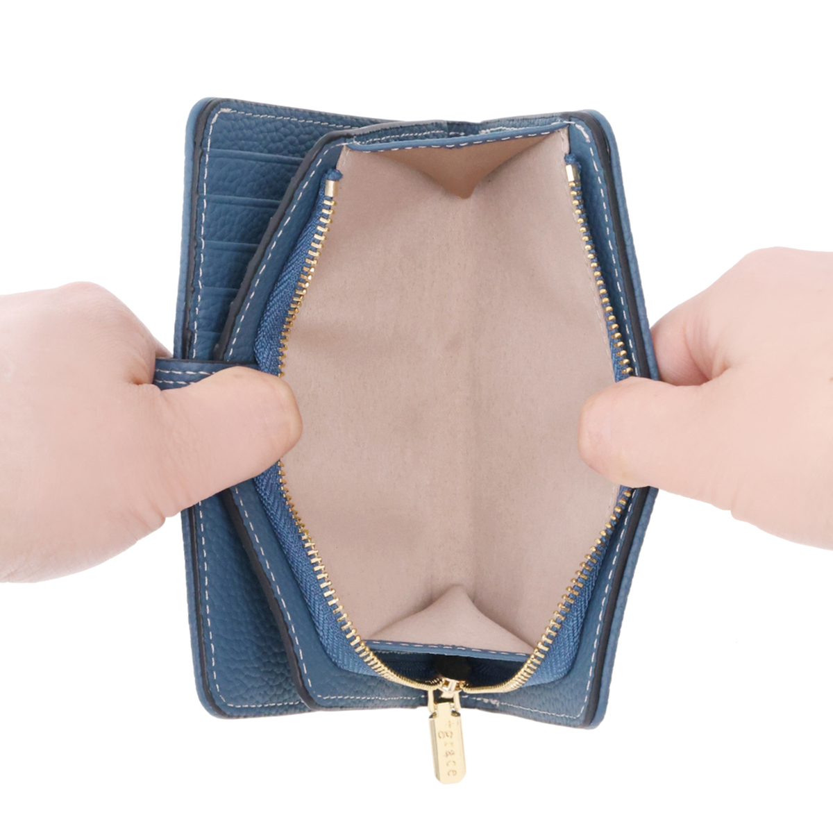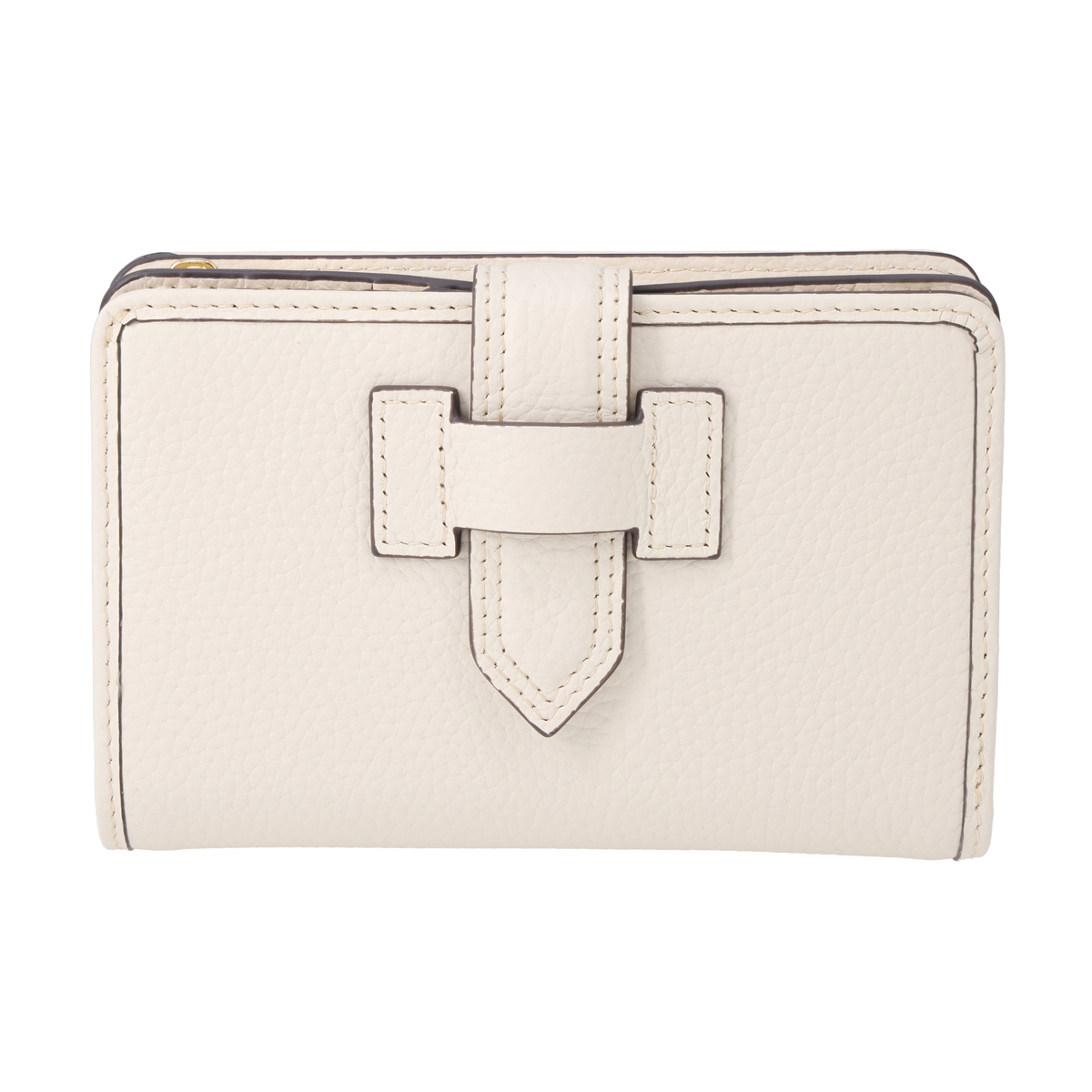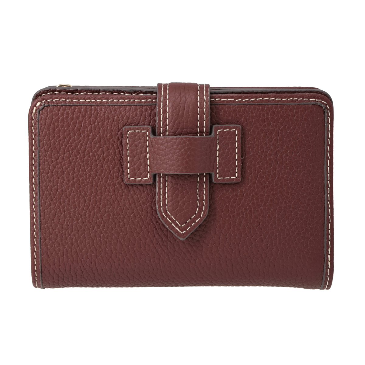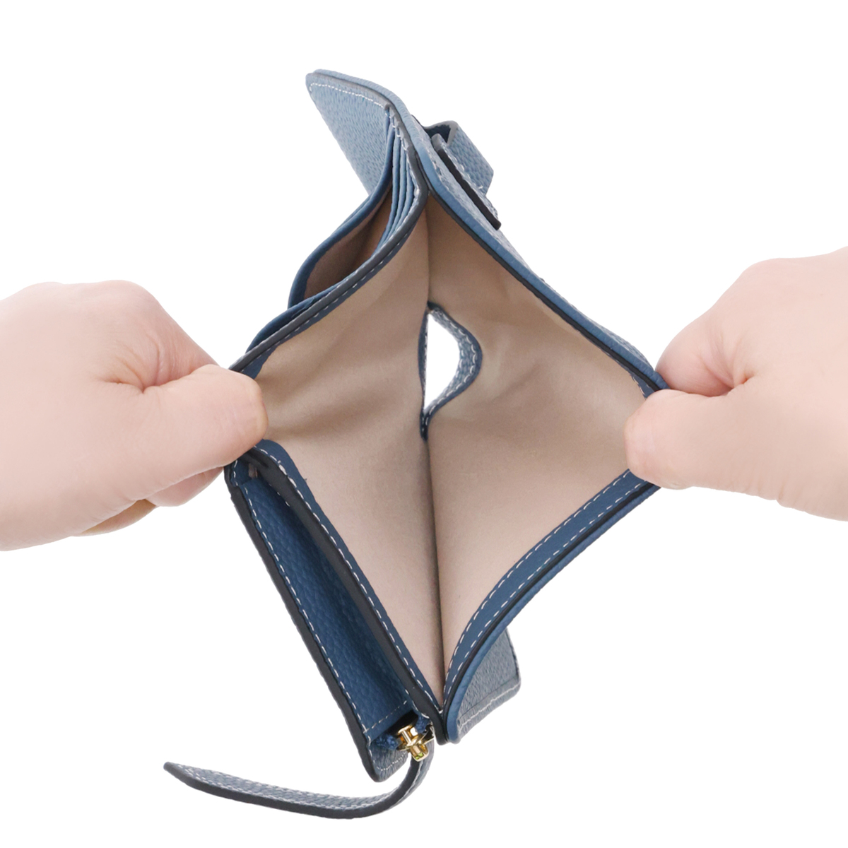 上品なシュリンクレザーを使用したコンパクトウォレットです。表面に凹凸のある質感とベルトデザインが洗練された印象を演出。素材を生かしたつくりで、女性の手にも馴染みやすいサイズ感もポイントです